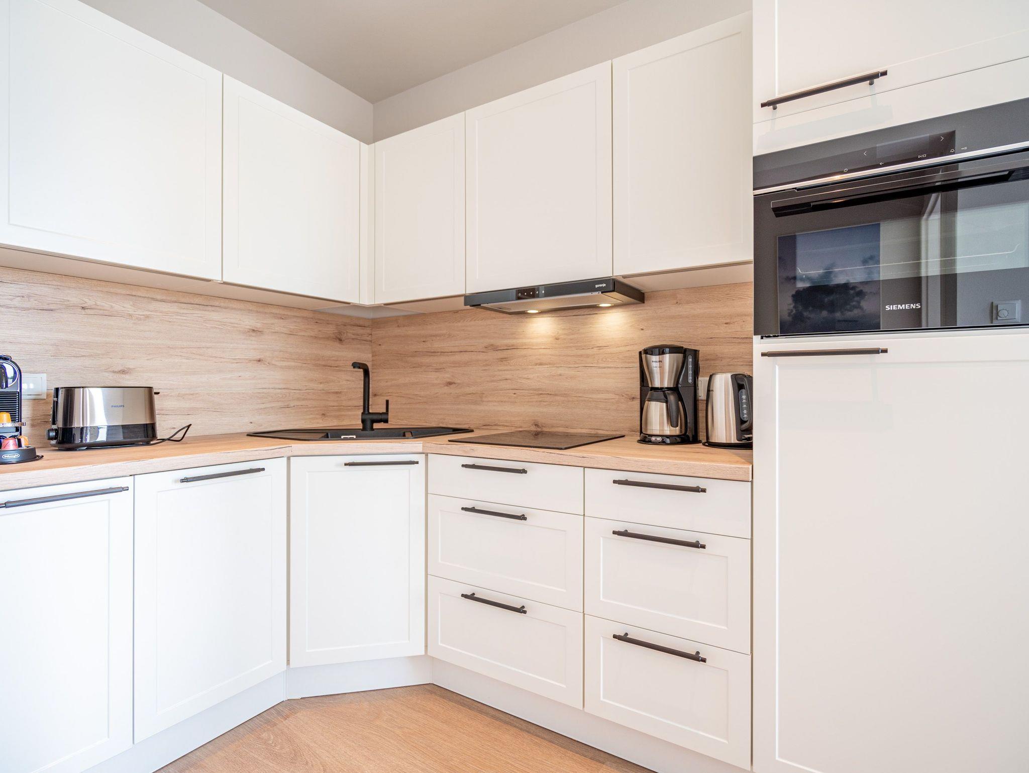 Willkommen im Strandterrasse - Appartement A 3.5 (Haus A). In dieser bezaubernden 2-Zimmer-Ferienwohnung in der 3. Etage werden sich bis zu zwei Gäste vom ersten Moment an pudelwohl fühlen. Denn die Einrichtung des 45 Quadratmeter großen Auszeitdomizils ist einfach zum Wohlfühlen gemacht. Dazu gibt es einen Meerblick, der atemberaubend ist. Der offene Wohnbereich ist nämlich direkt zur Ostsee hin ausgerichtet, so dass Sie aus den bodentiefen Fenstern das Wasser und das Wahrzeichen der Insel, die Ahlbecker Seebrücke, fast von allen Seiten sehen können. Das reicht Ihnen nicht? Dann treten Sie auf einen der beiden Balkone Richtung Osten hinaus und spüren die frische Ostseebrise wahrhaftig im Gesicht. Einen Balkon ausgestattet mit Tisch und zwei Stühlen können Sie vom Wohnzimmer aus betreten, den anderen von Ihrem Schlafzimmer aus. Hier lädt eine Gartenliege zum Sonnenbaden ein. Doch auch, wenn es einmal gar nicht nach draußen gehen soll, bietet das Appartement viel Gemütlichkeit. Machen Sie es sich auf der komfortablen Couch vor dem Elektrokamin (ohne Wärmeabgabe) oder dem 50-Zoll-Flachbildfernseher gemütlich. Die moderne Küchenecke ist voll ausgestattet und bietet mit einem Backofen, einem 3-Platten-Induktionskochfeld, einer Spülmaschine und einer Nespresso-Kapselmaschine allen Komfort, den man sich nur wünscht. Ein gemütlicher Essplatz lädt zu gemeinsamen Mahlzeiten ein. Das angrenzende Schlafzimmer lädt mit seinem bequemen Boxspringdoppelbett (1,80m x 2,00m) zu kuscheligen Stunden und erholsamen Träumen ein. Im eigens angefertigten Kleiderschrank und einer geräumigen Kommode ist viel Platz für die Urlaubsgarderobe. Auch aus dem Bett heraus ist Entertainment auf einem 43-Zoll-Flachbildfernseher möglich. Das Bad ist mit Dusche, Waschtisch und WC Ihre ganz persönliche Frischeoase. In der Tiefgarage steht Ihnen ein reservierter PKW-Stellplatz zur Verfügung. Kommen Sie also in aller Ruhe an und vergessen in diesem charmanten Appartement für ein paar Tage die Hektik der Welt.