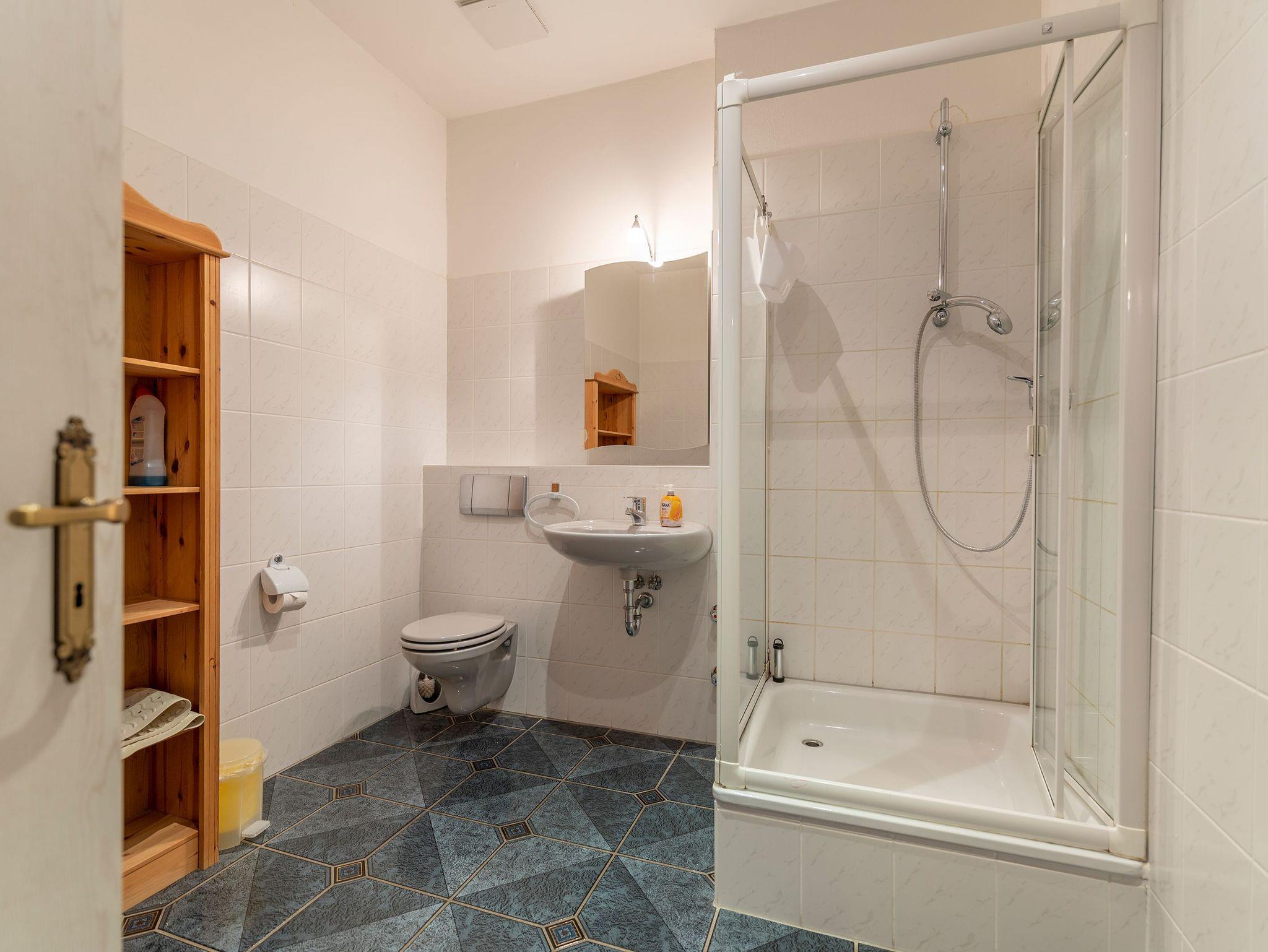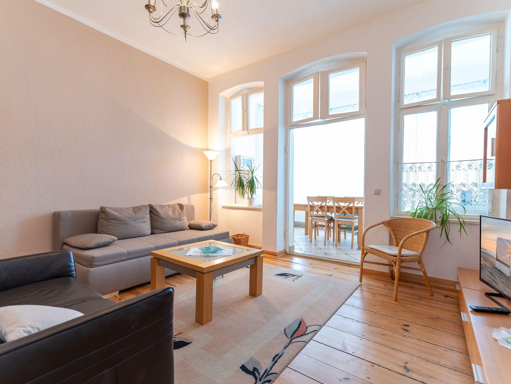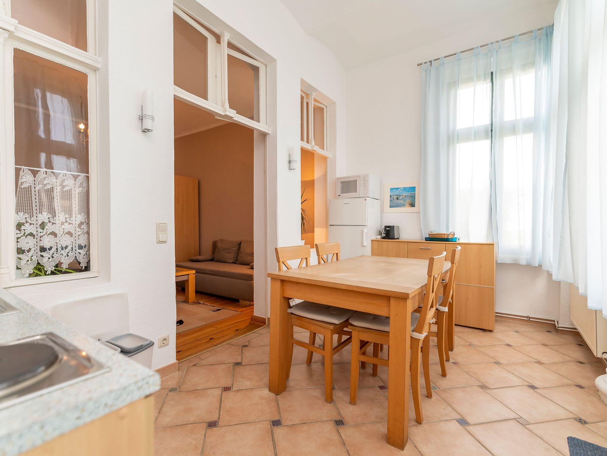 Die Wohnung TOSCANA ist die größte Wohnung in der Villa Krause. Sie besteht aus einem Schlafzimmer mit Boxspringbett, einem Wohnzimmer mit Schlafcouch und zusätzlicher Sitzgarnitur, einem großen Badezimmer und einer Küche mit Essbereich