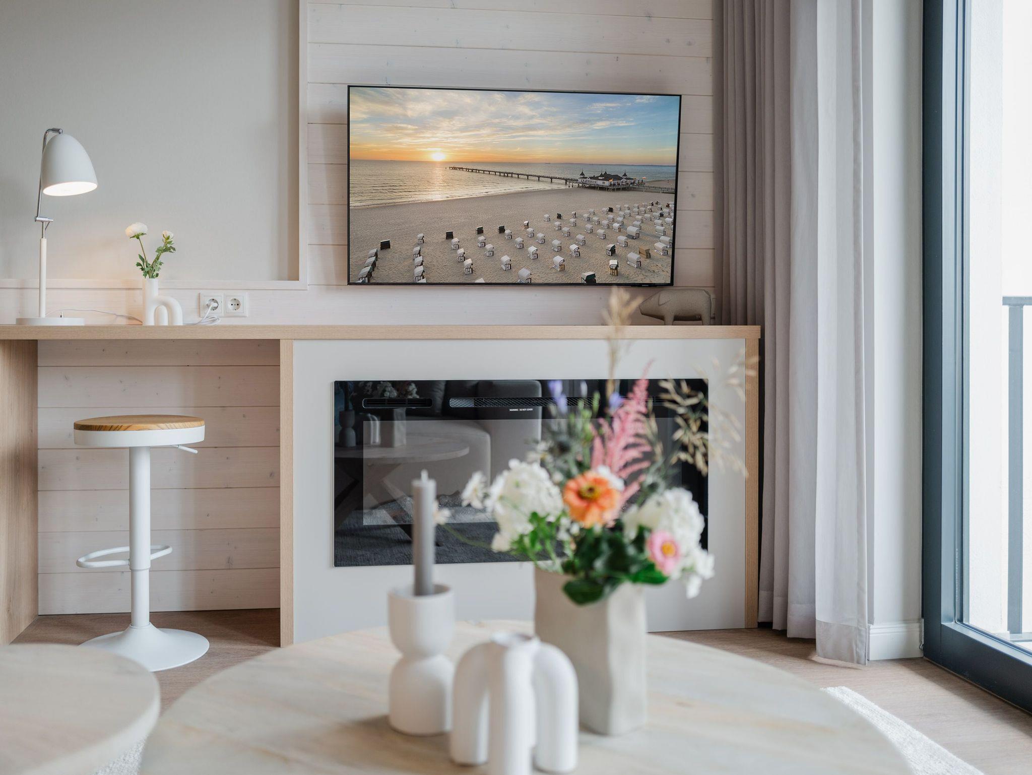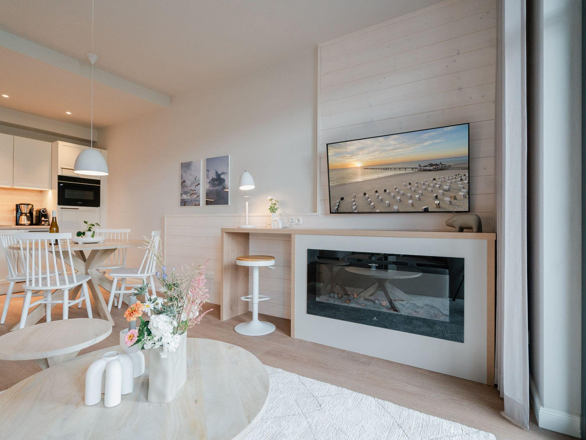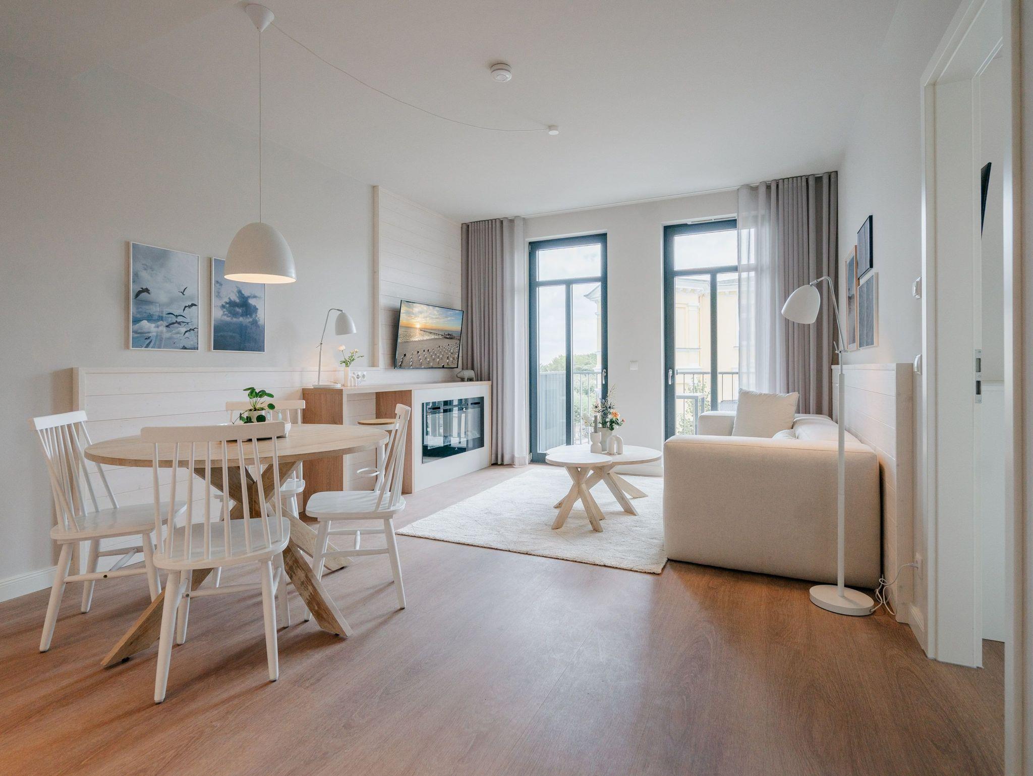 Dieses lichtdurchflutete und gemütliche 2-Raum-Appartement A2.5 mit Meerblick macht entspannte Urlaubsträume wahr. Es befindet sich im 2. Obergeschoss des Hauses A. Die Ostsee mit allen Sinnen genießen, das können bis zu zwei Personen in diesem 50 Quadratmeter großen Wohntraum. Edel und hochwertig eingerichtet, wird Ihnen das Wohn-Esszimmer und das komfortable Schlafzimmer zu einer unvergesslich schönen Auszeit verhelfen. Und das, nur 80 Meter vom Strand entfernt. Einmal aus der Tür fallen und Sie spüren den Strandsand unter den Füßen und die frische Ostseebrise direkt im Gesicht. Doch schon auf den beiden Balkonen Ihres Feriendomizils mit Ost-Ausrichtung können Sie das weite Blau sehen, das nahe Wellenrauschen hören und sich die gesunde Meeresluft um die Nase wehen lassen. Entspannen Sie auf der bequemen Couch bei einem spannenden Film auf dem 50-Zoll-Flachbildfernseher oder beim Blick auf den flackernden Elektrokamin (ohne Wärmeabgabe). Zum großzügigen und doch kuscheligen Wohn-Esszimmer gehören ein schöner Esstisch und eine voll ausgestattete Küchenzeile mit hochwertigen Siemens-Elektrogeräten. Eine Working Station bietet die Möglichkeit, auch während des Urlaubs produktiv zu sein oder ganz nostalgisch den Daheimgebliebenen eine Postkarte zu schreiben. Vom Wohnzimmer aus haben Sie Zugang zum ersten Balkon, während Sie aus dem Schlafzimmer heraus auf den zweiten Balkon an die Luft treten können. Schon einmal einen Sonnenaufgang aus dem Meer gesehen? Hier wird das möglich. Das Schlafzimmer ist mit einem komfortablen Boxspringdoppelbett (1,80m x 2,00m), einem Kleiderschrank und einer Kommode ausgestattet. Hier finden Sie auch einen weiteren 43-Zoll-Flachbildfernseher. Das innenliegende Bad verfügt über eine Dusche, WC und einen Waschtisch. Entspannen können Sie zudem bei wohliger Wärme in der wohnungseigenen Infrarotsauna. Ihnen steht ein PKW-Stellplatz in der Tiefgarage zur Verfügung. Erleben Sie erholsame Tage in der Strandterrasse und lassen Sie sich von dem seitlichen Blick auf die Ostsee und den Annehmlichkeiten dieser komfortablen Ferienwohnung verzaubern. Wir freuen uns darauf, Sie bald bei uns begrüßen zu dürfen!