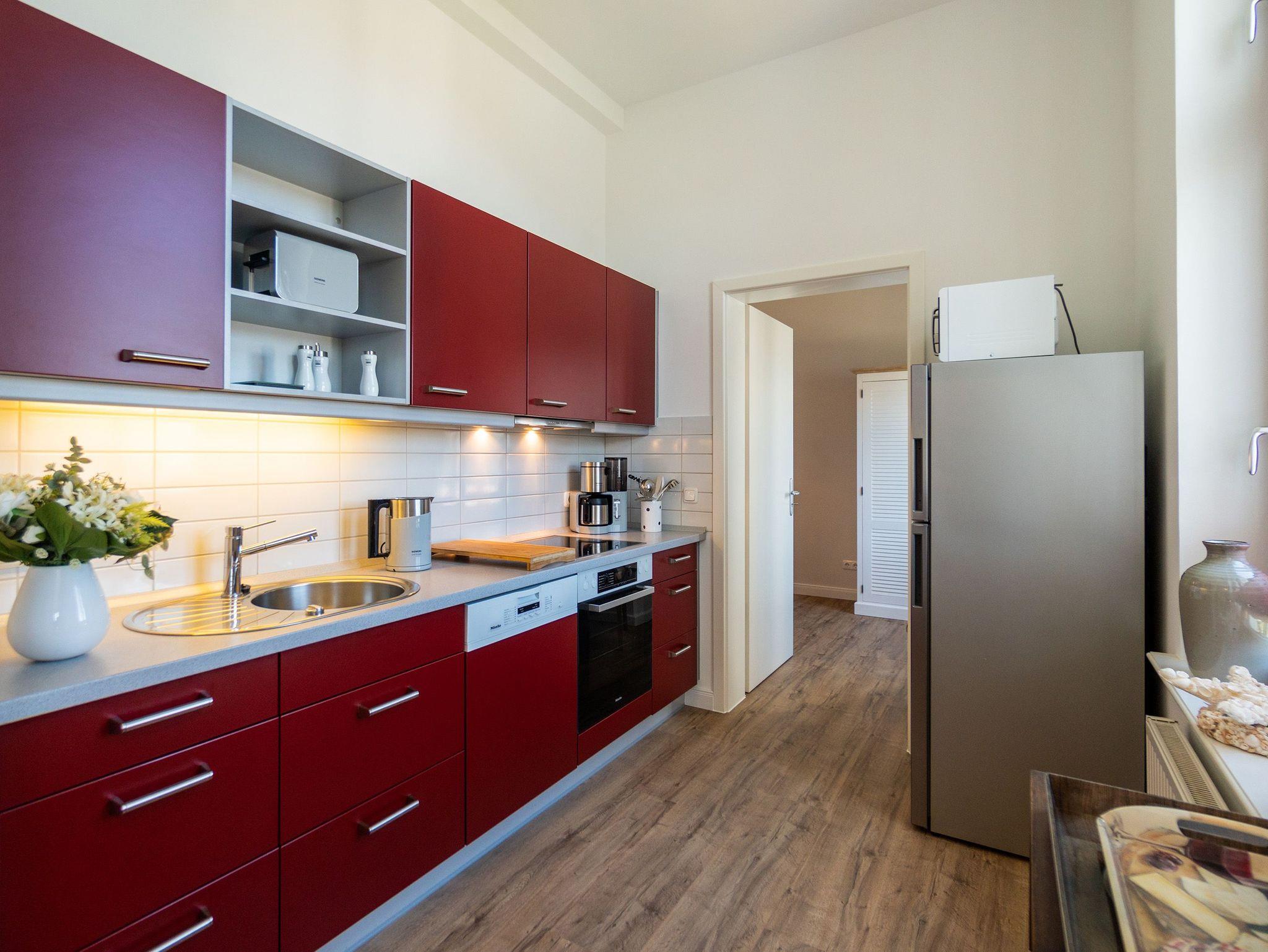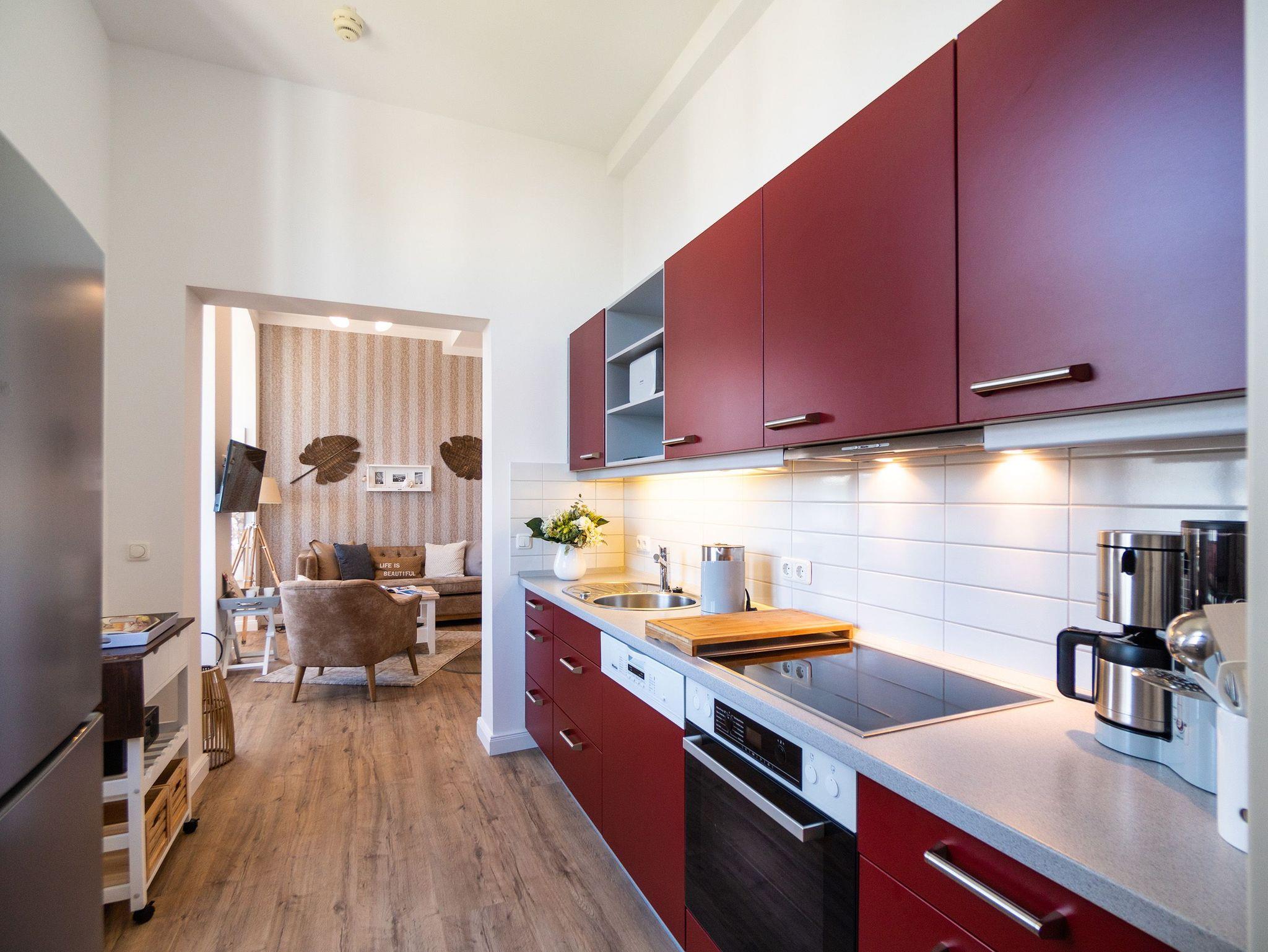 Viel Holz, Naturmaterialien, warme Naturtöne ? das Appartement Nummer 9 im ersten Obergeschoss des Ahlbecker Autorenhauses empfängt Ostseeliebhaber mit urig gemütlichem, maritimem Charme. Von der Naturtapete über die rustikalen und stylischen Möbel bis hin zu den Accessoires ? in diesem Urlaubsdomizil ist alles auf die wunderschöne Ostseelandschaft ausgerichtet. Die Liebe steckt in den vielen kleinen Details. Lassen Sie sich fallen und genießen Sie das entspannende Gefühl von viel Licht und Leichtigkeit. Die hohen Decken der alten Bädervilla lassen tief atmen und geben dem Freiheitsgefühl viel Raum. Benannt nach dem deutschen Schriftsteller Alfred Döblin, hätte dieses Ostseeparadies dem bekannten Essayisten während einer Auszeit am Meer ganz sicher jede Menge Inspiration für neue Werke gegeben. In dieser Wohnung trifft auf wunderbare Weise Alt auf Neu. Die drei Zimmer bieten Platz für vier Erwachsene und ein Kleinkind. Auf Wunsch kann für unsere kleinen Gäste ein Kinderreisebett (ohne zusätzliche Matratze [&] Bettzeug) und ein Kinderhochstuhl (gegen einen Aufpreis) zur Verfügung gestellt werden. Ganz besonders gemütlich wird es beim kuscheligen Beisammensitzen im Wohnzimmer vor dem Kaminofen. Für Unterhaltung sorgt der große Flat-TV. Die Küche ist offen. Vollausgestattet eignet sie sich sogar für kulinarische Meisterleistungen. Sie ist mit sämtlichen Geräten und Geschirr versehen. Essen können Sie im ebenfalls zum Wohnzimmer hin offenen Erker. Lichtdurchflutet, da von drei Seiten mit hohen Fenstern versehen, beginnt hier der Urlaub schon morgens perfekt. Von hier haben Sie uneingeschränkten Blick aufs Meer. Und nach Osten ausgerichtet scheint hier die Sonne auf den Frühstückstisch. Machen Sie die Fenster des Erkers weit auf und lassen Sie das Ostseerauschen in Ihr Appartement. Gebettet sind Sie in der Nummer 9 auf himmlisch komfortablen Boxspringdoppelbetten ( 1,80 m x 2,00 m). Jedes der beiden Schlafzimmer ist darüber hinaus mit einem Schrank und einem Flat-TV ausgestattet. Das Badezimmer ist geräumig. Ganz besonders die schöne Regendusche. Außerdem verfügt das Bad über einen Waschtisch und ein WC. In der Wohnung gibt es kostenfreies WLAN. Bei Anreise sind Ihre Betten bezogen und Handtücher liegen bereit. Falls Sie Ihre Wäsche einmal waschen wollen, steht dafür im Keller des Hauses eine Waschmaschine und ein Trockner zur Verfügung. Gegen eine Gebühr können Sie diese nutzen. Für Ihren Pkw steht Ihnen in der hauseigenen Tiefgarage ein fester Stellplatz zur Verfügung. Besonders praktisch: Für Gäste mit E-Auto steht eine gemeinschaftliche Lademöglichkeit in der Tiefgarage zur Verfügung (wird von vier Wohneinheiten genutzt). Die Abrechnung erfolgt bequem über eine Ladekarte eines bekannten Anbieters oder per Kreditkarte.