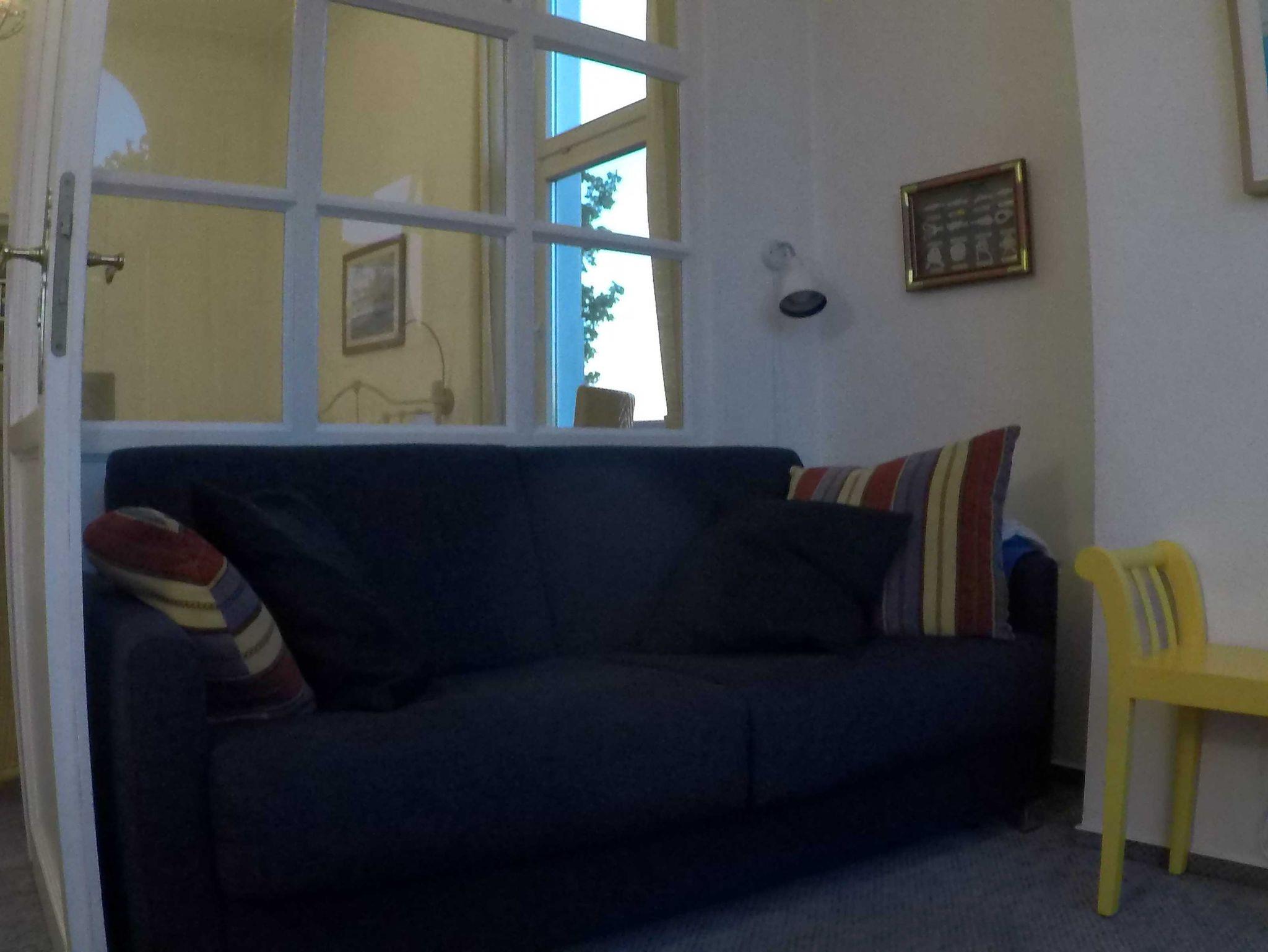 Das Schlafzimmer mit Doppelbett ist durch eine Glaswand vom Wohnbereich mit Doppelschlafcouch getrennt. Die Wohnung ist ideal für 2 Personen, aber mit Aufbettung auch für 4 Personen geeignet.