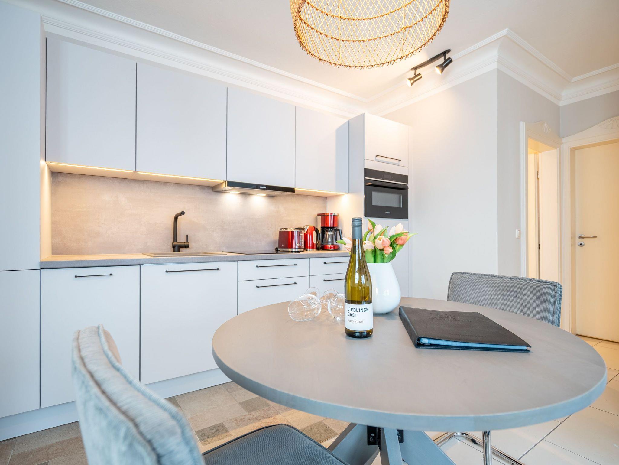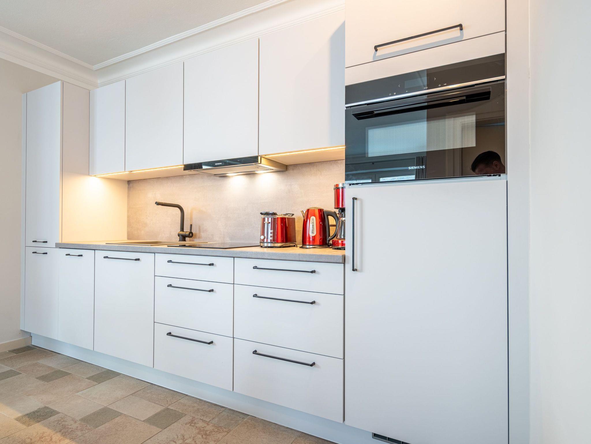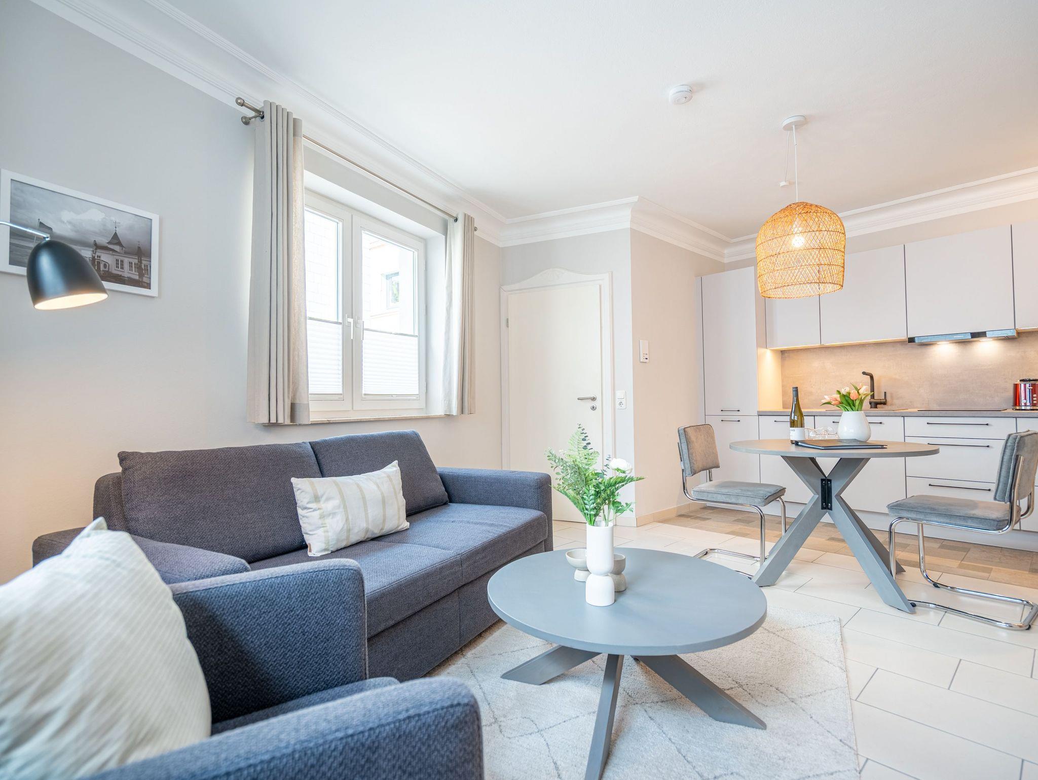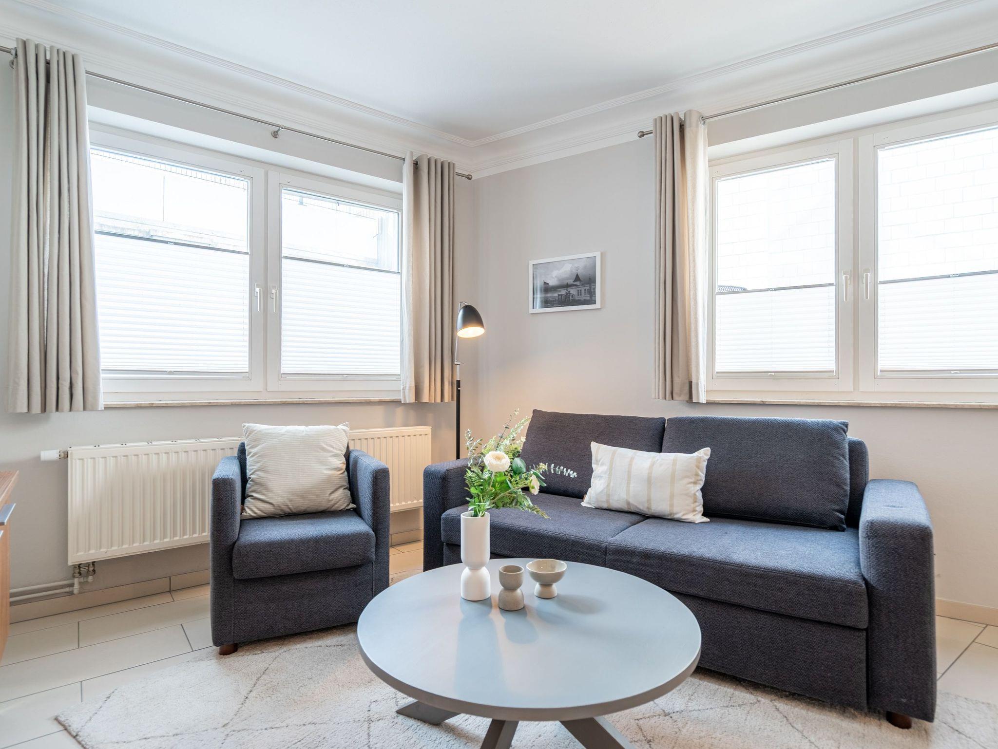 Willkommen in der 2-Raum-Ferienwohnung Nr. C01 im Untergeschoss der Villa Seedüwel, die mit ihren 41 m² ideal für 2 Personen geeignet ist. Die Wohnung verfügt über eine Terrasse im Innenhof und bietet Ihnen einen privaten Zugang von der Tiefgarage direkt durch den hauseigenen Fahrradkeller. Über eine Außentreppe erreichen Sie bequem die nahegelegene Promenade. Der offen gestaltete Wohnbereich lädt mit einer gemütlichen Sitzgruppe und einem Flat-TV zum Entspannen ein. Die voll ausgestattete Küchenzeile verfügt über ein Induktionskochfeld, eine Mikrowelle, einen Kühlschrank mit Gefrierfach und alles, was Sie für die Zubereitung Ihrer Lieblingsgerichte benötigen. Der Essplatz für zwei Personen ergänzt den Wohnbereich. Das separate Schlafzimmer ist mit einem komfortablen Doppelbett (1,80m x 2,00m) und einem geräumigen Kleiderschrank ausgestattet. Ein modernes Bad mit Dusche und Waschtisch sowie ein separates WC sorgen für zusätzlichen Komfort. Ihr Fahrzeug können Sie bequem auf dem dazugehörigen Stellplatz in der Tiefgarage der Strandterrasse parken.