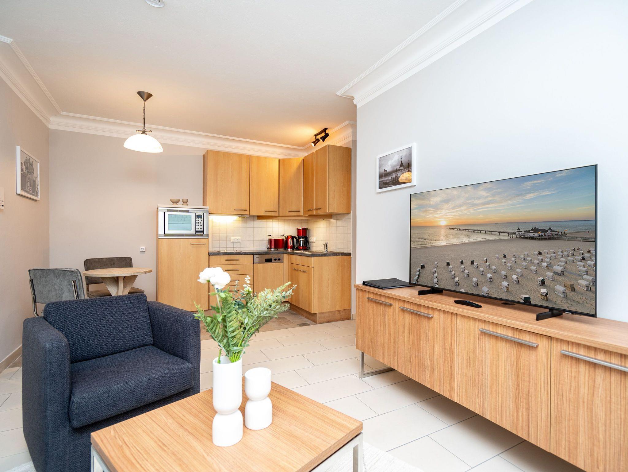 Moderne 2-Raum-Ferienwohnung mit Terrasse und Tiefgaragenstellplatz nahe der Ahlbecker Seebrücke.