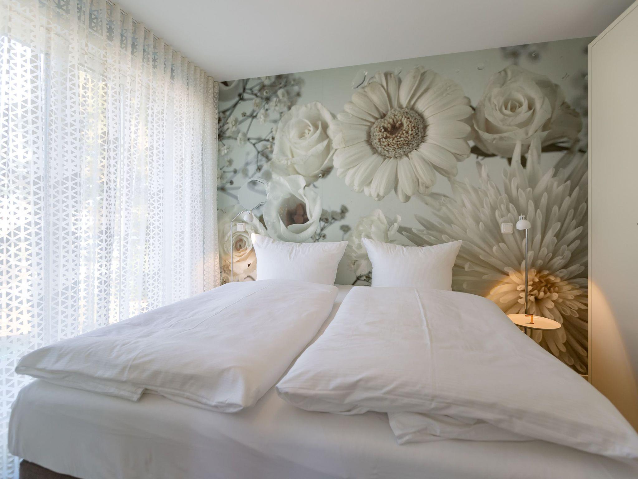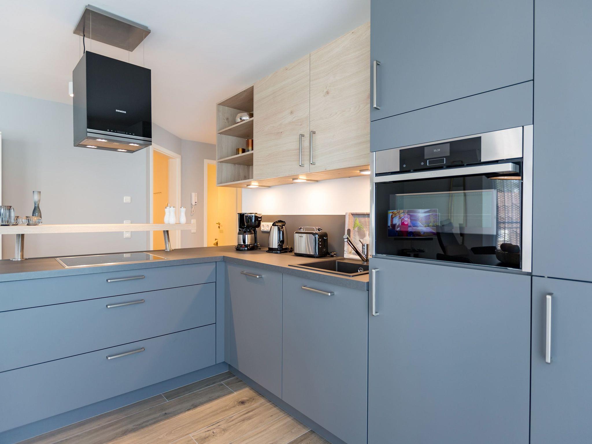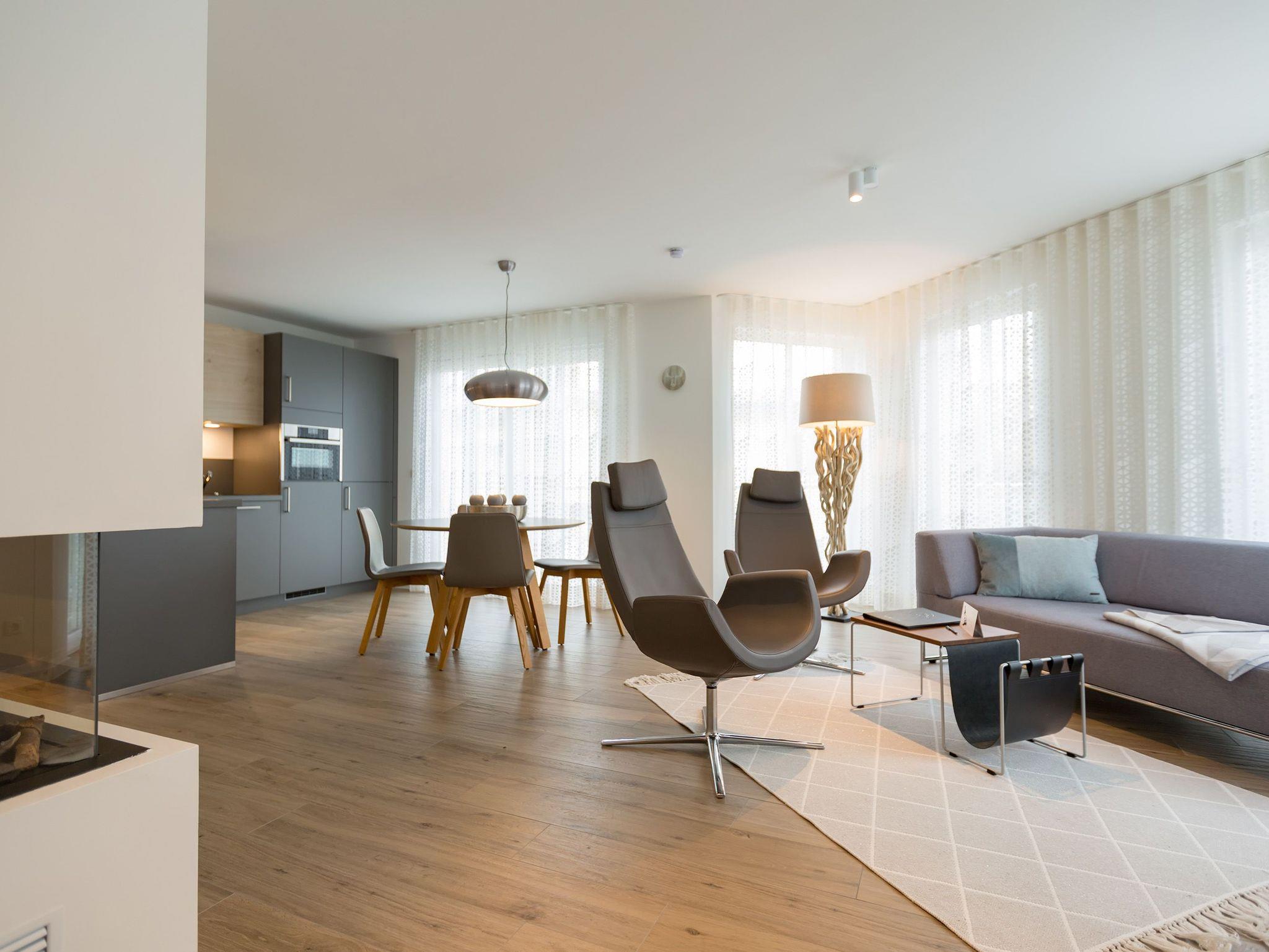 Drei Balkone ? mehr geht nicht an frischer Ostseeluft. Die liegt unmittelbar in Sichtweite. Dieses moderne und stylische Urlaubsparadies verwöhnt seine Gäste mit allem Komfort und macht den Urlaub zu einer exklusiven Ostsee-Auszeit. Meeresrauschen inklusive. Genießen Sie die Sonne und die frische Brise auf einem der Balkone (1 x 2,5 Quadratmeter Richtung Südost [&] 1 x 5,2 Quadratmeter Richtung Nord [&] 1 x 20,7 Quadratmeter Richtung Nordwest), die umlaufend miteinander verbunden sind. Relaxen Sie auf der bequemen Couch im großen, offenen und lichtdurchfluteten Wohnzimmer mit Essplatz und Highend-Küche. Hier bleiben keine Wünsche offen. Ein wunderschöner Gas-Kamin sorgt an kühlen Abenden für eine kuschelige Atmosphäre auf Knopfdruck. Der große Flat-TV ist ein echter Entertainer. In den Beetle-Ledersesseln fühlen Sie sich wie der Captain Ihres eigenen Raumschiffes. Sie bieten höchsten Sitzkomfort in Kombination mit anspruchsvollem Design. Die große Stehlampe aus Treibholz verleiht dem Appartement, in dem vier Personen und ein Kleinkind (im Kinderreisebett) wunderbar entspannen können, einen echt maritimen Charakter. Nordish by nature und ganz besonders elegant ist der schöne Essplatz mit Tisch und vier Stühlen. Die offene Küche hat viel Platz und ist mit allen nötigen Geräten und edlem Asa-Geschirr ausgestattet. Auf den 68 Quadratmetern befinden sich zwei gemütliche Schlafzimmer mit Boxspringdoppelbetten (1,80 m x 2,00 m) für höchsten Schlafkomfort, großen und geräumigen Schränken und jeweils einem Flat-TV. Lieben Sie das wunderbar entspannende Gefühl nach einer Sauna? Dann können Sie sich in dieser Wohnung auf Ihre eigene kleine Wellness-Oase freuen. Denn das Badezimmer wartet mit einer Finnischen Sauna auf. Erfrischen Sie sich anschließend unter der tropischen Regendusche. Im Bad gibt es außerdem einen Waschtisch und ein WC. Ein separates Gäste-WC geht vom Wohnungsflur ab. Alles, was stresst können Sie hier getrost draußen lassen. Darum haben wir für Sie die Betten bereits bei Anreise bezogen und Handtücher liegen bereit. Das WLAN ist kostenfrei. Am Haus gibt es einen überdachten (max. Höhe 2,10 m) Pkw-Stellplatz. Zur Wohnung gehört zudem ein eigener Fahrradabstellraum.