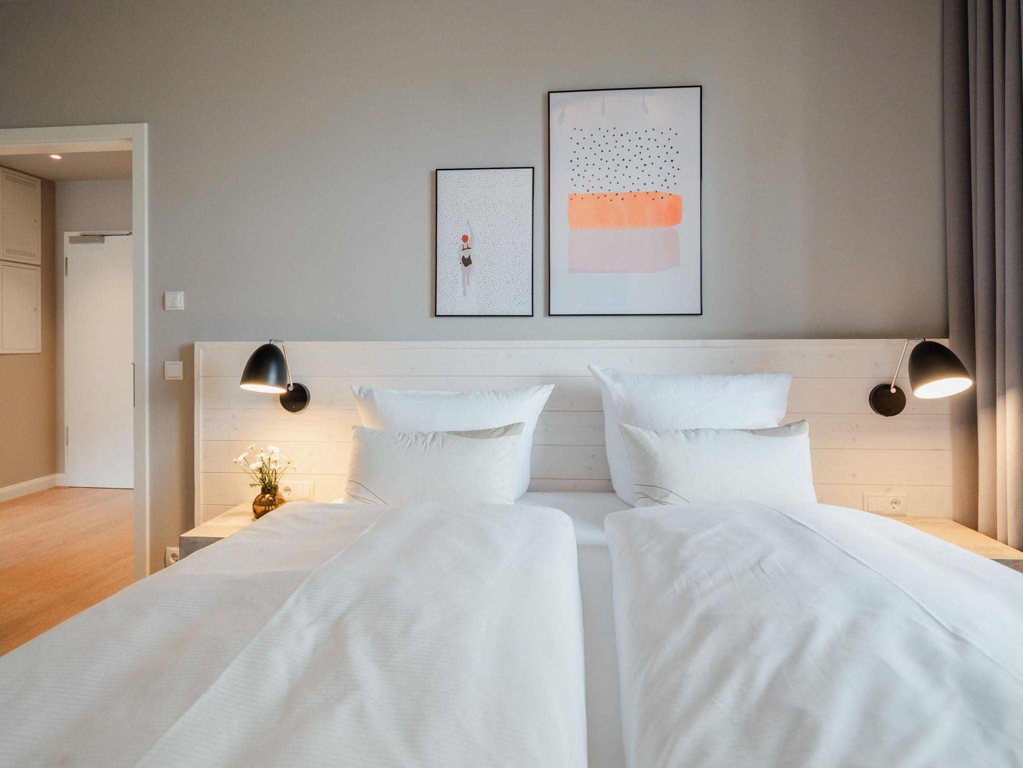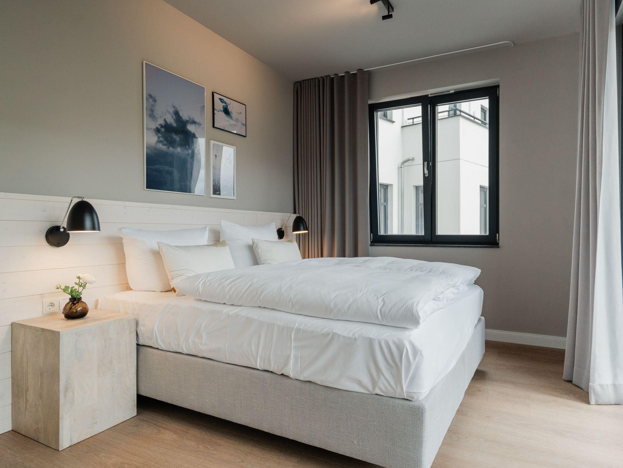 Eine lichtdurchflutete und großzügige 3-Raum-Wohnung erwartet Sie im Appartement B 1.2 in der 1. Etage der Strandterrasse im Haus B. Freuen Sie sich auf viel Gemütlichkeit und ein modernes Design. Die 78 Quadratmeter sind von unserer Inneneinrichterin mit viel Liebe und dem Händchen fürs nordisch Noble eingerichtet worden. Bis zu 4 Personen bietet das Appartement ein stilvolles Zuhause auf Zeit direkt an der Ostsee. Von gleich zwei Balkonen können Sie die frische Ostseebrise genießen und das Rauschen der Wellen vom nur 80 Meter entfernten Strand hören. Der geräumige Wohn-Essbereich ist mit einem schönen Esstisch und einem gemütlichen Sofa mit Sessel ausgestattet. Das elegante Grau kombiniert mit Weiß und den Farben der Ostsee sorgt für eine außergewöhnliche Designnote. Zum Wohnzimmer gehört eine offene Küche, die mit einem Backofen, einem 4-Platten-Induktionsherd und einer Nespresso-Kapselmaschine bestens bestückt ist. Hier macht das Zubereiten der Mahlzeiten Spaß. An einer kleinen Workingstation können Sie alles auf eine Karte schreiben, was Sie in Ihrer Auszeit erlebt haben. Ein nostalgisches Hobby, das zunehmend wieder in Mode kommt. Ein großer Flat-TV (50 Zoll) verwandelt das Wohnzimmer in ein privates Kino. Romantische Akzente setzt der Elektrokamin (ohne Wärmeabgabe). So kann man sich auch im Sommer im wunderbaren Flackern verlieren. Die beiden Balkone bieten einen seitlichen Ausblick Richtung Ostsee und sind mit einem Gartentisch, 4 Stühlen und einer Gartenliege ausgestattet. Das Wohnzimmer hat einen Zugang und eines der beiden Schlafzimmer hat einen weiteren Zugang zu den Balkonen. Beiden Schlafzimmern gleichermaßen eigen ist ein bequemes Boxspringdoppelbett (1,80m x 2,00m) und ein Kleiderschrank. Ein Schlafzimmer verfügt über einen 43 Zoll Flat-TV, das zweite Schlafzimmer über einen 32 Zoll Flat-TV. Ihr Domizil besitzt zwei moderne Duschbäder mit Waschtisch und WC. In einem Bad befindet sich eine Infrarotsaunakabine für entspannende Auszeitmomente. Zu dem Appartement gehört in der Tiefgarage ein PKW-Stellplatz. Nun müssen Sie nur noch heil und gesund in ihrer Unterkunft ankommen und der Urlaub kann beginnen. Meer geht eben immer!