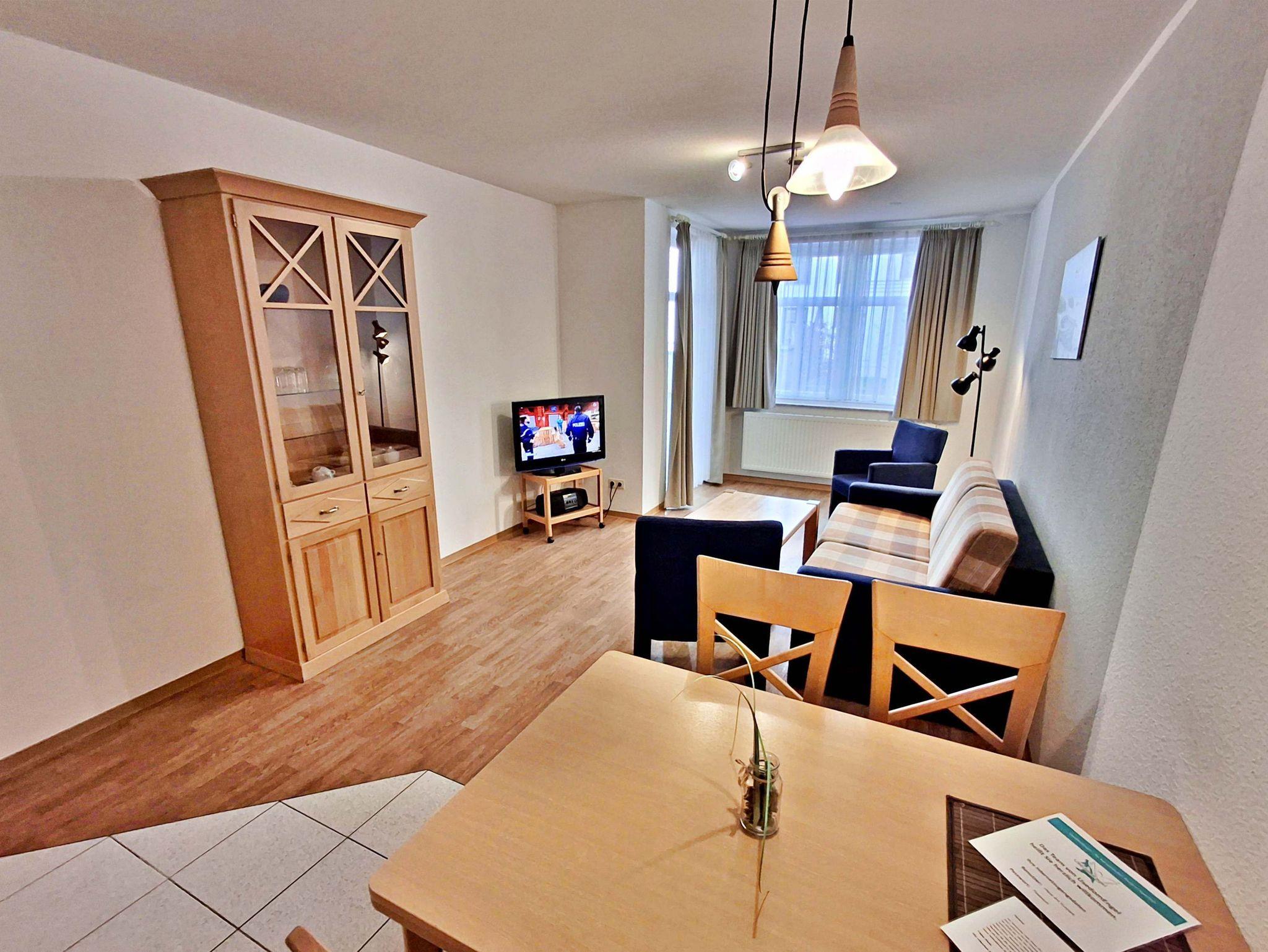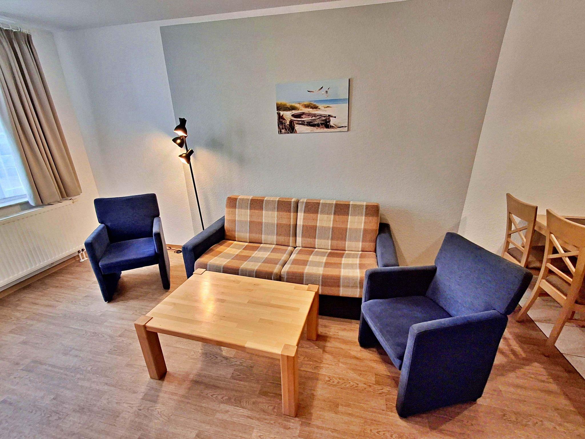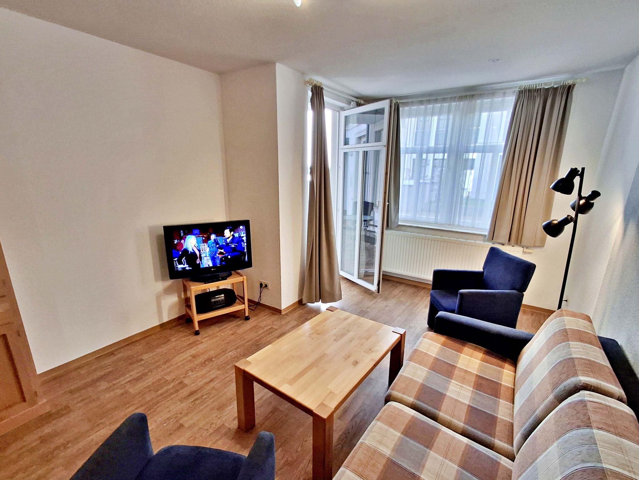 Der helle Wohnbereich ist mit einer gemütlichen Couch (Aufbettungsmöglichkeit für 1 Person), zwei Sesseln sowie einem Esstisch mit 4 Stühlen ausgestattet. Von hier aus gelangen Sie direkt auf die Terrasse zur ruhigen Hofseite - perfekt für ein Frühstück im Freien oder ein Glas Wein am Abend.