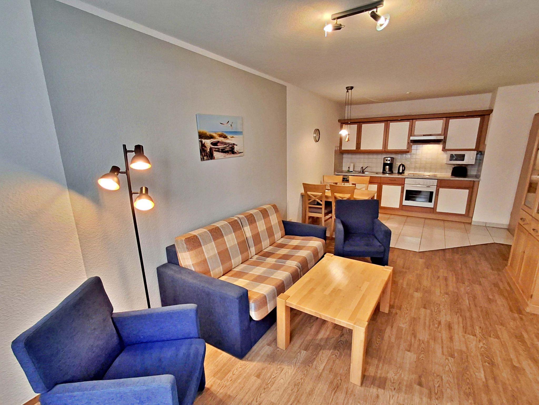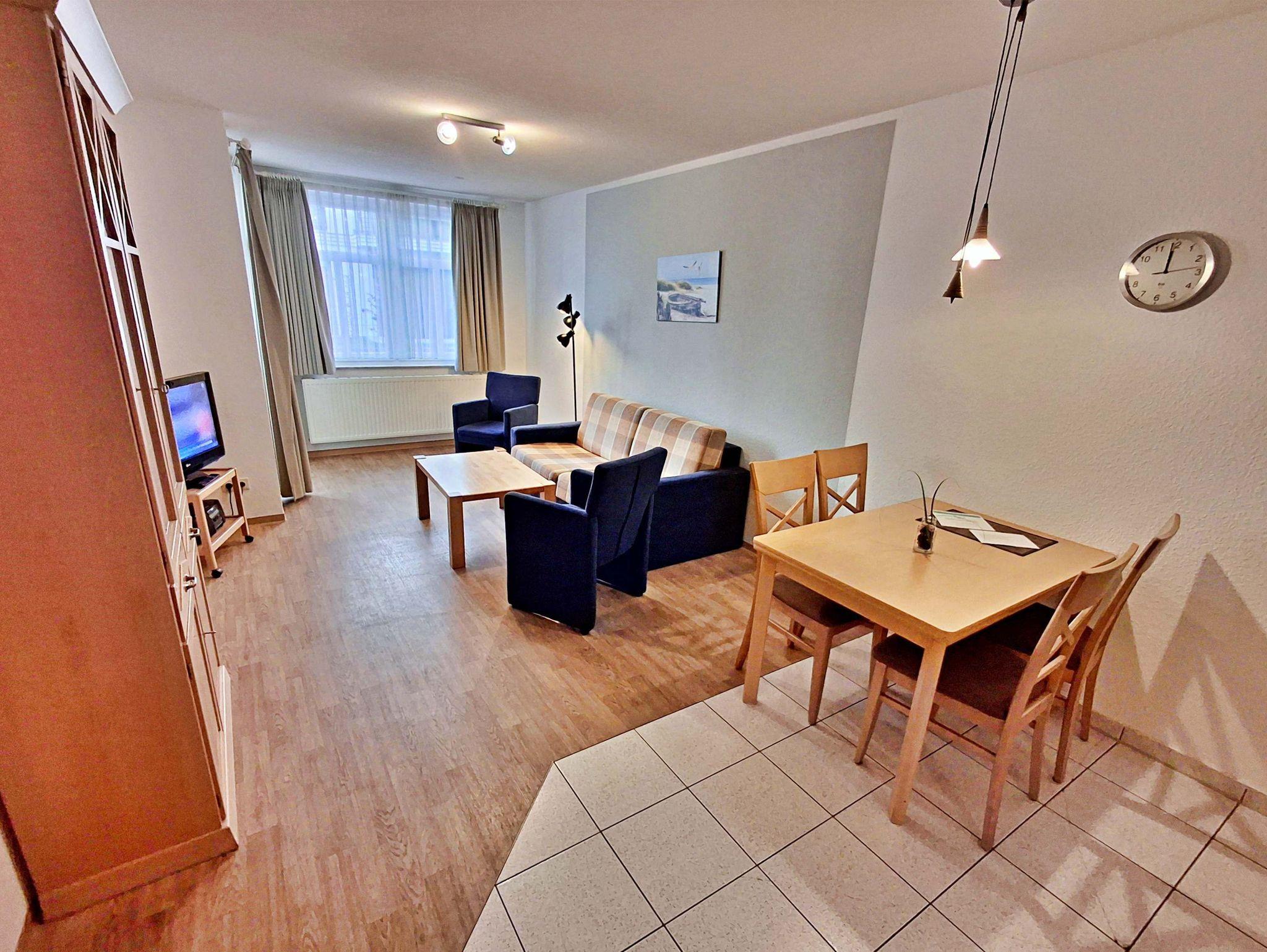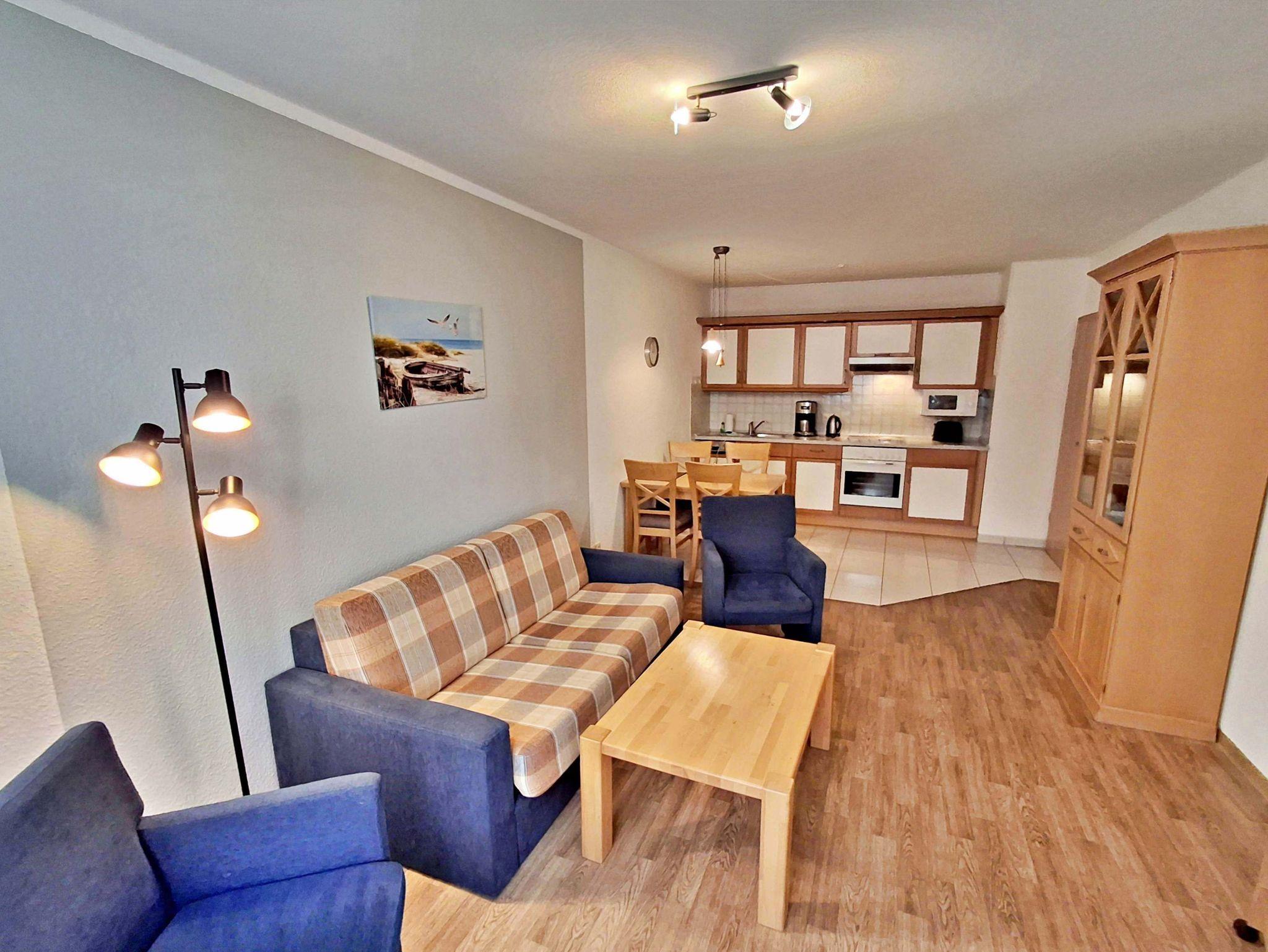 Der helle Wohnbereich ist mit einer gemütlichen Couch (Aufbettungsmöglichkeit für 1 Person), zwei Sesseln sowie einem Esstisch mit 4 Stühlen ausgestattet. Von hier aus gelangen Sie direkt auf die Terrasse zur ruhigen Hofseite - perfekt für ein Frühstück im Freien oder ein Glas Wein am Abend.