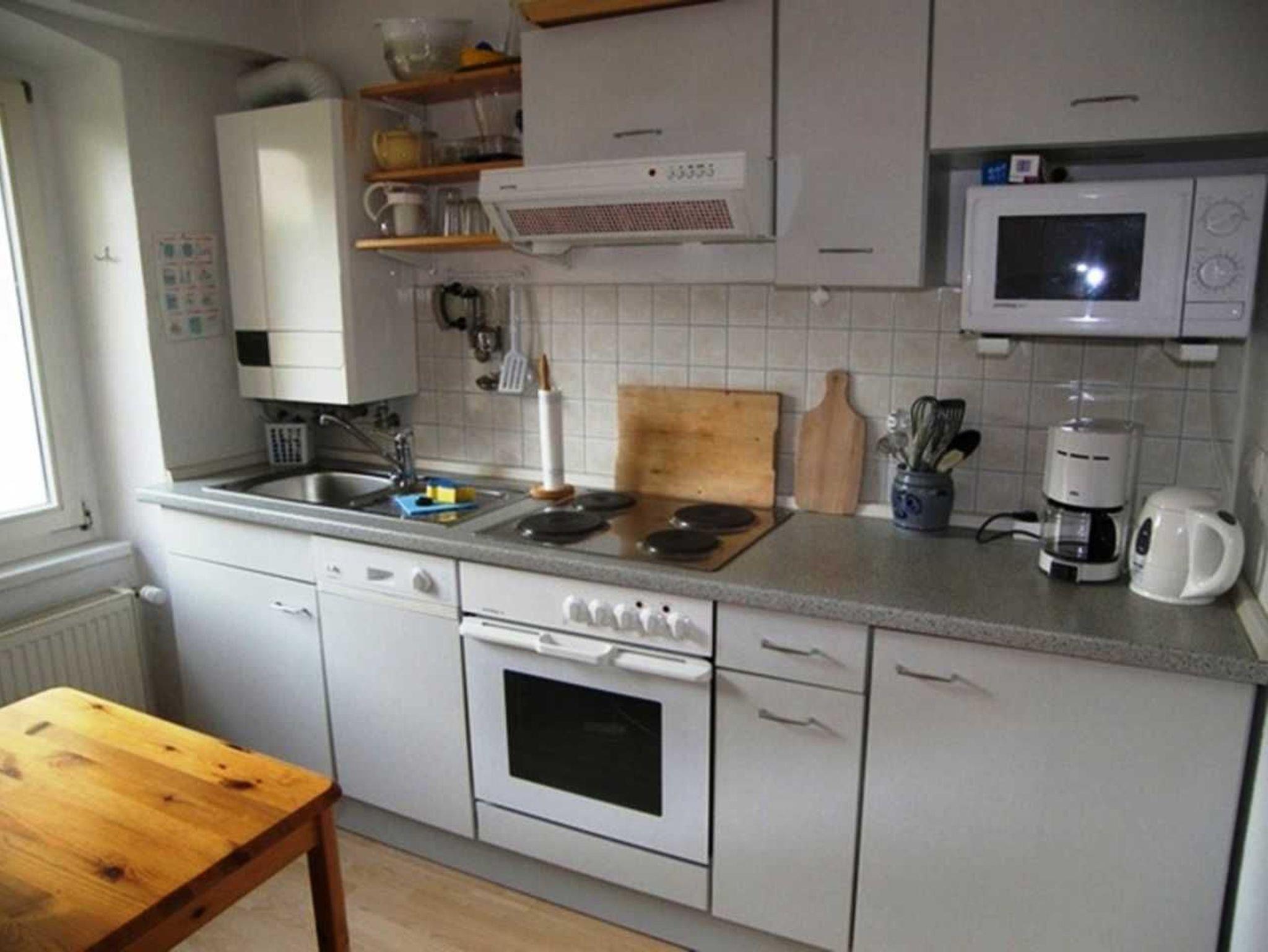 Die kleine Küche ist vollständig eingerichtet mit Herd, Backofen, Spülmaschine, Kühlschrank und Mikrowelle - perfekt für Selbstversorger.