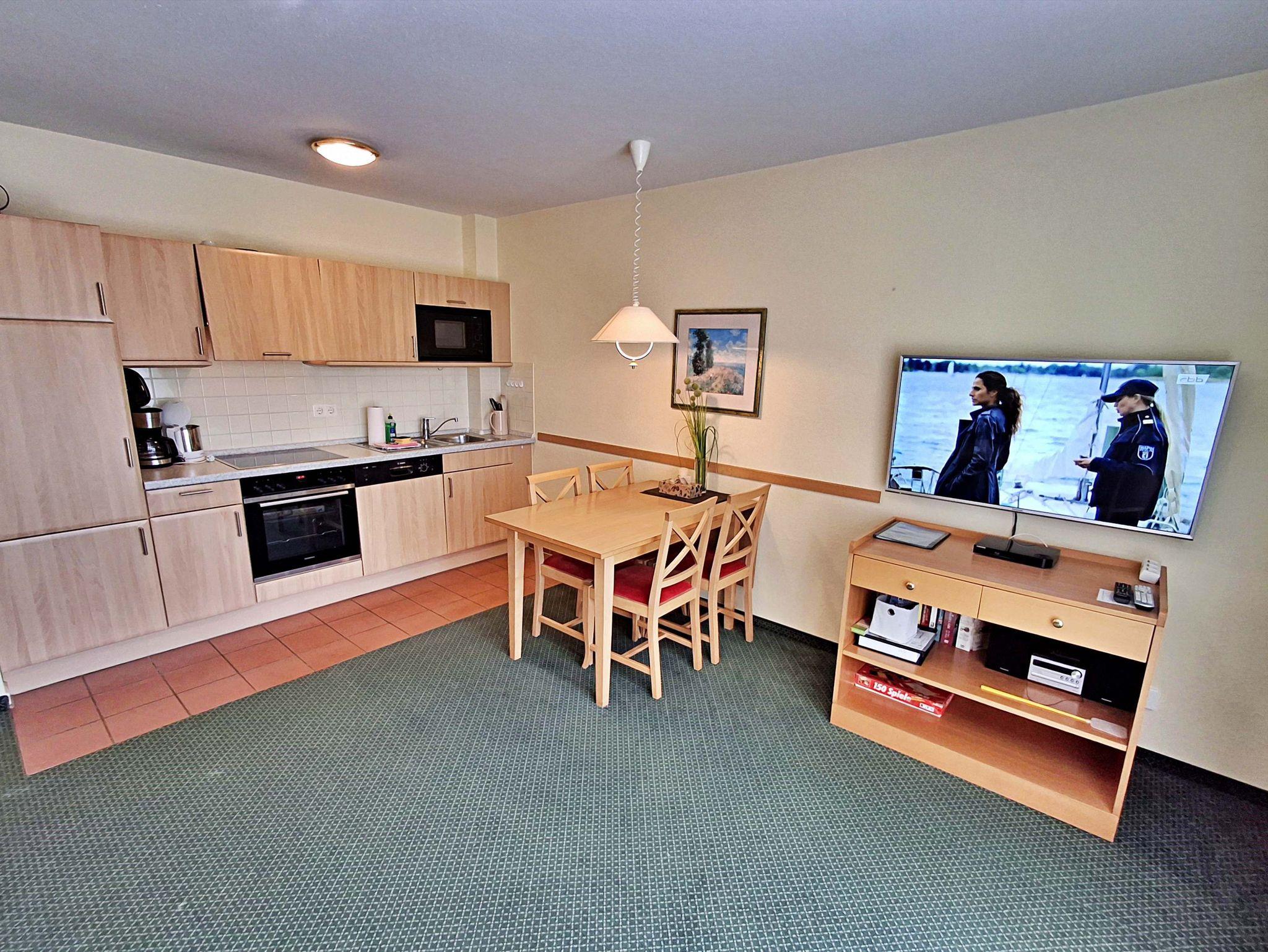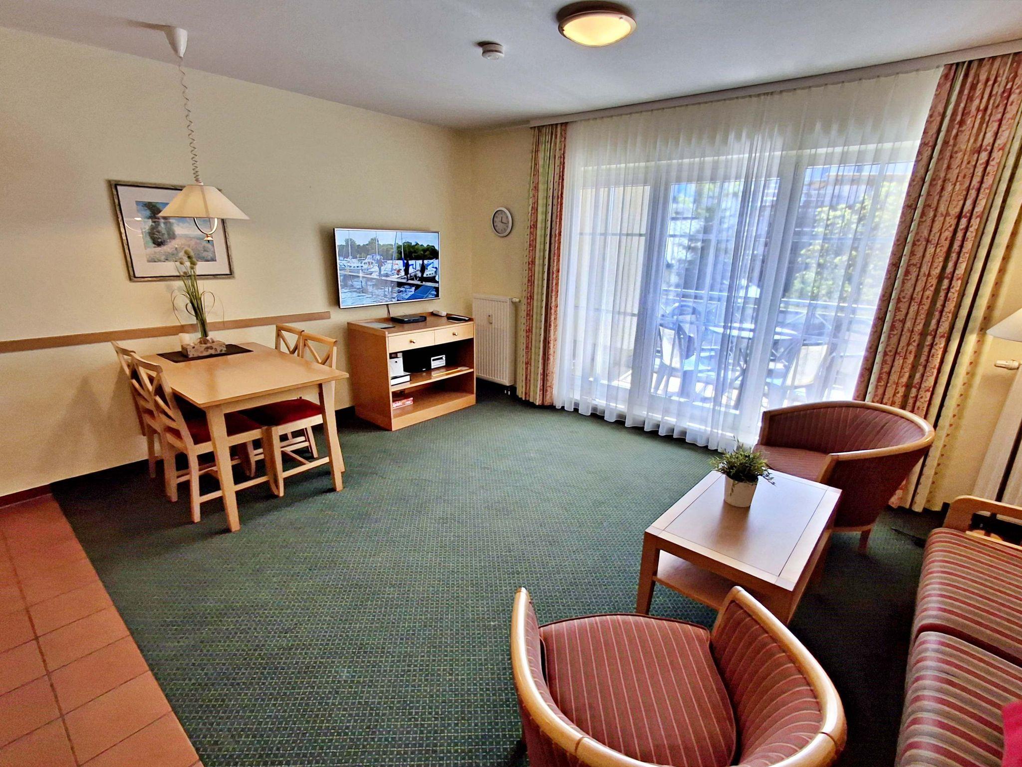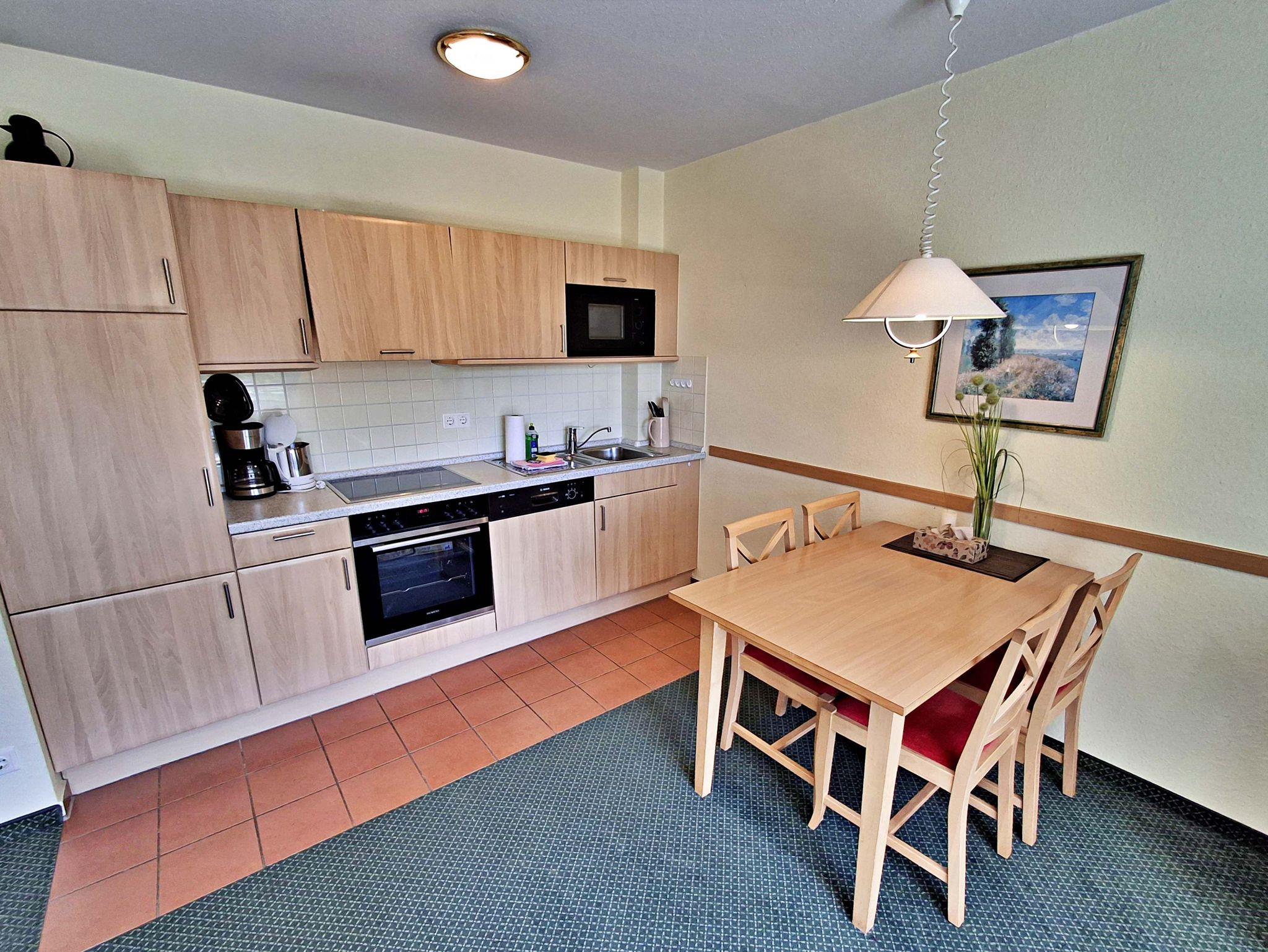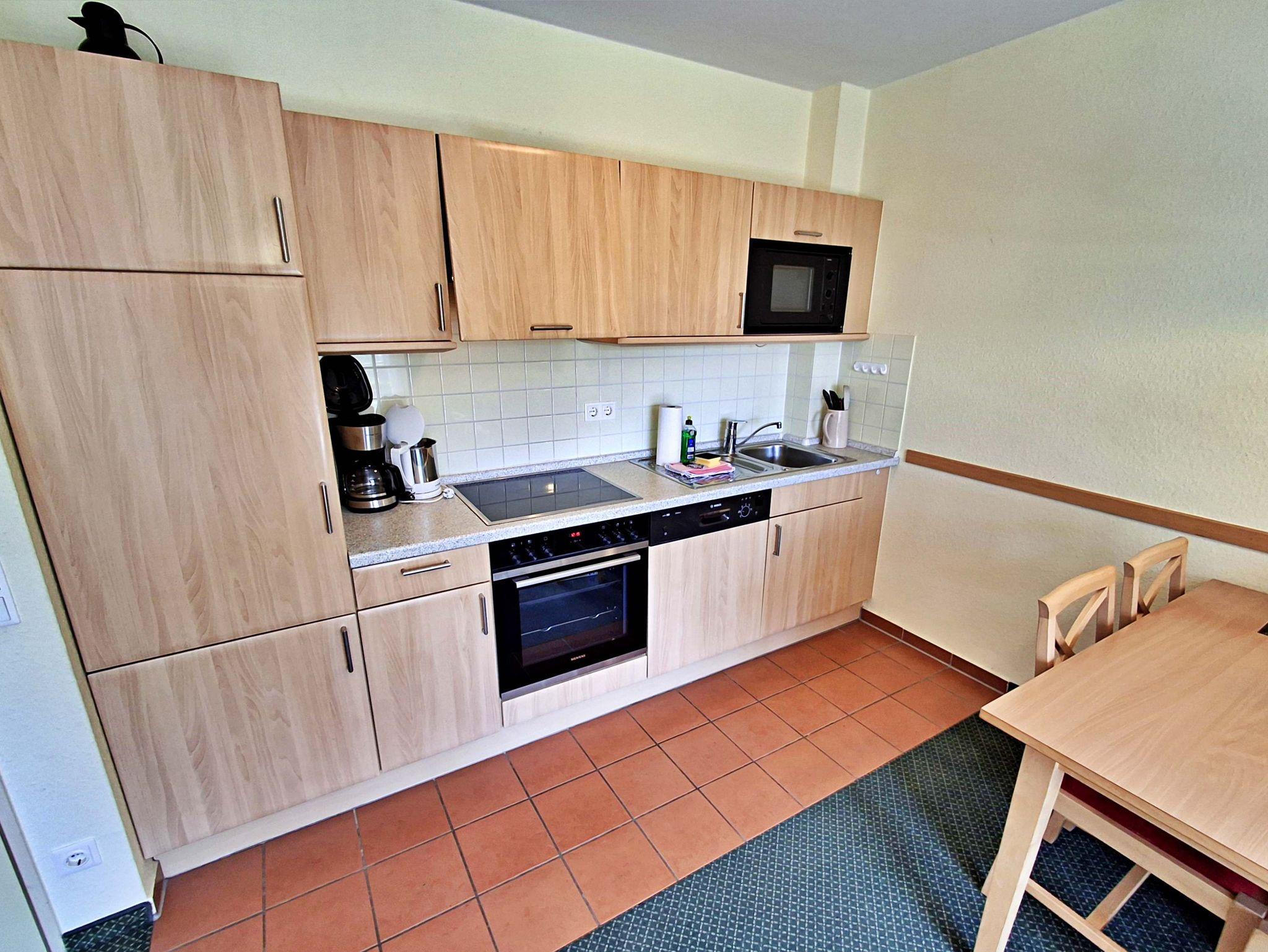 Die komfortable 3-Raum-Ferienwohnung mit Balkon befindet sich im zweiten Obergeschoss der Appartementanlage und ist für bis zu 4 Erwachsene und 1 Kleinkind bis 3 Jahre ausgestattet. Die Wohnung verfügt über ein Wohnzimmer mit gemütlicher Couch, Sessel und Esstisch mit 4 Stühlen. Für die Unterhaltung sorgen ein Flachbild-TV und Stereo-Anlage. Die vollständig ausgestattete Küchenzeile mit 4-Plattenherd, Backofen, Mikrowelle, Spülmaschine, Kühlschrank mit Gefrierfach lässt keine Wünsche offen. Im ersten Schlafzimmer befindet sich ein Doppelbett und im zweiten Schlafzimmer befinden sich zwei Einzelbetten sowie ein zusätzlicher Flachbild-TV. Das Bad ist mit Dusche/WC und Haarfön ausgestattet. Sie können bequem den Aufzug bis zur Wohnungstür nutzen.
