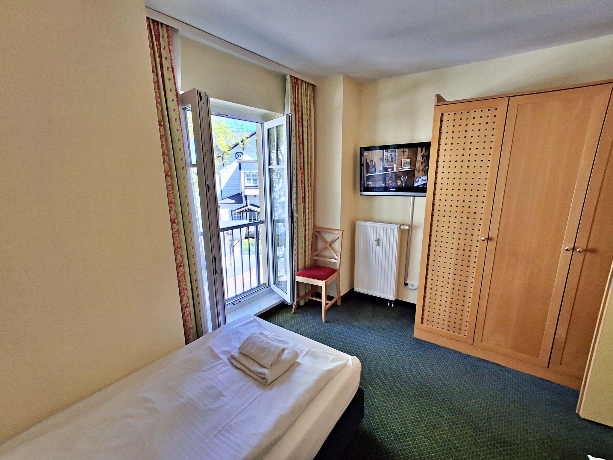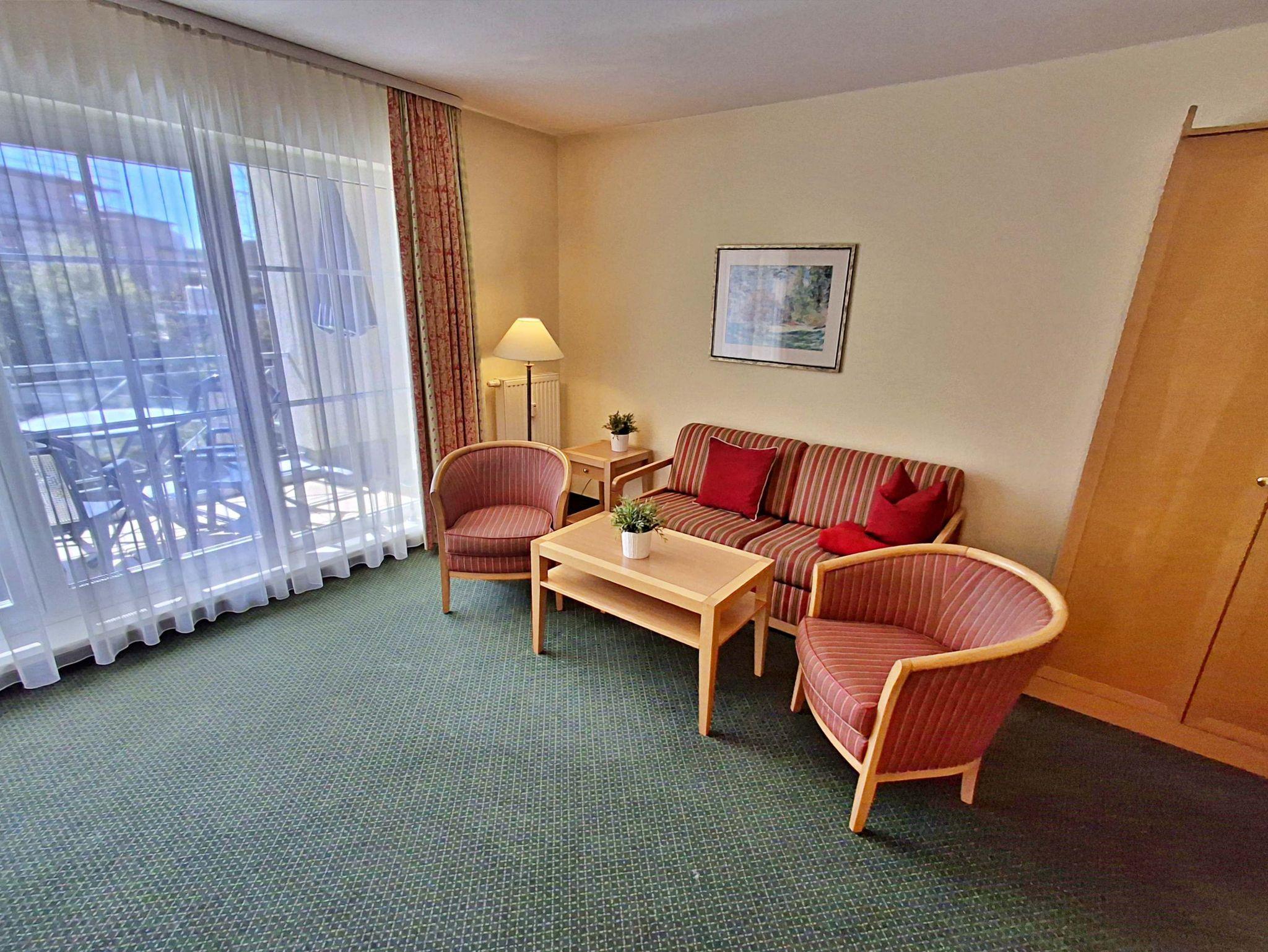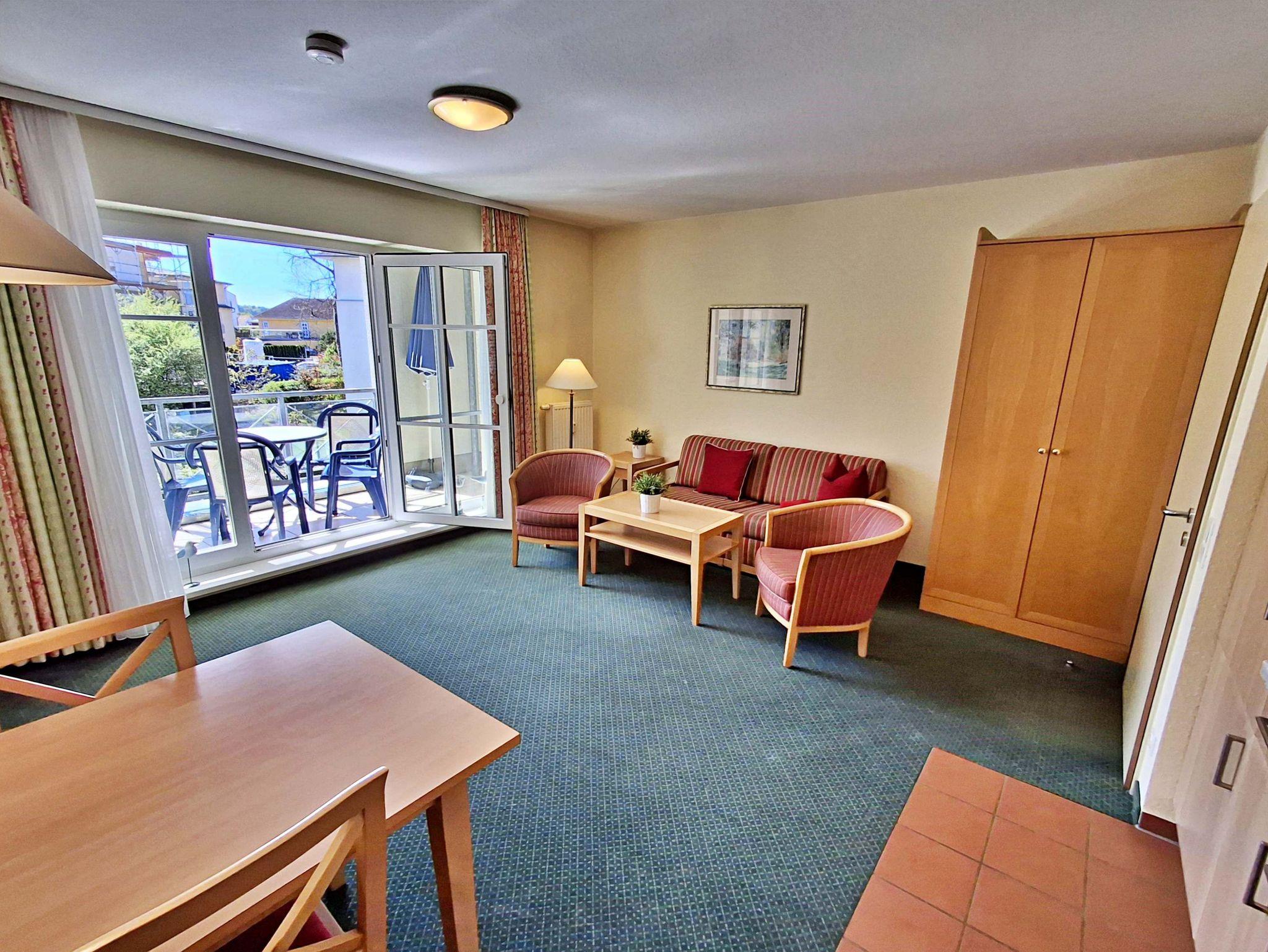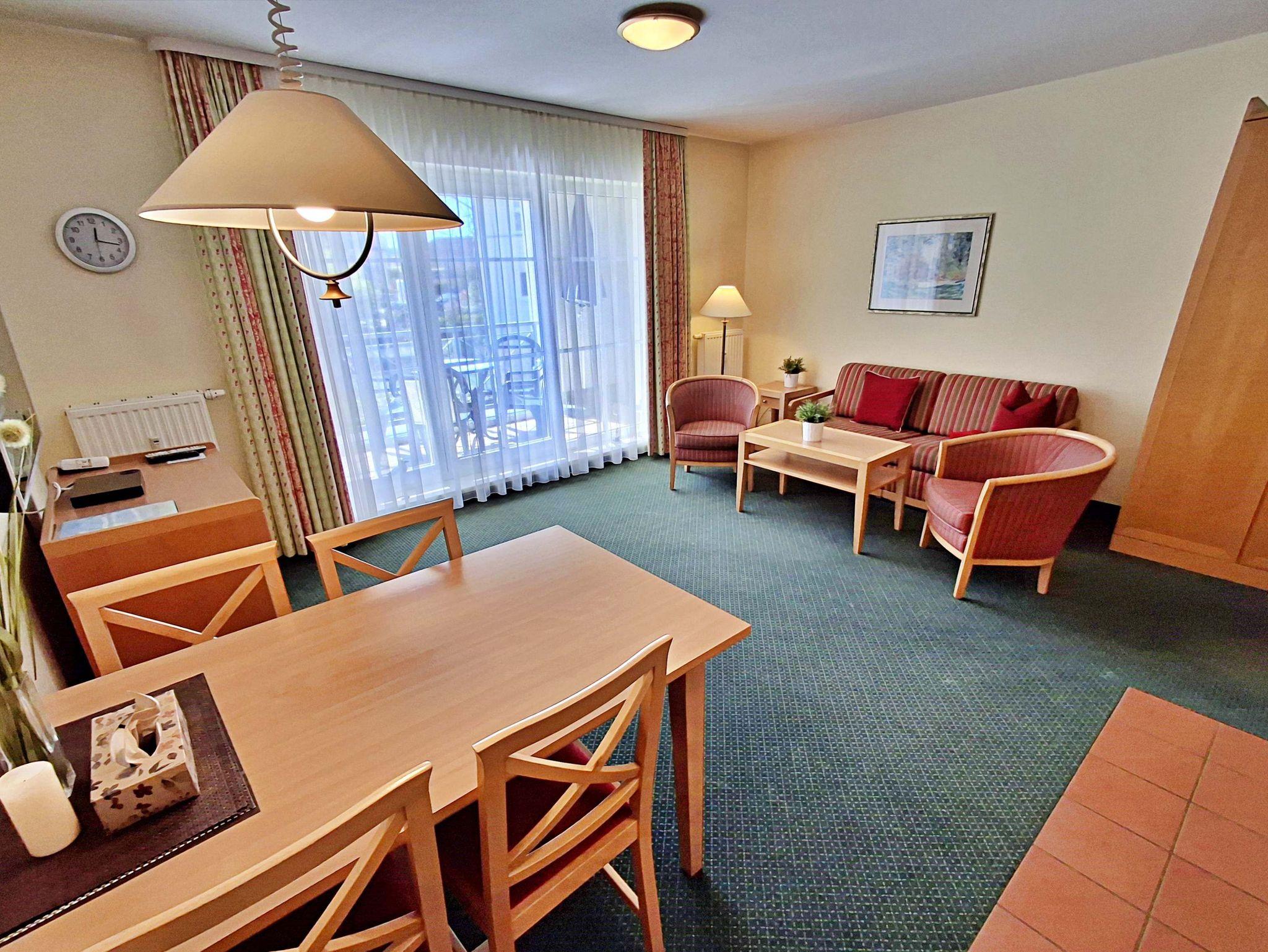 Die komfortable 3-Raum-Ferienwohnung mit Balkon befindet sich im zweiten Obergeschoss der Appartementanlage und ist für bis zu 4 Erwachsene und 1 Kleinkind bis 3 Jahre ausgestattet. Die Wohnung verfügt über ein Wohnzimmer mit gemütlicher Couch, Sessel und Esstisch mit 4 Stühlen. Für die Unterhaltung sorgen ein Flachbild-TV und Stereo-Anlage. Die vollständig ausgestattete Küchenzeile mit 4-Plattenherd, Backofen, Mikrowelle, Spülmaschine, Kühlschrank mit Gefrierfach lässt keine Wünsche offen. Im ersten Schlafzimmer befindet sich ein Doppelbett und im zweiten Schlafzimmer befinden sich zwei Einzelbetten sowie ein zusätzlicher Flachbild-TV. Das Bad ist mit Dusche/WC und Haarfön ausgestattet. Sie können bequem den Aufzug bis zur Wohnungstür nutzen.