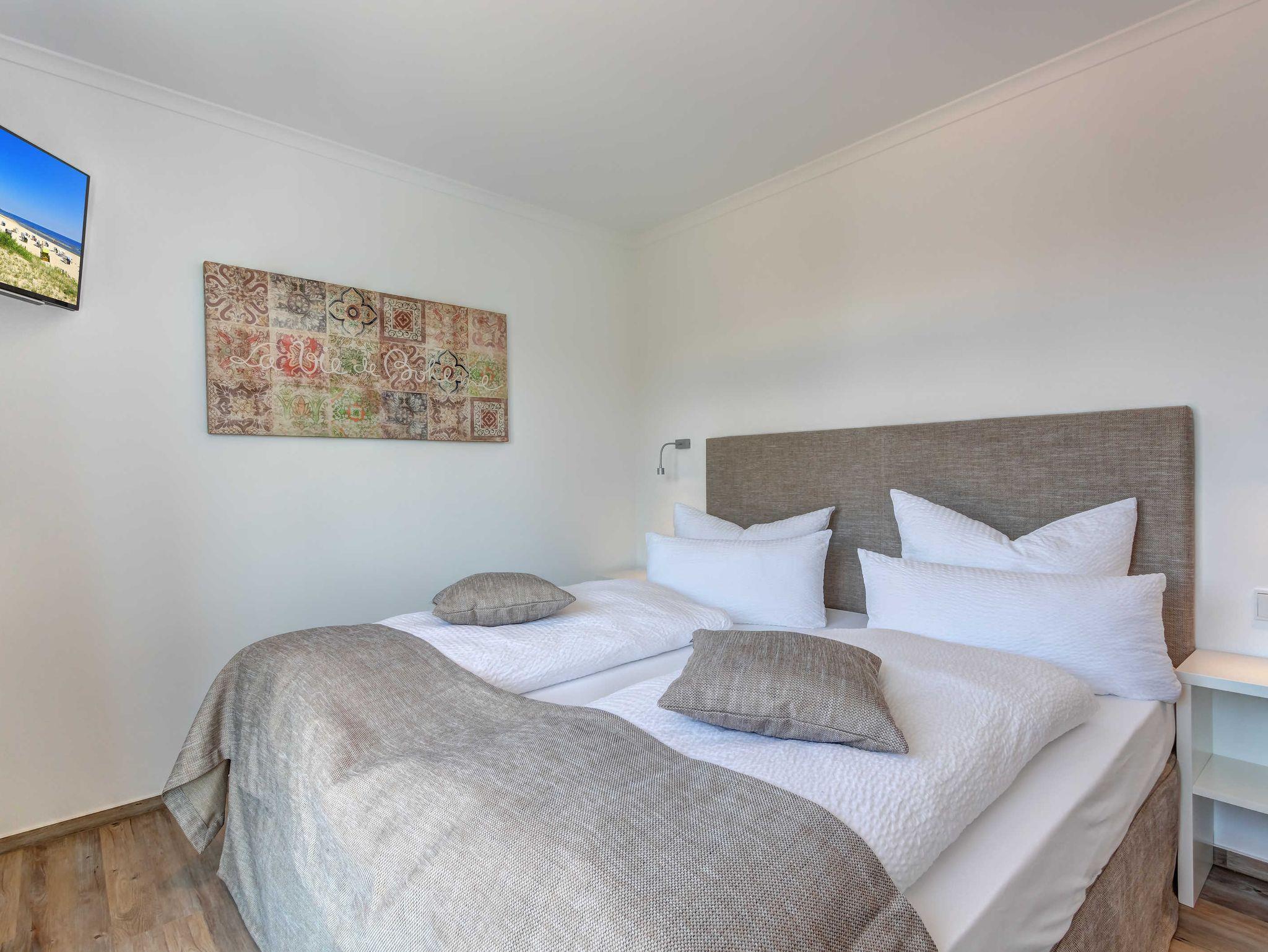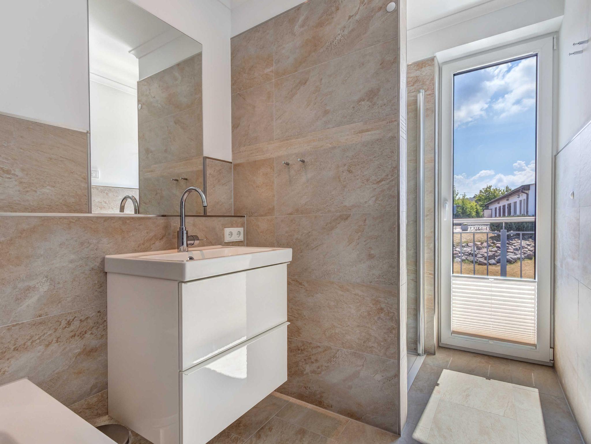 Neubau 2018 mit Fußbodenheizung. Chice und modern eingerichtete 4-Zimmer-Wohnung mit Loggia nach Westen und zus. kleinem Südbalkon an einem Schlazimmer! Die sehr komfortable Wohnung verfügt über drei separate Schlafzimmer, jeweils mit zugehörigem ensuite-Bad, Wohnküche mit Küchenzeile und Essplatz sowie einem gemütlichen Fernsehbereich. Weiter gibt es eine Diele und einen Abstellraum in der Wohnung. Von den drei Bädern sind zwei Duschbäder und eines mit Wanne und Dusche. Zwei Pkw-Stellplätze auf dem Grundstück sind inklusive.