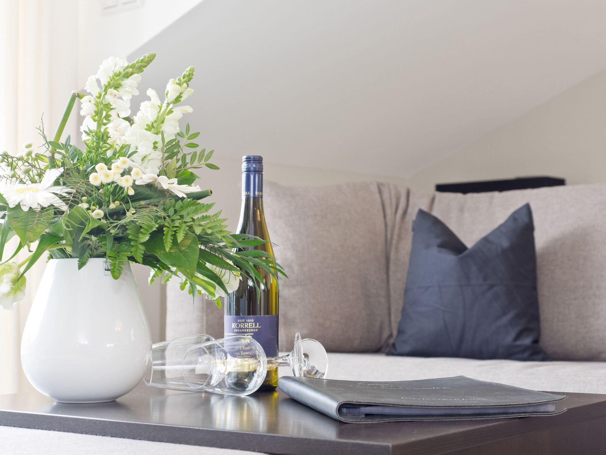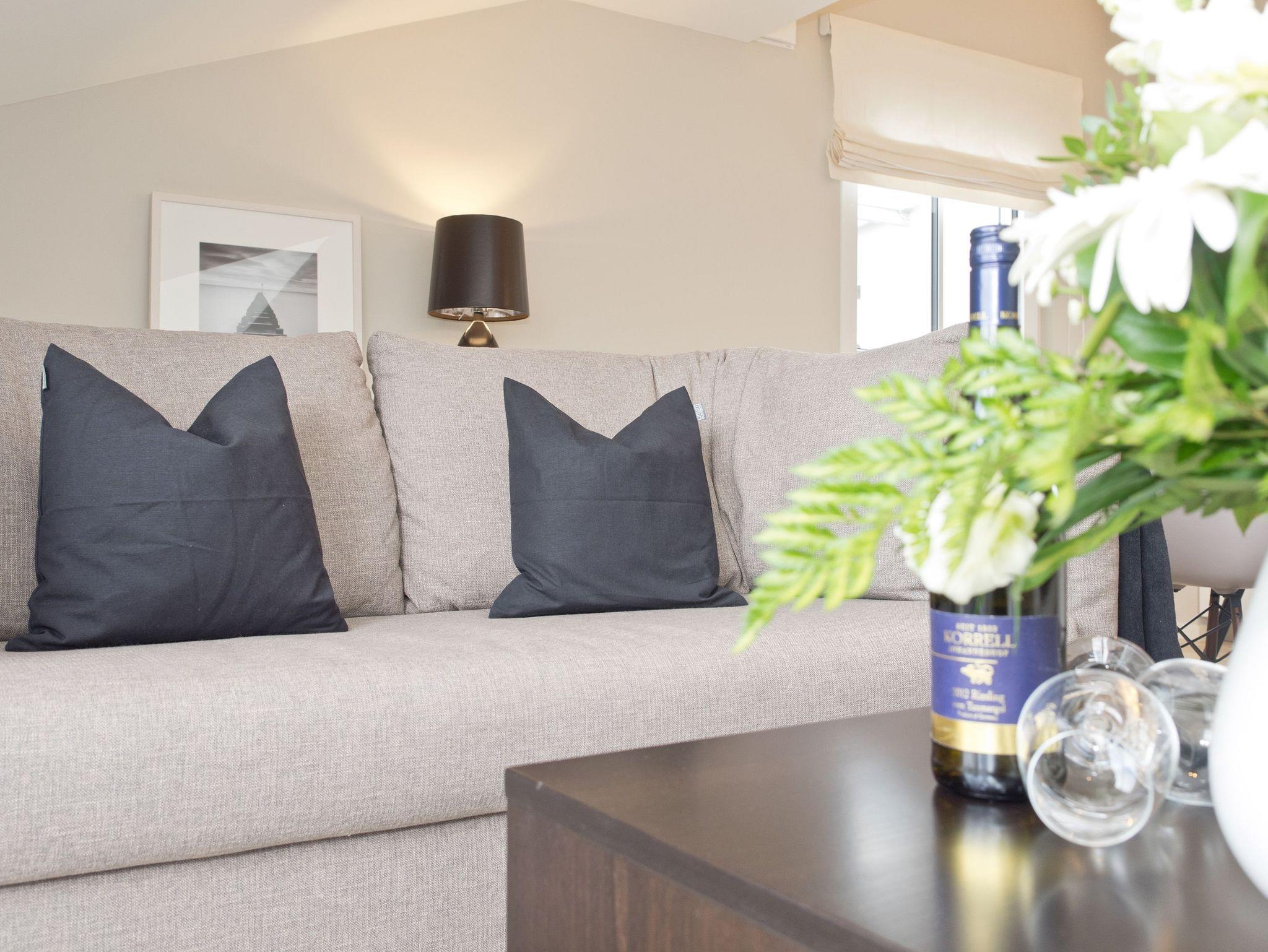 Zauberhaft wohnen im Dachgeschoss! Direkt unter dem Dach des Hauses gelegen, erwartet Sie eine stylische 2-Raum-Ferienwohnung (55 qm) für 2 Personen [&] ein Kind bis maximal 16 Jahre und ein Kleinkind bis 3 Jahre im Kinderreisebett. Schon beim Eintreten in die Diele offenbart sich ein sehr hochwertig ausgestatteter Wohnbereich mit offener komplett ausgestatteter Küche, die durch einen schönen Essplatz ergänzt wird. Der per Fernbedienung einfach zu benutzende Design-Gaskamin sorgt nicht nur in der kalten Jahreszeit für eine gemütliche Atmosphäre, sondern lädt auch zum abendlichen verweilen auf der bequemen Schlafcouch (als Aufbettungsmöglichkeit für ein Kind) ein. Für ausreichend Multimedia im Wohnbereich ist gesorgt- Loewe Flat-TV/Blue-Ray-Player, Loewe Radio/CD mit iPhone Docking-Station lassen nichts vermissen. Das Schlafzimmer mit komfortablen Einbauten, Loewe ? Flat-TV/DVD Player und exklusivem Schramm Boxspringbett (1,80 x 2 m) verfügt über einen schönen Balkon (Westseite) mit 2 Liegen und Blick auf das Seebad. Auch der zweite Westbalkon (mit Zugang vom Wohnbereich) mit Gartenmöbeln bietet einen schönen Ausblick auf Ahlbeck und lässt die Usedomer Mittags- und Abendsonne genießen. Für Ihren Komfort sind die Betten bei der Anreise bezogen und Handtücher liegen bereit. Ein Pkw-Stellplatz ( Nr.7) steht in der Tiefgarage zur Verfügung. Auf Wunsch stellen wir ein Kinderreisebett (ohne Matratze [&] Bettzeug) und einen Kinderhochstuhl gegen einen Aufpreis zur Verfügung. Die Nutzung des WLAN-Netzes ist kostenfrei.