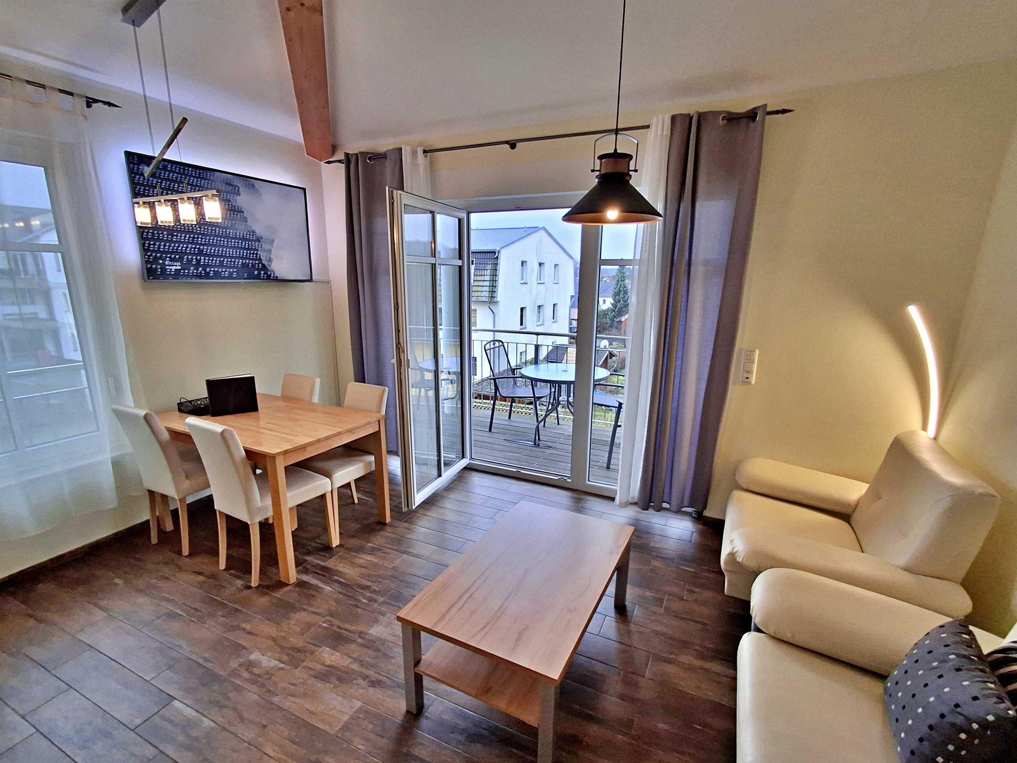 Modern, freundlich und stilvoll - die charmante Nichtraucher-Ferienwohnung Jani in der Villa Ilona bietet mit 54 qm ein schönes Zuhause auf Zeit für bis zu 4 Personen. Im hellen Wohnbereich zur Südseite finden Sie eine gemütliche Couch, Sessel und einen Flachbild-TV. Der Essplatz mit 4 Stühlen bietet genügend Platz für entspannte Frühstücke oder ein Glas Wein am Abend. Die moderne Küchenzeile mit Ceranherd, Geschirrspüler, Kühlschrank mit Gefrierfach, Kaffeemaschine, Wasserkocher, Toaster und Eierkocher komplettiert die moderne Ausstattung des Wohnbereichs. Ein großer Südbalkon lädt Sie zum Sitzen und Verweilen oder abends zum Grillen auf dem Elektrogrill ein. Von früh bis spät scheint die Sonne auf den Balkon und ins Wohnzimmer. Zur Unterhaltung bieten wir zusätzlich Brettspiele und Radio mit CD. In den Schlafzimmern befindet sich jeweils ein Doppelbett mit Kaltschaummatratzen, die auch für Allergiker geeignet sind sowie je ein Kleiderschrank mit genügend Stauraum. Das geräumige Tageslicht-Bad ist zeitgemäß mit Dusche, WC, Waschmaschine und genügend Ablageflächen gestaltet - alles da, was man braucht.