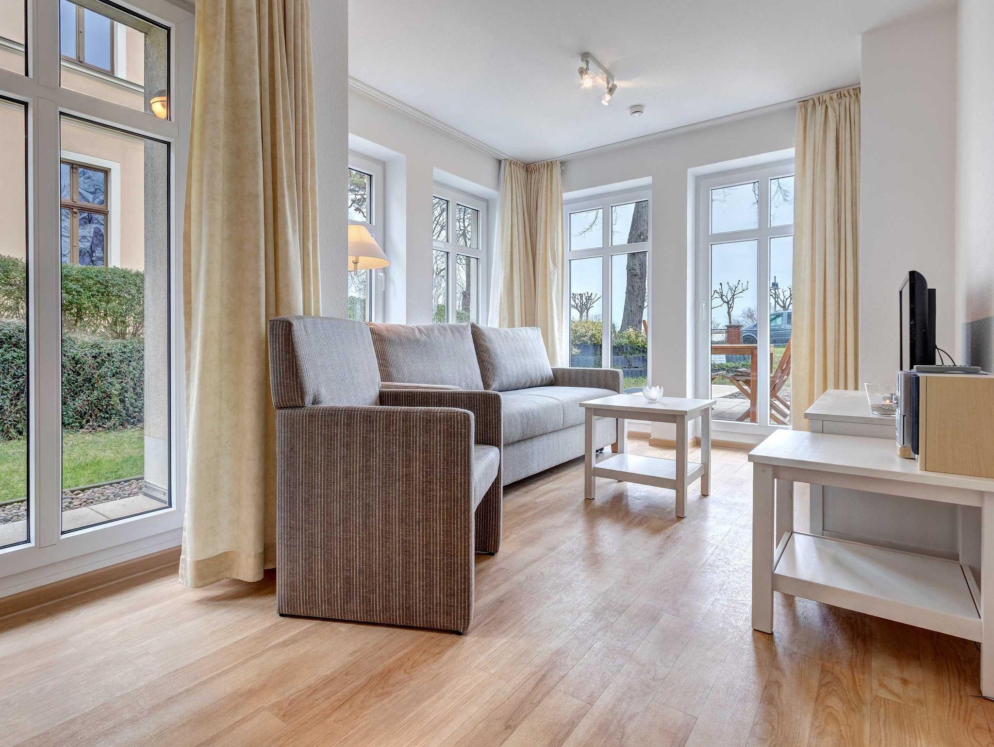 1. Reihe, direkt an der Strandpromenade mit TERRASSE zur Seeseite! FAHRSTUHL im Haus! Schönes 3-Zimmer-Apartment (ca. 55 m²) mit moderner guter Ausstattung. Zwei separate Schlafzimmer, Wohnzimmer mit Essplatz, Küchenbereich, Duschbad, Gäste-WC, Terrasse zur Promenadenseite, zus. kleine Terrasse neben dem Eßplatz. Die Wohnung verfügt über einen Tiefgaragen-Pkw-Stellplatz. In der Garage können auch Fahrräder und ähnliches untergestellt werden. In unserer Villa Germania nebenan gibt es eine Sauna. Von der Villa Aquamarina aus können Sie das Ortszentrum und die bekannte Ahlbecker Seebrücke in ca. 3 Minuten zu Fuß erreichen. Zum Strand sind es 50 m.
