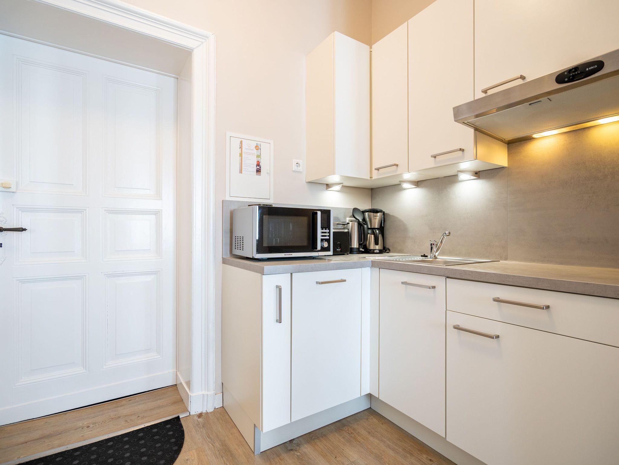 Im 1. Obergeschoss der Villa Albertine befindet sich diese schöne 2-Raum-Ferienwohnung (31 qm) für 2 Personen und ein Kind bis 16 Jahre. Die moderne, helle Einrichtung lässt keine Wünsche offen. Freuen Sie sich auf die schöne und lichtdurchflutete Veranda, in der sich der Wohnbereich mit Schlafsofa (hier kann ein Kind zusätzlich aufgebettet werden), modernem Flat-TV und ein kleiner Essplatz mit schönem, jahreszeitlich abhängigen Blick auf die Ostsee, befindet. Der Schlafbereich ist mit einem komfortablen Boxspringdoppelbett (1,60m x 2,00m) [&] Flat-TV ausgestattet. Im Eingangsbereich ist die kleine Küche integriert, die durch gekonnte Detaillösungen komplett ausgestattet ist (2-Platten-Induktionsfeld, Geschirrspüler, Mikrowelle). Ergänzt wird das Appartement durch ein Bad mit Dusche und WC. Ein PKW-Stellplatz Nr. 6 befindet sich auf dem Grundstück.