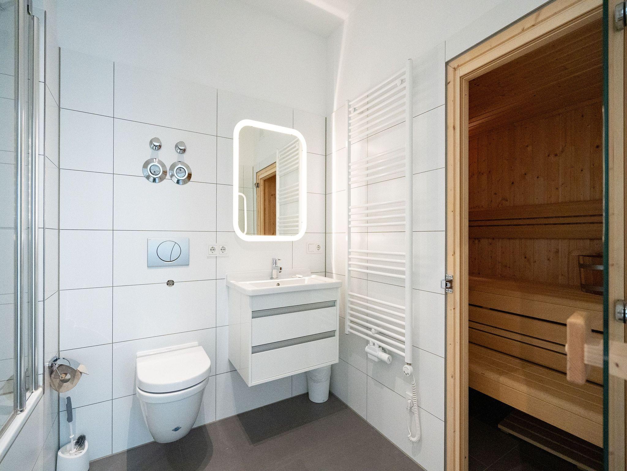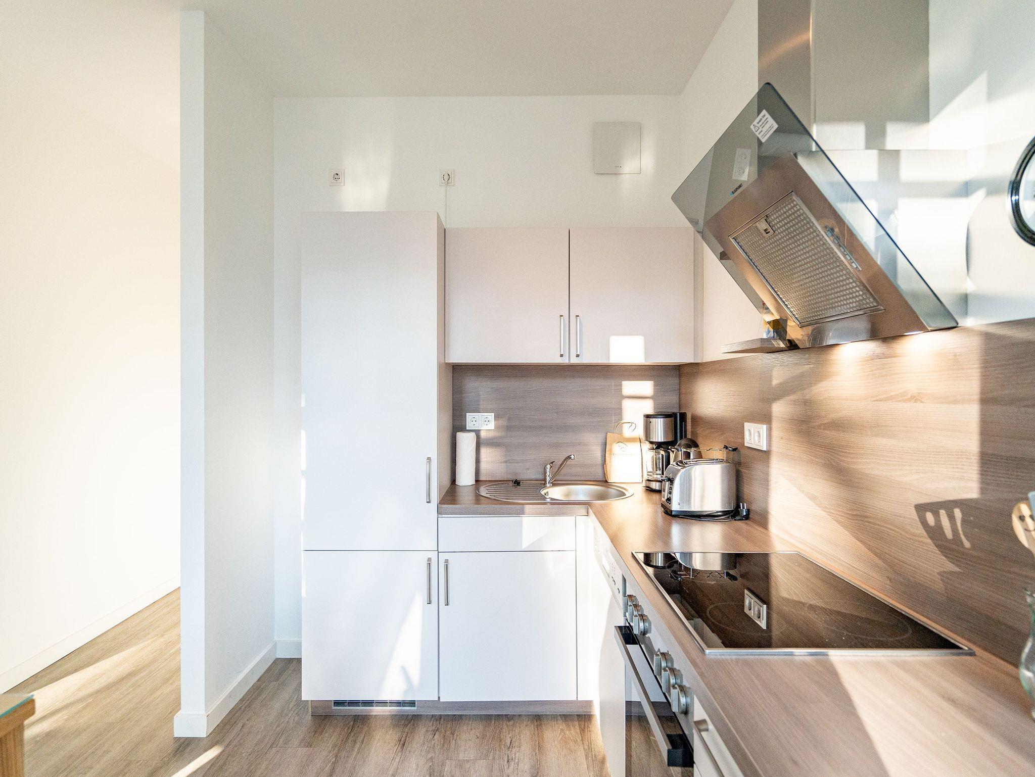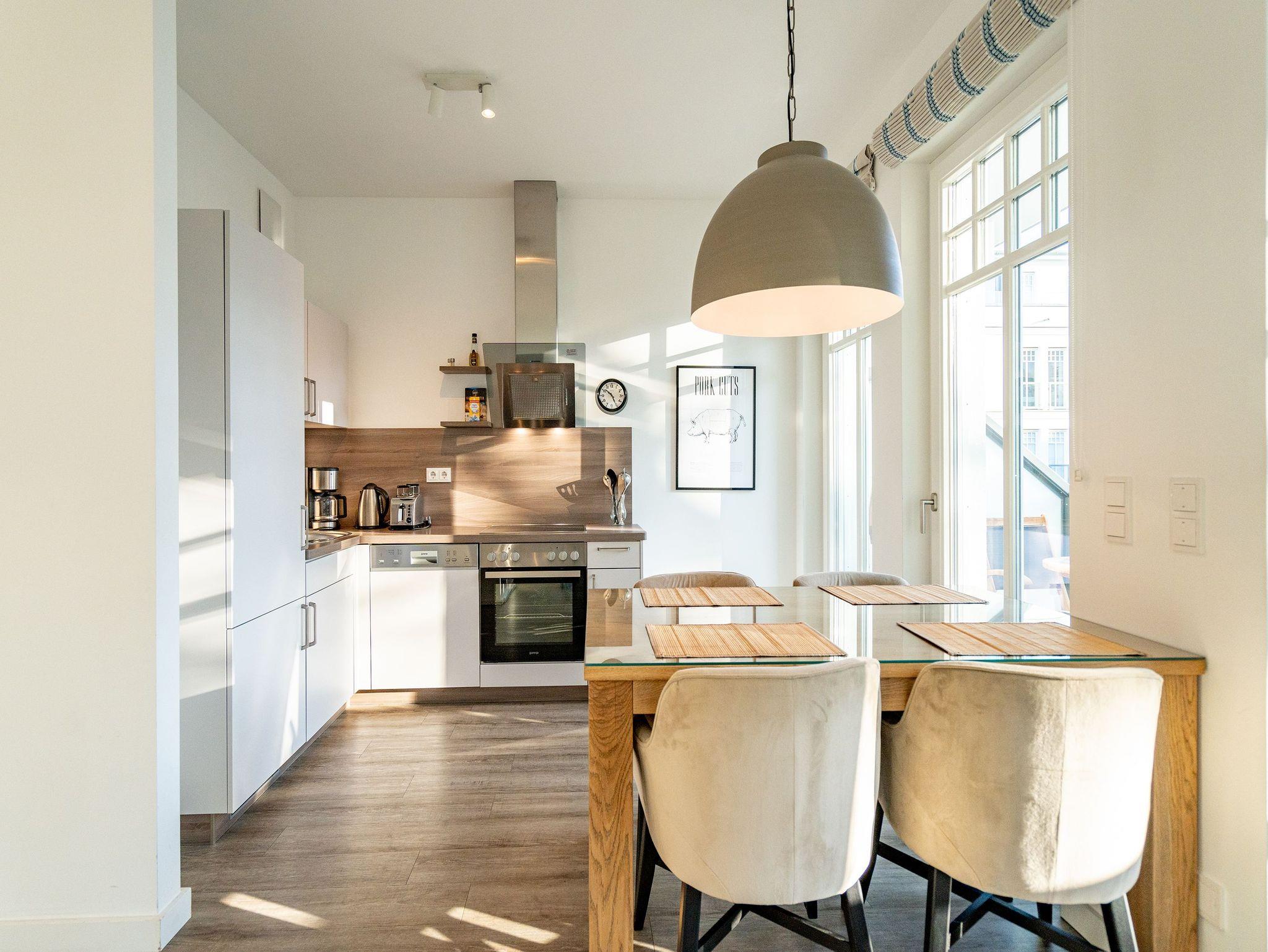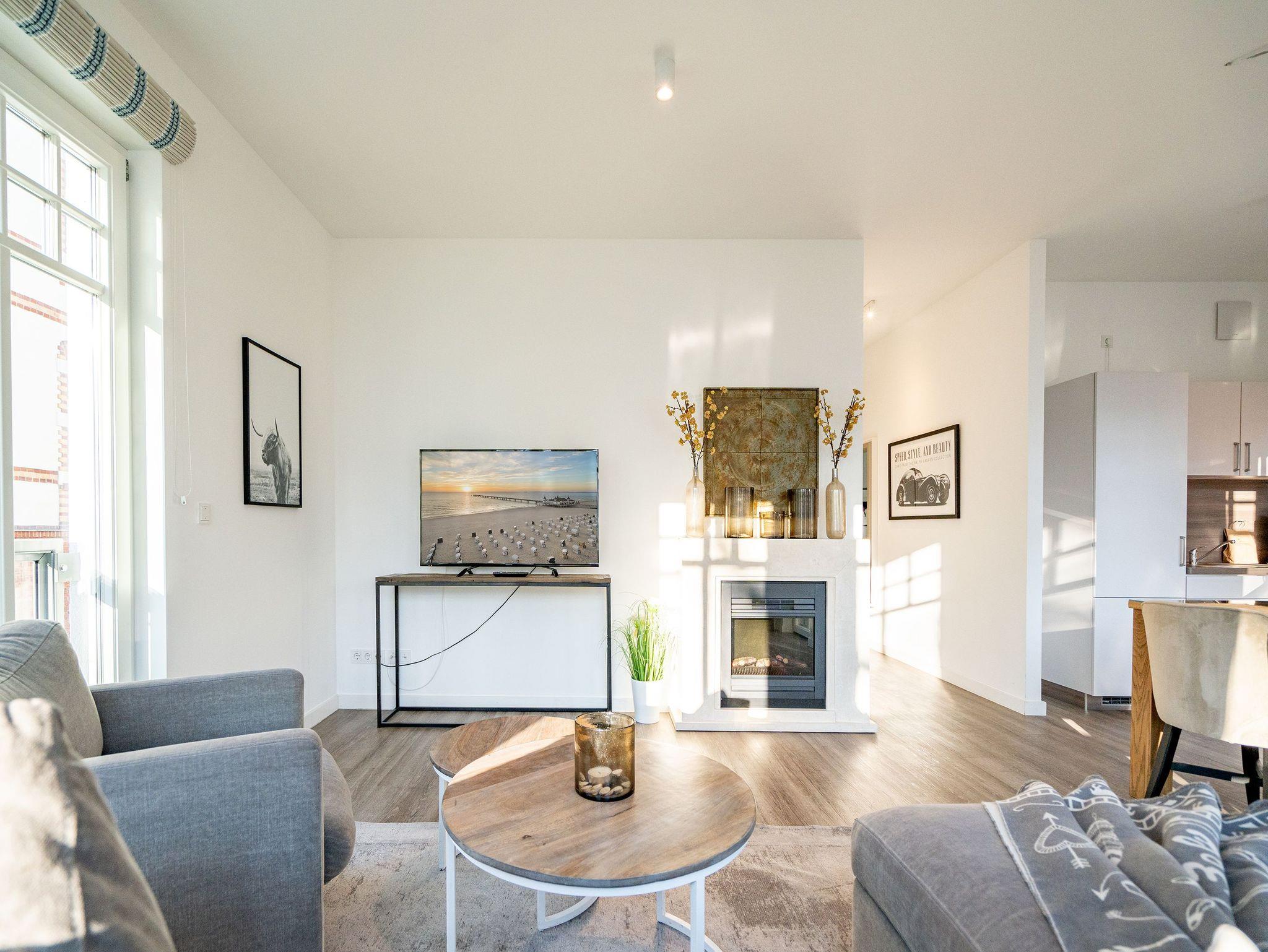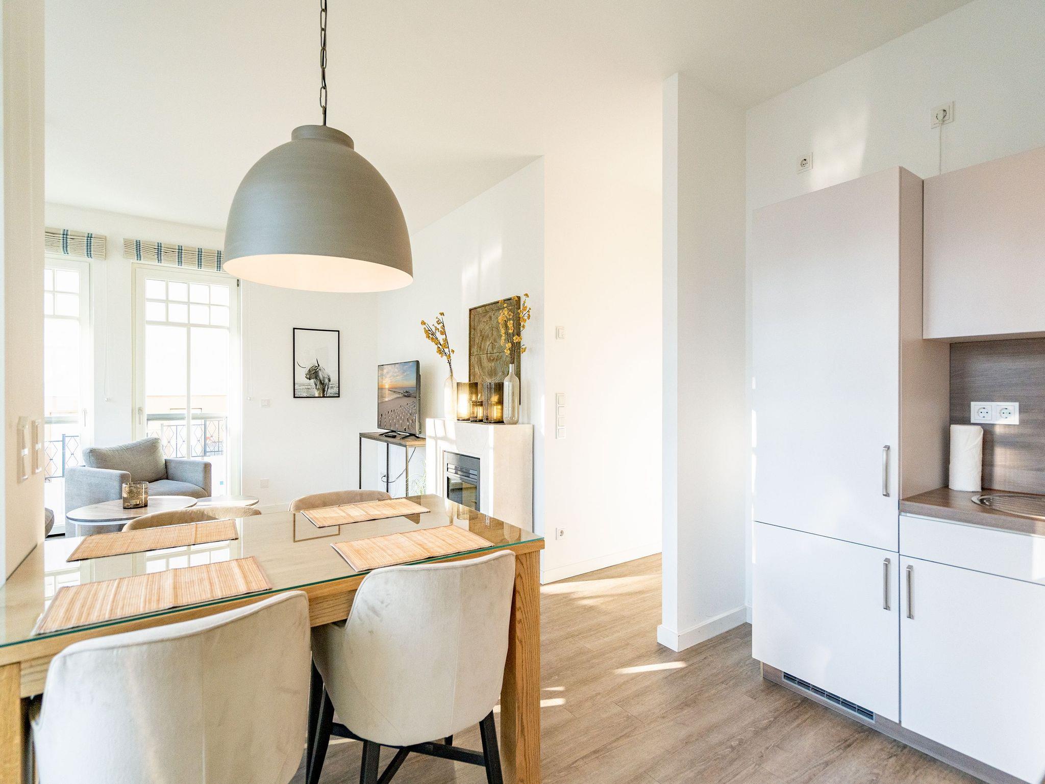 Eine harmonisch abgestimmte Inneneinrichtung und dezente Farben - so begrüßt Sie das gemütliche 68 Quadratmeter große Appartement 8 im Westendpalais. Das exklusive 3-Raum-Domizil eignet sich für maximal 2 Erwachsene, 2 Kinder und ein Kleinkind (bis 3 Jahre im Kinderreisebett). Viel Platz zum Entspannen bietet der offene Wohn-Essbereich mit Sofalandschaft und Flat-TV. Ein Elektro-Kamin sorgt für zusätzliche Wohlfühlatmosphäre, besonders an kühleren Tagen. Einen seitlichen Blick auf die Ostsee gibt der kleine Balkon frei, der auch von der angrenzenden Küche begehbar ist. Die hochwertige Küchenzeile ist u.a. mit einem Induktionsherd und allem, was Sie zum Zubereiten Ihrer Speisen benötigen, ausgestattet. Ein Essplatz für bis zu 5 Personen rundet den Wohn-Essbereich ab. Sollten Sie die Ostsee nachts einmal nicht hören, können Sie zumindest von ihr träumen. Dafür steht ein Schlafzimmer mit Doppelbett (1,60m x 2,00m) und eine Schlafcouch (1,20m x 2,00m) in einem separaten Wohnraum zur Verfügung. Beide Zimmer verfügen darüber hinaus über Flat-TVs. Das großzügig geschnittene Badezimmer mit Badewanne, Waschtisch und WC hält als Highlight eine Finnische Sauna für Sie bereit. Ein Tiefgaragenstellplatz ist für Sie reserviert. Für einen sorgenfreien Urlaub sind die Betten bei Anreise bezogen und Handtücher liegen für Sie bereit. Kostenfreies WLAN und ein Fahrstuhl machen den Komfort in diesem Appartement komplett.