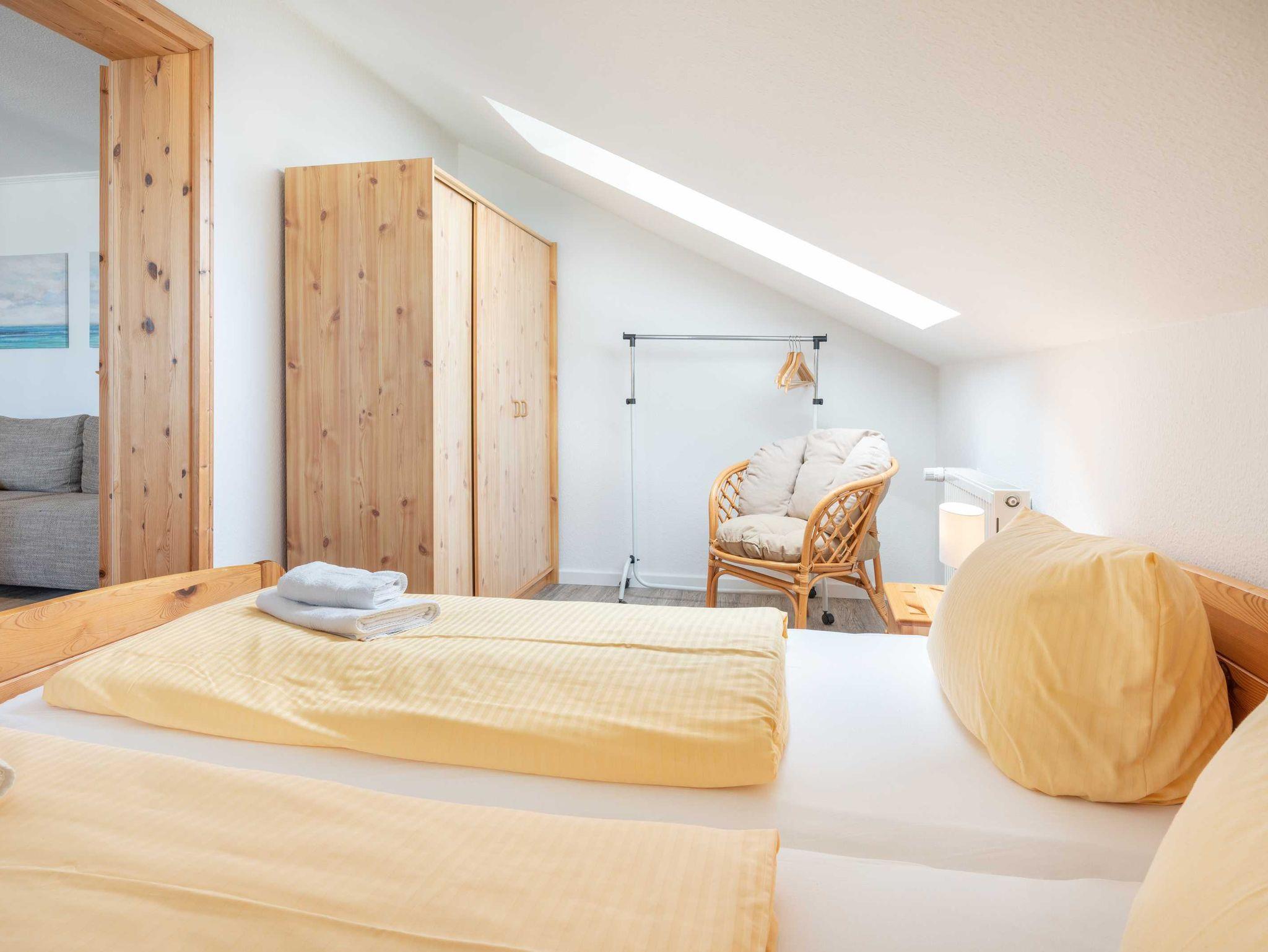Die 45 qm große Ferienwohnung 3 für bis zu 4 Personen befindet sich im Dachgeschoss zur Seeseite hin. Die verglaste Veranda (Wintergarten), liegt in Nordostrichtung mit Blick auf die Ostsee und lädt zum Schmökern und Relaxen ein. Das Schlafzimmer verfügt über ein 180 cm breites Doppelbett, ergänzt um ein ausziehbares Schlafsofa (140 cm) im Wohnzimmer. Die Küche ist komplett ausgestattet. Ideal ist die Ferienwohnung für zwei Personen oder eine dreiköpfige Familie.
