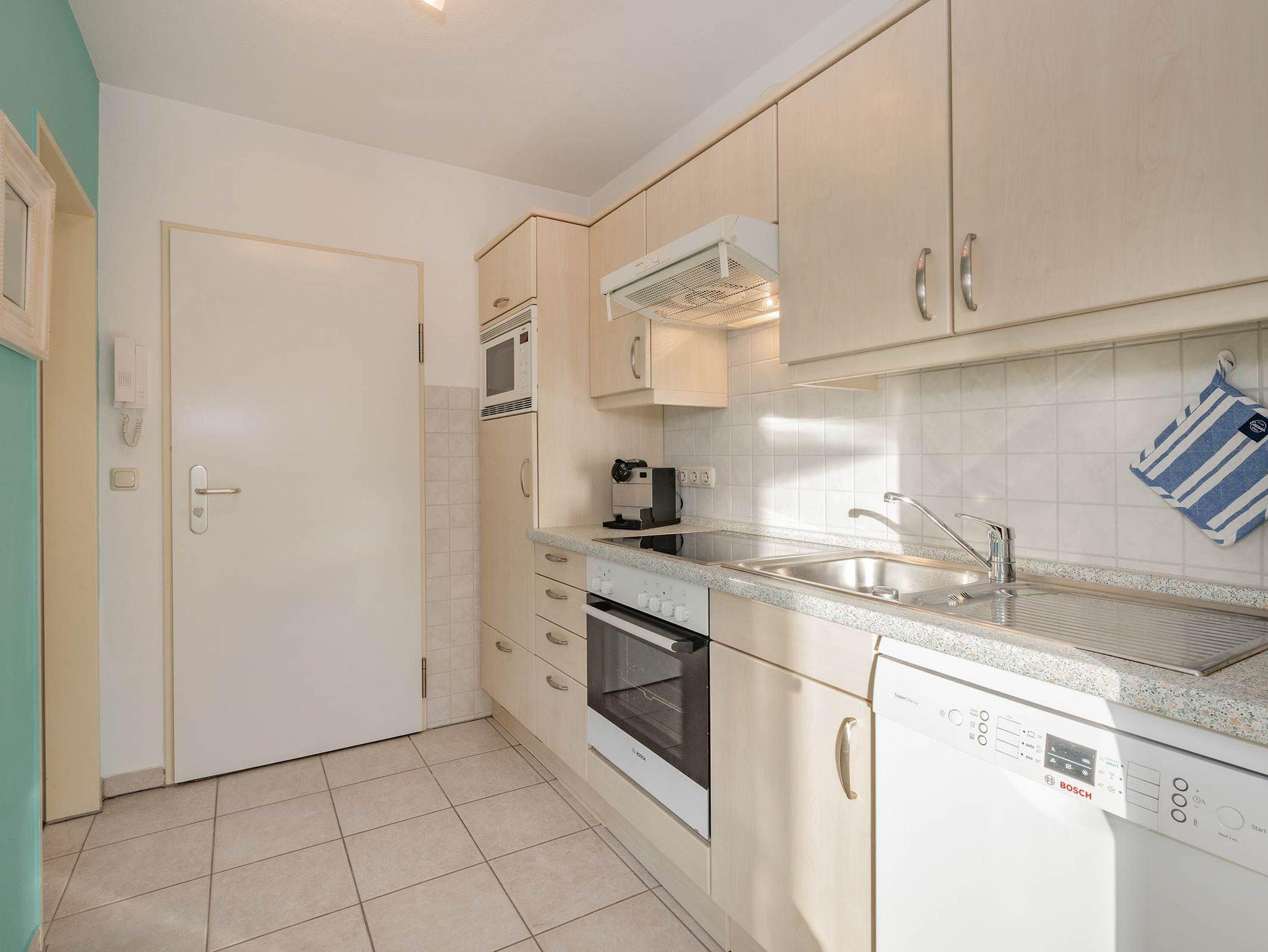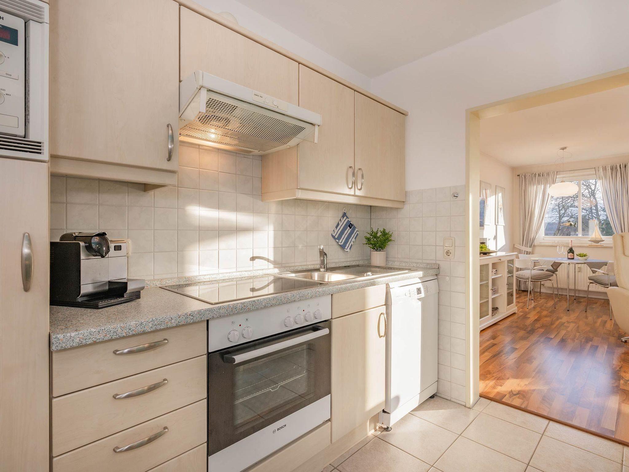 Die moderne Einbauküche lässt keine Wünsche offen. Sie ist mit einer Spülmaschine, einem Kühlschrank, einem Cerankochfeld, einem Backofen und einer Mikrowelle ausgestattet. Hier können Sie bequem Ihre Lieblingsgerichte zubereiten und den Essbereich im Wohnzimmer oder den Balkon für gemütliche Mahlzeiten nutzen.