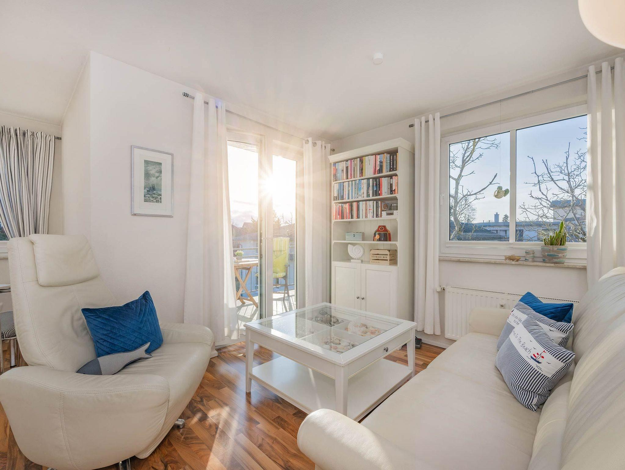 Die Ferienwohnung ist hell und modern gestaltet und bietet alles, was Sie für einen erholsamen Aufenthalt benötigen. Das Wohnzimmer ist mit einem hochwertigen Ledersofa und einem gemütlichen Sessel ausgestattet ? perfekt, um nach einem Tag am Strand zu entspannen. Ein wandmontierter Flatscreen-TV sorgt für Unterhaltung, während die bodentiefen Fenster viel Licht hereinlassen und eine angenehme Atmosphäre schaffen.