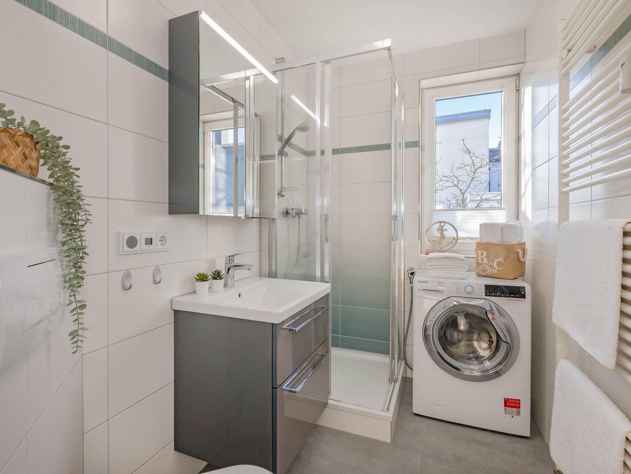 Das Badezimmer ist ebenfalls modern gestaltet und verfügt über eine Eckdusche, ein praktisches Wandradio für musikalische Begleitung und eine Waschmaschine, die Ihnen während Ihres Aufenthalts zur Verfügung steht.