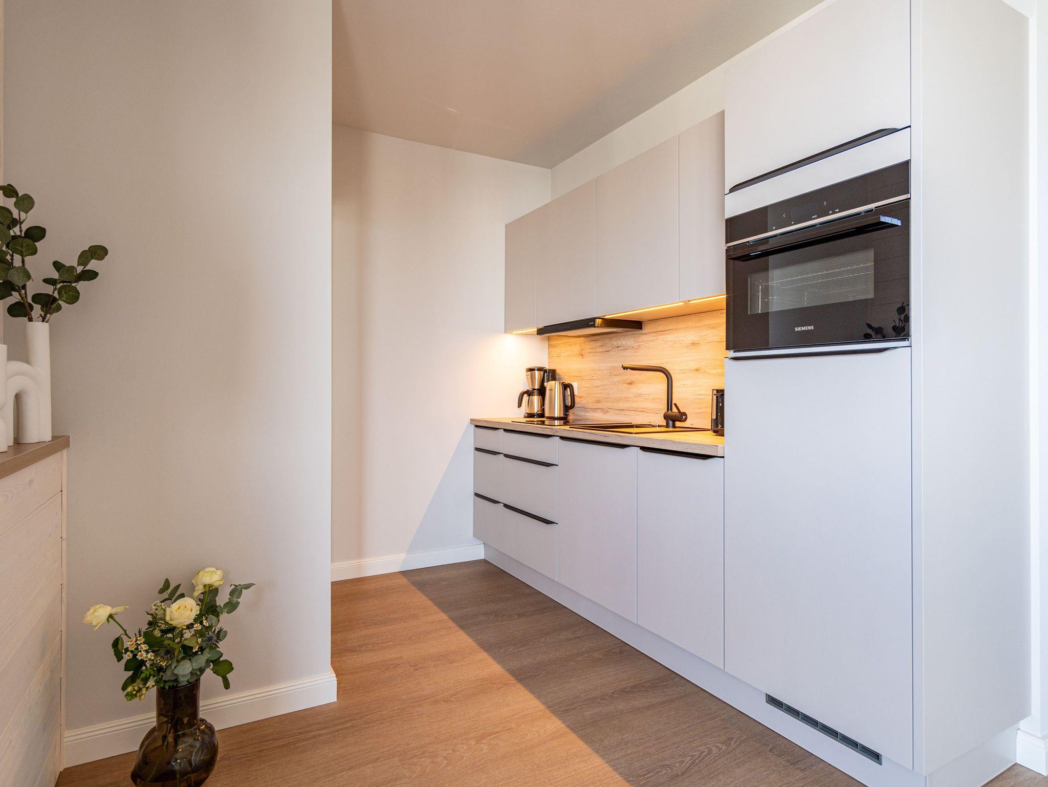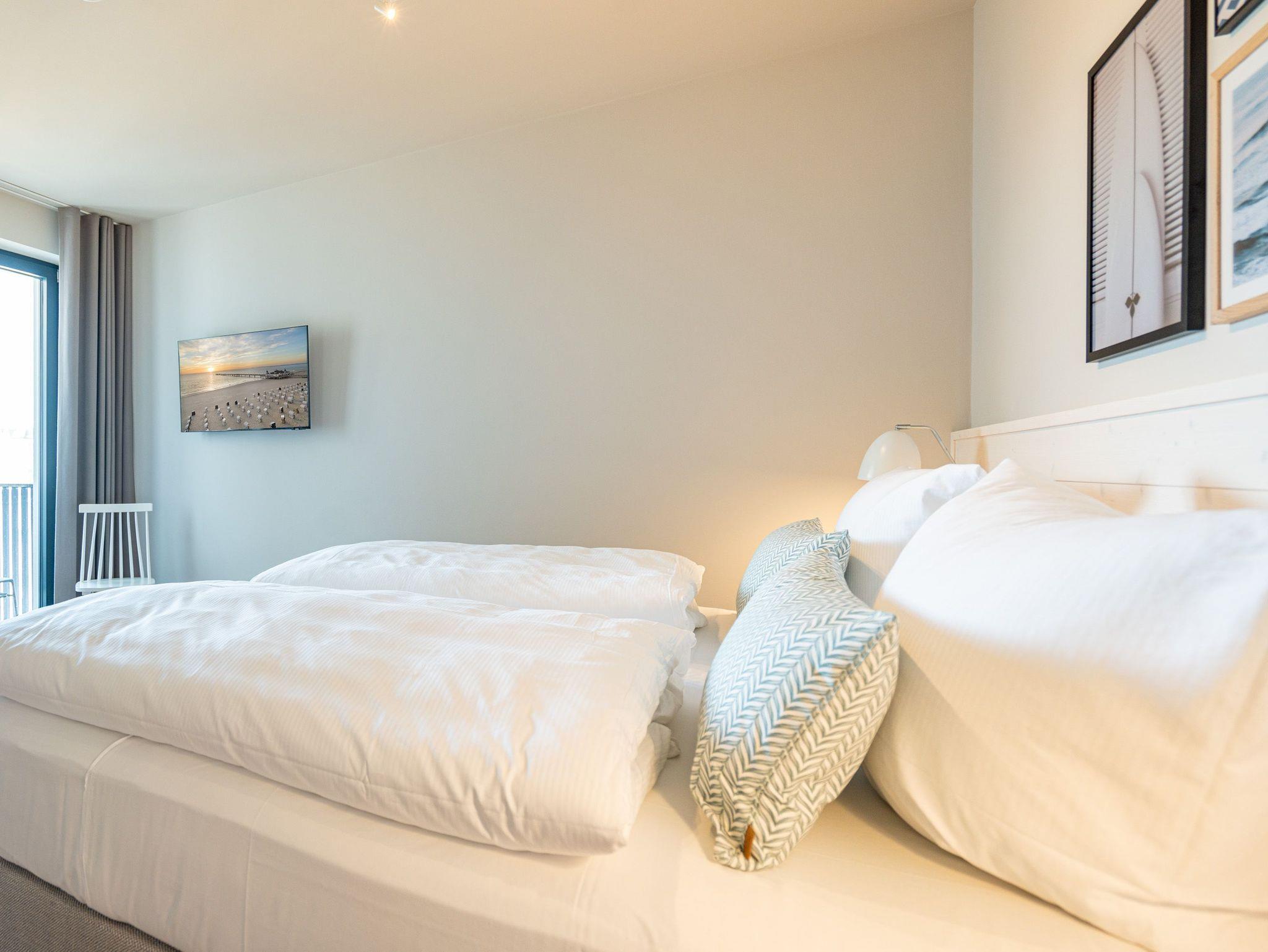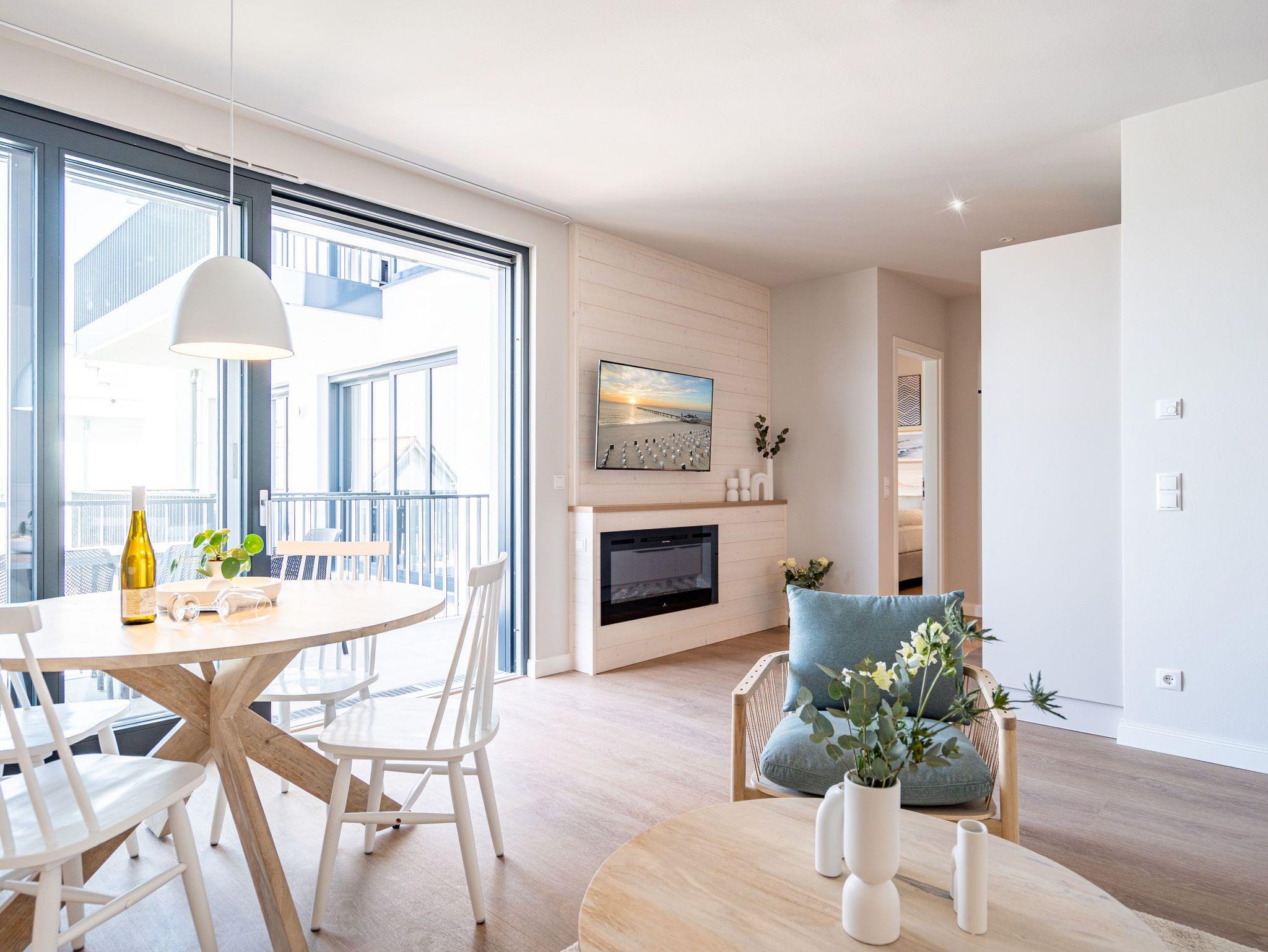 Die Nummer B 3.9 (Haus B) in der 3. Etage der Strandterrasse ist ein wunderschönes Appartement mit Blick über die Dächer von Ahlbeck und über die Ostsee. Einfach mal abschalten und die Zeit, Zeit sein lassen, runterkommen und an einem wunderschönen Wohlfühlort neue Energie tanken, das können Sie in den 60 Quadratmetern dieser charmanten Ferienwohnung auf jeden Fall. Viel Komfort und Gemütlichkeit erwarten die bis zu 2 Gäste hier. Auch ein kleines Kind (bis 5 Jahre) wird hier ein tolles Urlaubszuhause vorfinden. Das Wohnzimmer ist das Herzstück des Appartements. Ein bequemes Sofa lädt zum Faulenzen und Entspannen ein. Ein Elektrokamin (ohne Wärmeabgabe) schafft mit seinem Flammenspiel selbst an Sommerabenden eine romantische Atmosphäre. Schauen Sie sich auf dem großen Flat-TV (50 Zoll) Ihren Lieblingsfilm an oder streamen Sie Ihre Lieblingsserie. Eine offene Küche bietet zum Kochen viele moderne Annehmlichkeiten. Sie ist mit hochwertigen Siemensgeräten wie einem Backofen, einem 3-Platten-Induktionsherd, einem Geschirrspüler und vielem mehr ausgestattet. Ob Kaffeemaschine oder Nespresso-Kapselmaschine ? ein guter Morgenkaffee ist der beste Start in den Urlaubstag. Dem steht hier nichts im Weg. Genießen Sie ihn beim Frühstück am schönen Esstisch oder auf dem Nord-West-Balkon mit Blick aufs Meer und der Ostseebrise in der Nase. Jetzt kann?s losgehen ? an den Strand, der direkt vor der Haustür liegt oder über die Insel. Frische Seeluft macht bekanntlich müde. Damit Ihre Träume süß und die Nächte erholsam werden, steht Ihnen im Schlafzimmer ein komfortables Boxspringdoppelbett (1,80m x 2,00m) zur Verfügung. Auch Ihr Kind wird in seinem Kindertagesbett (0,80m x 1,40m) himmlisch schlafen. Zum Schlafzimmer gehört außerdem ein geräumiger Kleiderschrank und ein Flat-TV (43 Zoll). Das Badezimmer ist modern mit Dusche, Waschtisch und WC bestückt. Und für wohlige Entschleunigung an kühlen Abenden sorgt eine Infrarotsaunakabine. Damit Ihre Auszeit vom ersten Moment an entspannend ist, brauchen Sie nicht lange nach einem Parkplatz zu suchen. In der Tiefgarage gehört zu Ihrer Wohnung ein PKW-Stellplatz dazu. Sie können sich also von Anfang an auf eine schöne Ostseeauszeit freuen.
