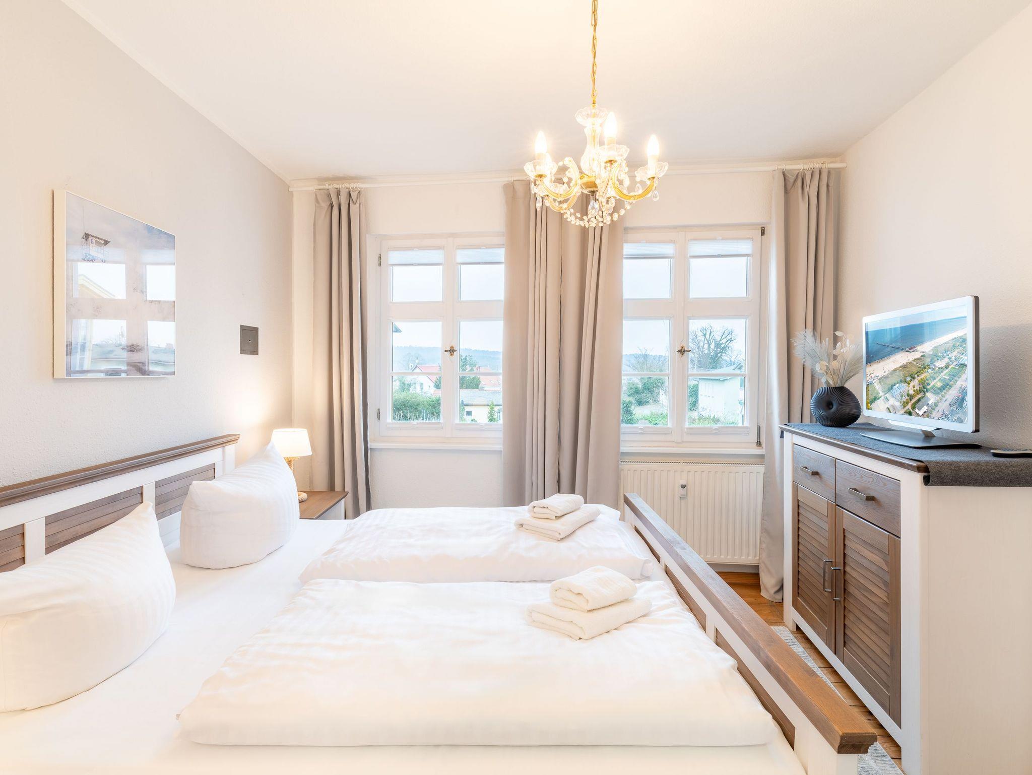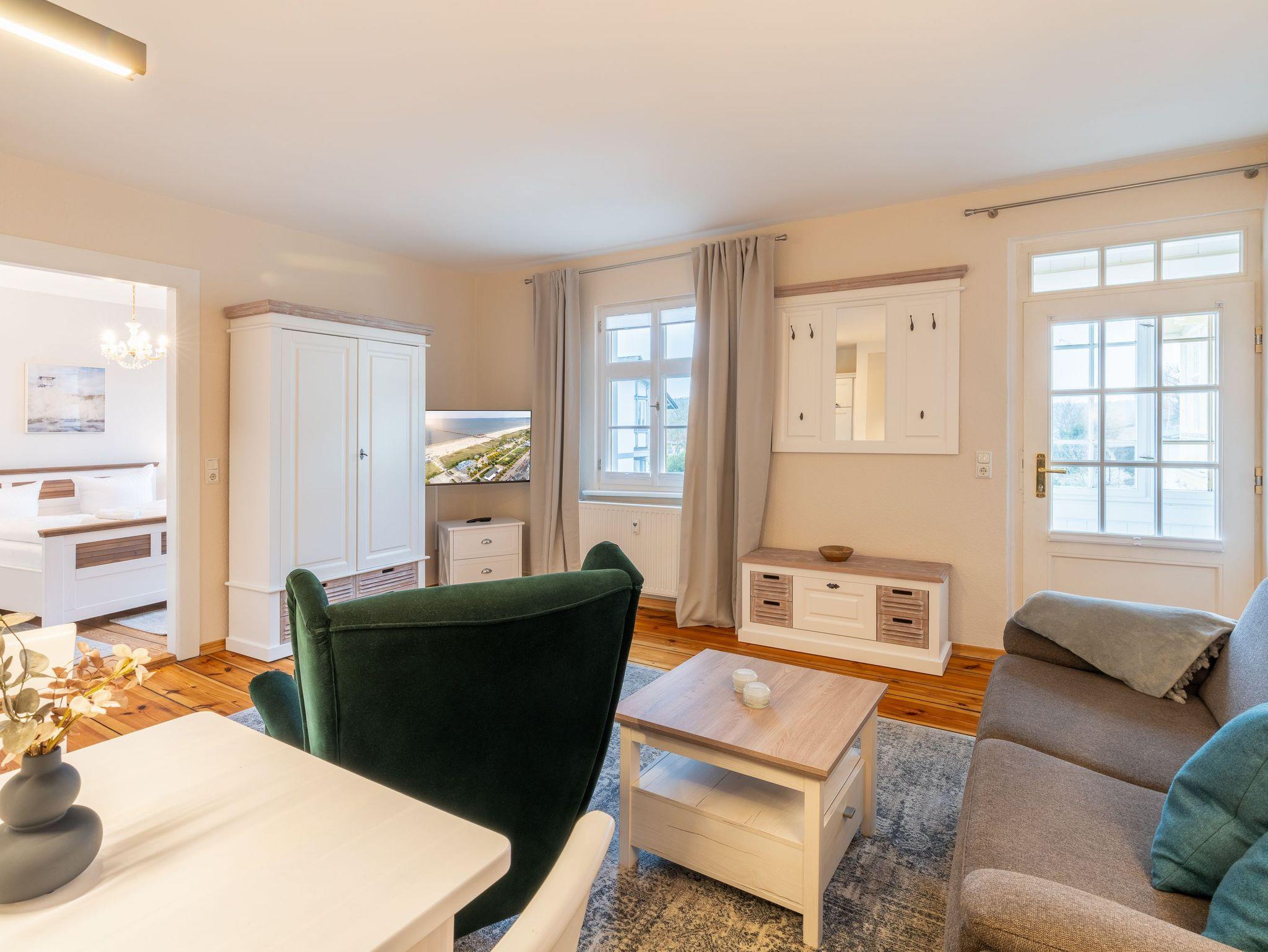 Das stillvoll neu möblierte 2-Raum-Appartement im Glanz der alten Bäderarchitektur befindet sich im 1. Obergeschoss und verspricht eine erholsame Urlaubszeit auf 41 Quadratmetern mit bis zu 4 Personen.