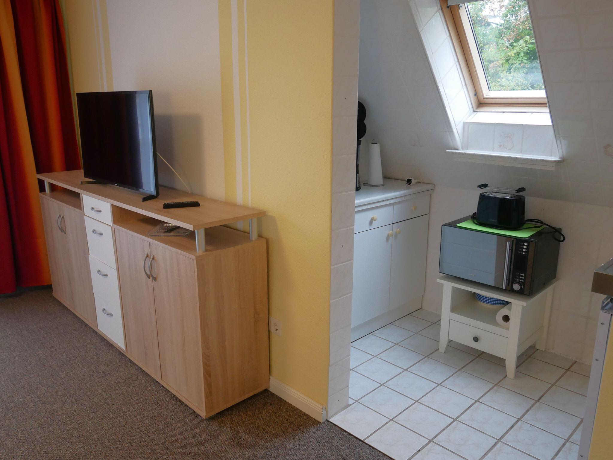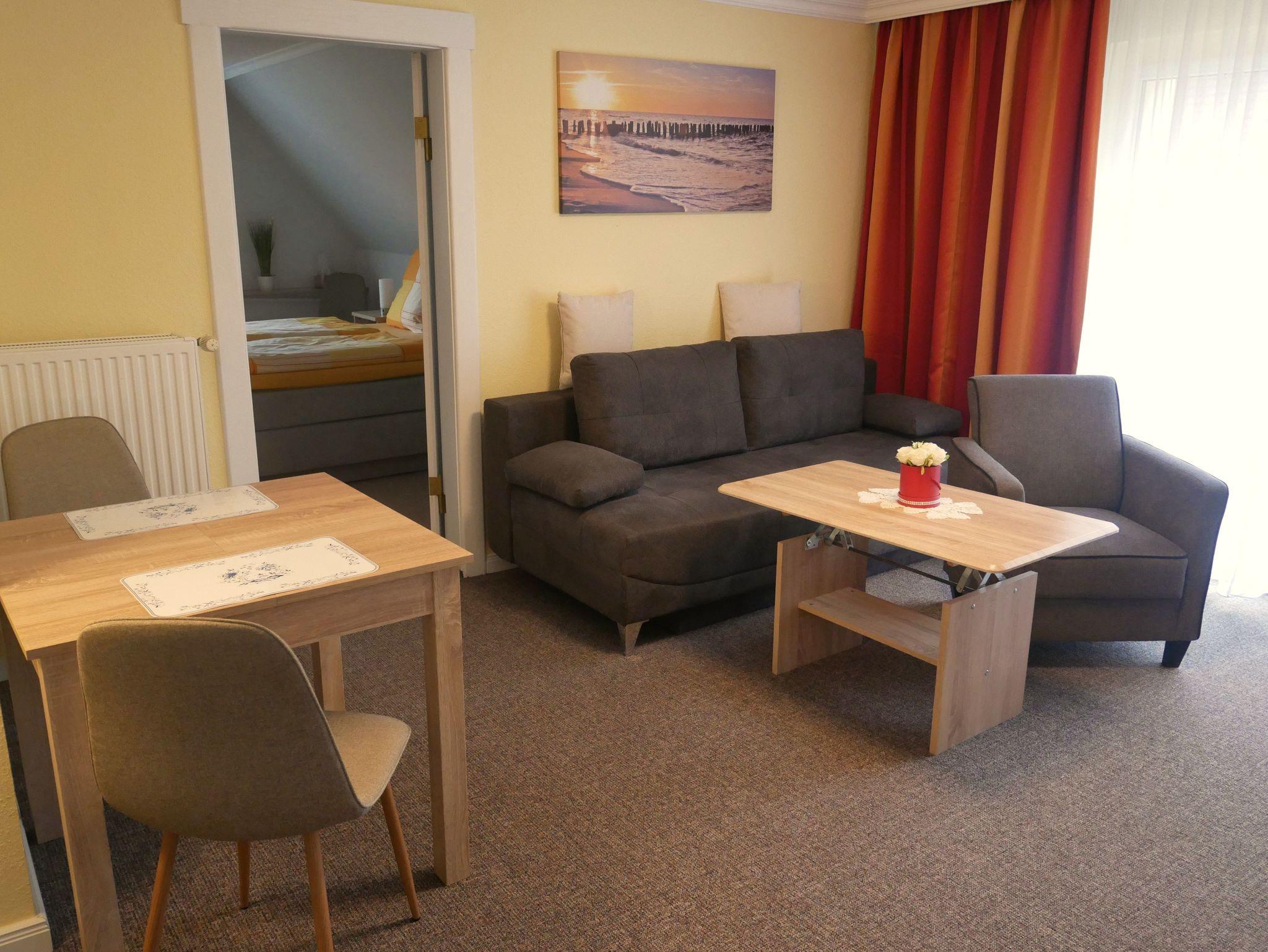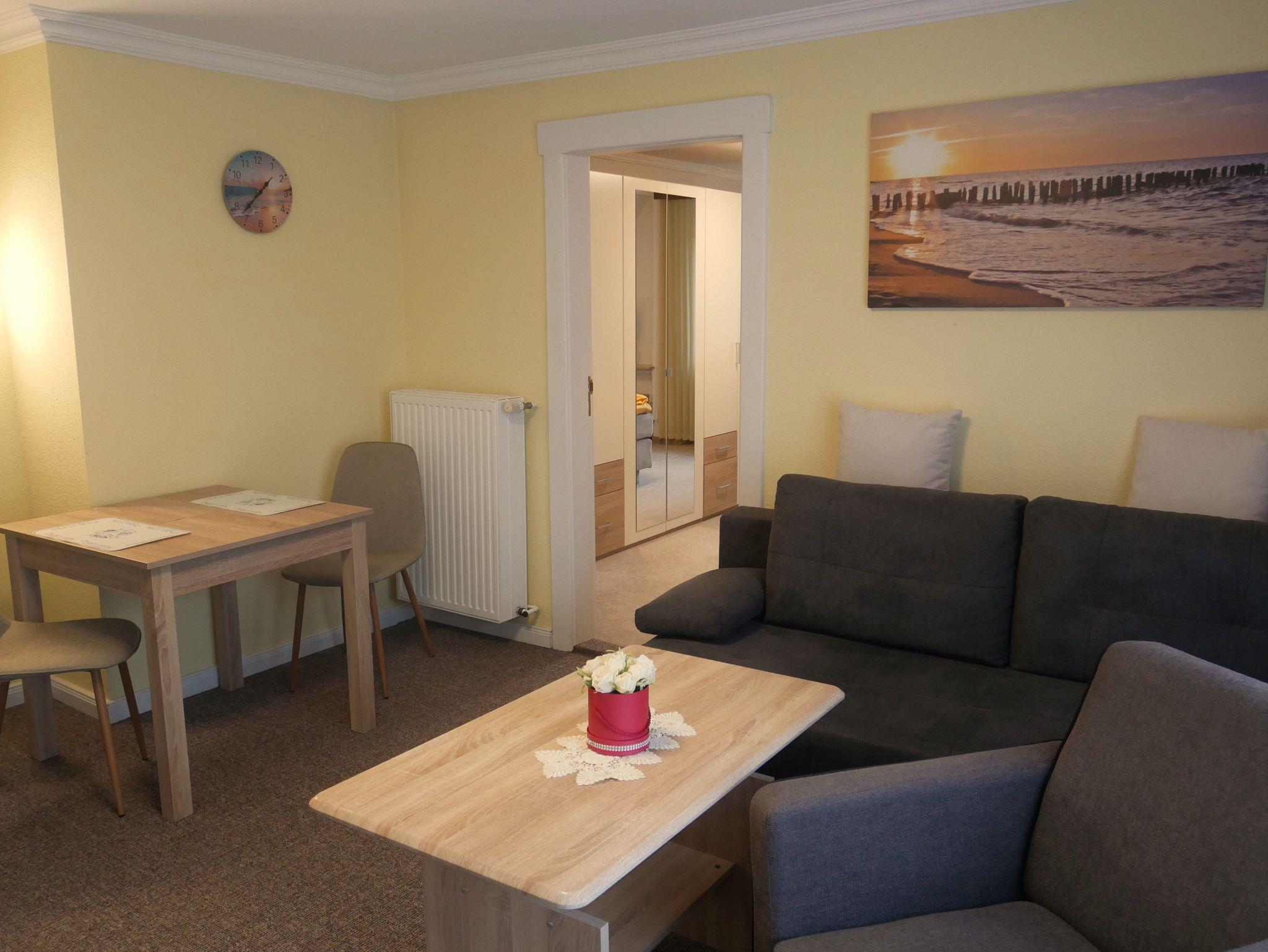 Die moderne und gemütliche 2-Raum-Fereinwohnung ist ca. 46m² groß und befindet sich im ersten Obergeschoss des Hauses. Das Wohnzimmer ist mit einer Couchsitzgruppe (ausklappbare Couch, Liegefläche 1,50 x 1,90 m), Couchtisch, Flachbild-TV und mit einem Radio ausgestattet. Das Schlafzimmer verfügt über ein Doppelbett und über einen Kleiderschrank. Die separate Pantry-Küche ist ausgestattet mit einem 2-Platten-Herd, Kühlschrank, Kaffeemaschine, Wasserkocher, Mikrowelle und mit einem Toaster. Der Essbereich ist im Wohnzimmer integriert. Das Badezimmer ist mit einer Dusche/WC ausgestattet.
