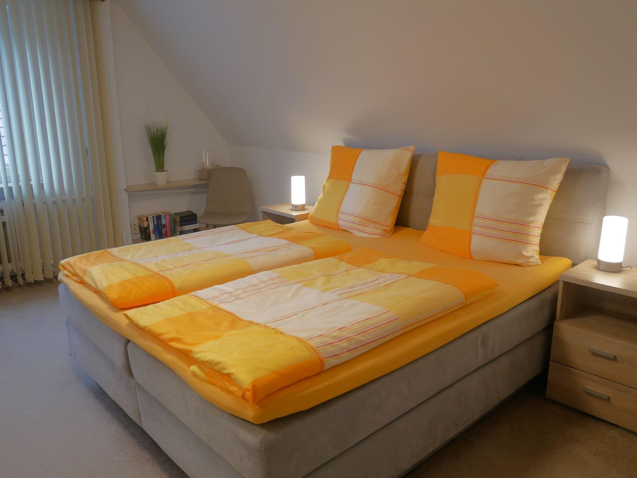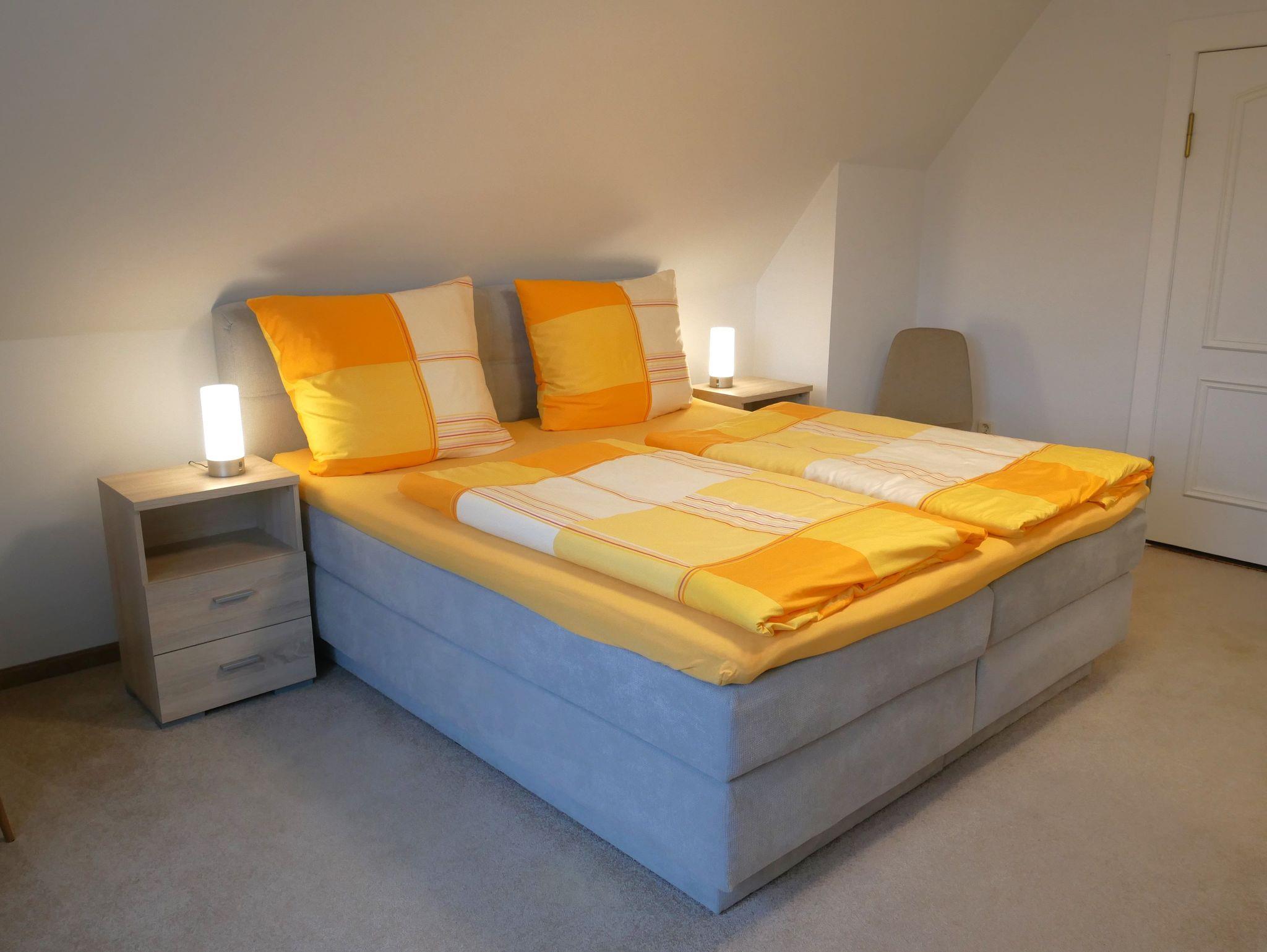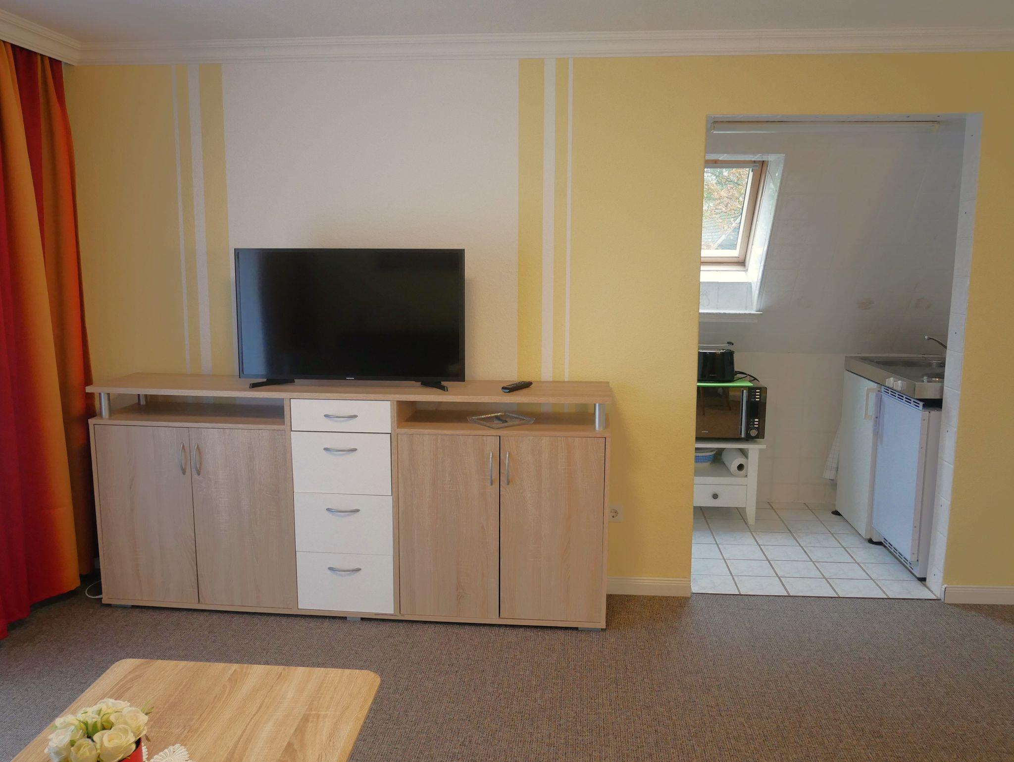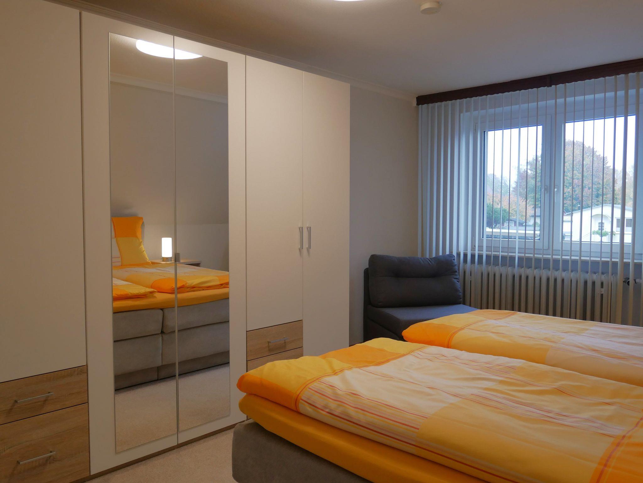 Die moderne und gemütliche 2-Raum-Fereinwohnung ist ca. 46m² groß und befindet sich im ersten Obergeschoss des Hauses. Das Wohnzimmer ist mit einer Couchsitzgruppe (ausklappbare Couch, Liegefläche 1,50 x 1,90 m), Couchtisch, Flachbild-TV und mit einem Radio ausgestattet. Das Schlafzimmer verfügt über ein Doppelbett und über einen Kleiderschrank. Die separate Pantry-Küche ist ausgestattet mit einem 2-Platten-Herd, Kühlschrank, Kaffeemaschine, Wasserkocher, Mikrowelle und mit einem Toaster. Der Essbereich ist im Wohnzimmer integriert. Das Badezimmer ist mit einer Dusche/WC ausgestattet.
