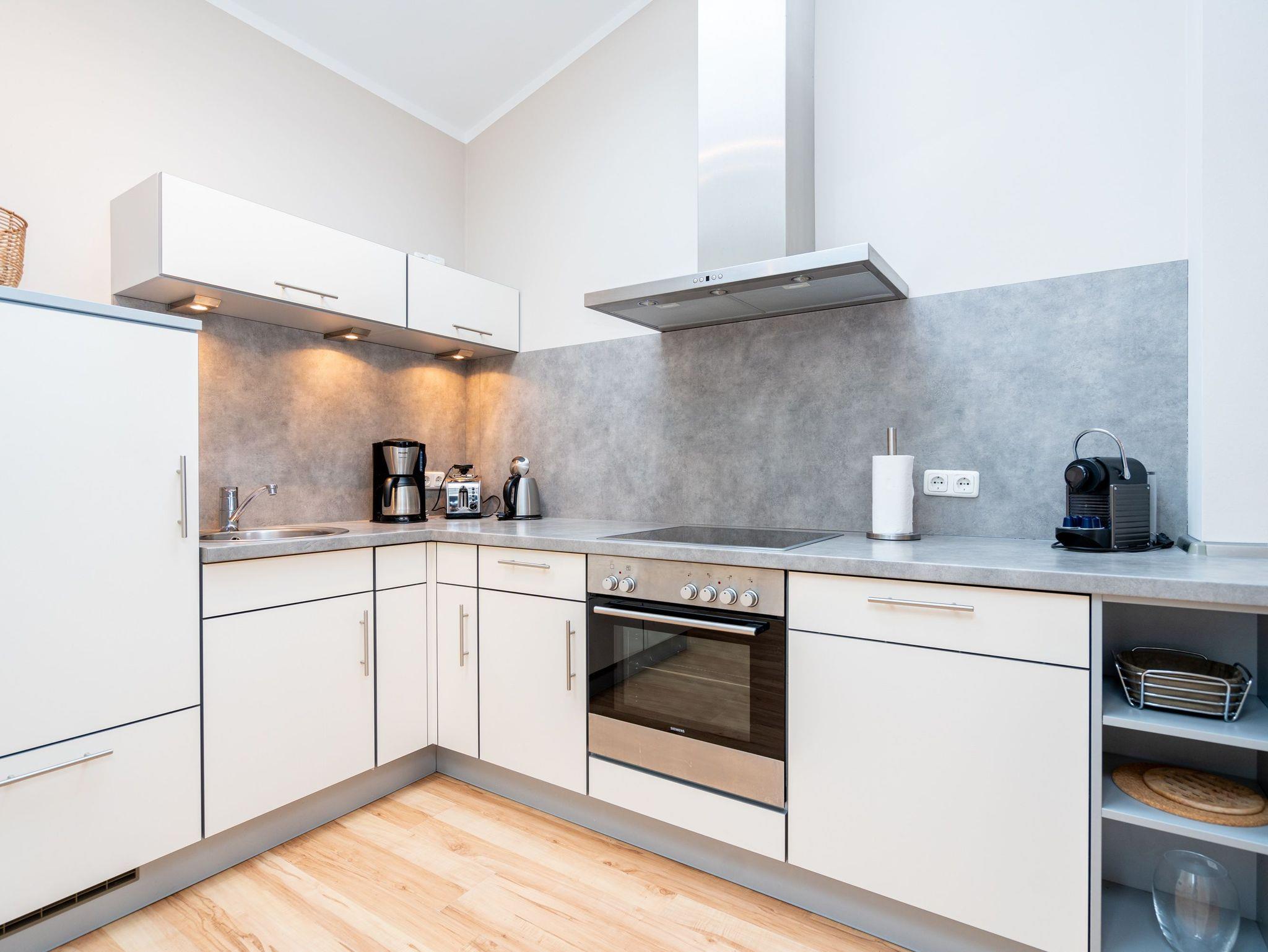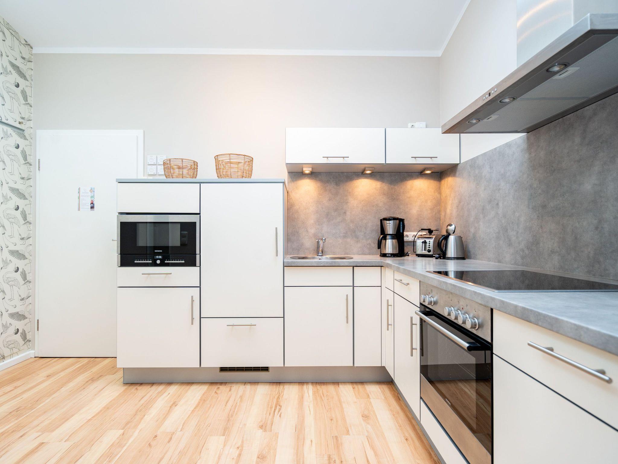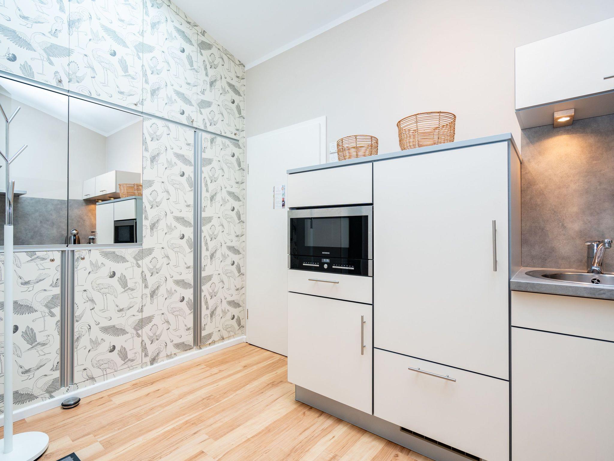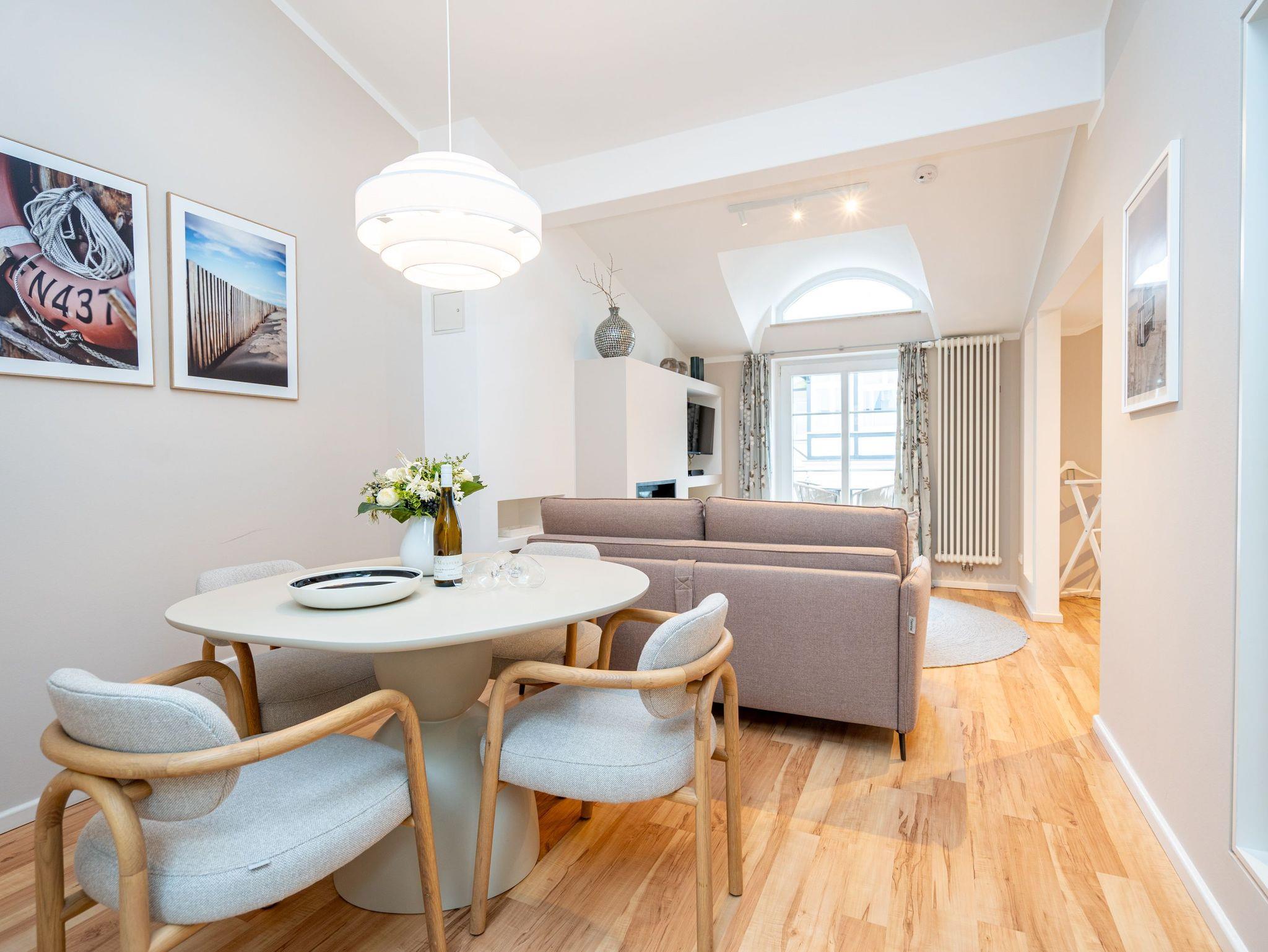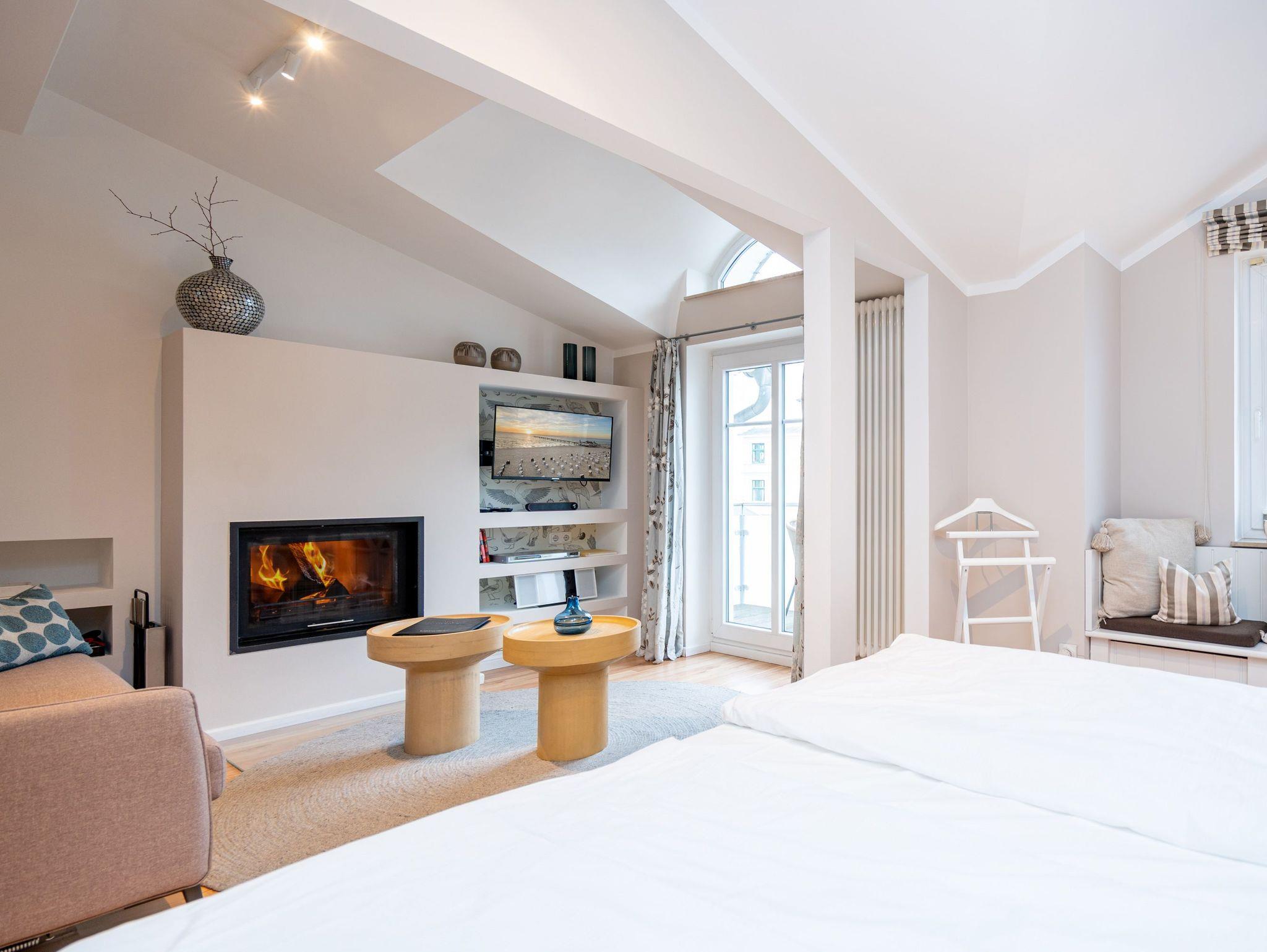Bezaubernde Ferienwohnung mit lauschigem Suite-Charakter für 2 Personen! Im Dachgeschoss des Hauses heißt Sie dieses charmante 2-Raum-Appartement willkommen und lädt ein zu kuschligen Stunden am Kamin. Lümmeln Sie dabei nach Herzenslaune auf dem Sofa oder im Bett ? das offene Schlafzimmer bietet Blick auf TV und Kamin. Die Möblierung des Appartements: leicht, luftig mit warmen Sandtönen und überaus liebevoll und komplett ausgestattet, mit technischen Feinheiten (Flat-TV, DVD, Minianlage). Die voll ausgestattete, offene Küche und ein großzügiges Bad mit Dusche und WC ergänzen die Räumlichkeiten. Ein kleiner, möblierter Balkon bietet sogar Ausblick auf die Ostsee. Für den Tag am Meer steht Ihnen als besonderes Bonbon von Mitte Mai bis Ende September (je nach Witterung) ein Strandkorb am Strand kostenlos zur Verfügung. Das WLAN-Netz im Haus kann kostenfrei genutzt werden. Zur Wohnung gehört der wohnungseigene Tiefgaragenstellplatz Nr. 11 ? reserviert und bequem erreichbar. Ankommen und Wohlfühlen!