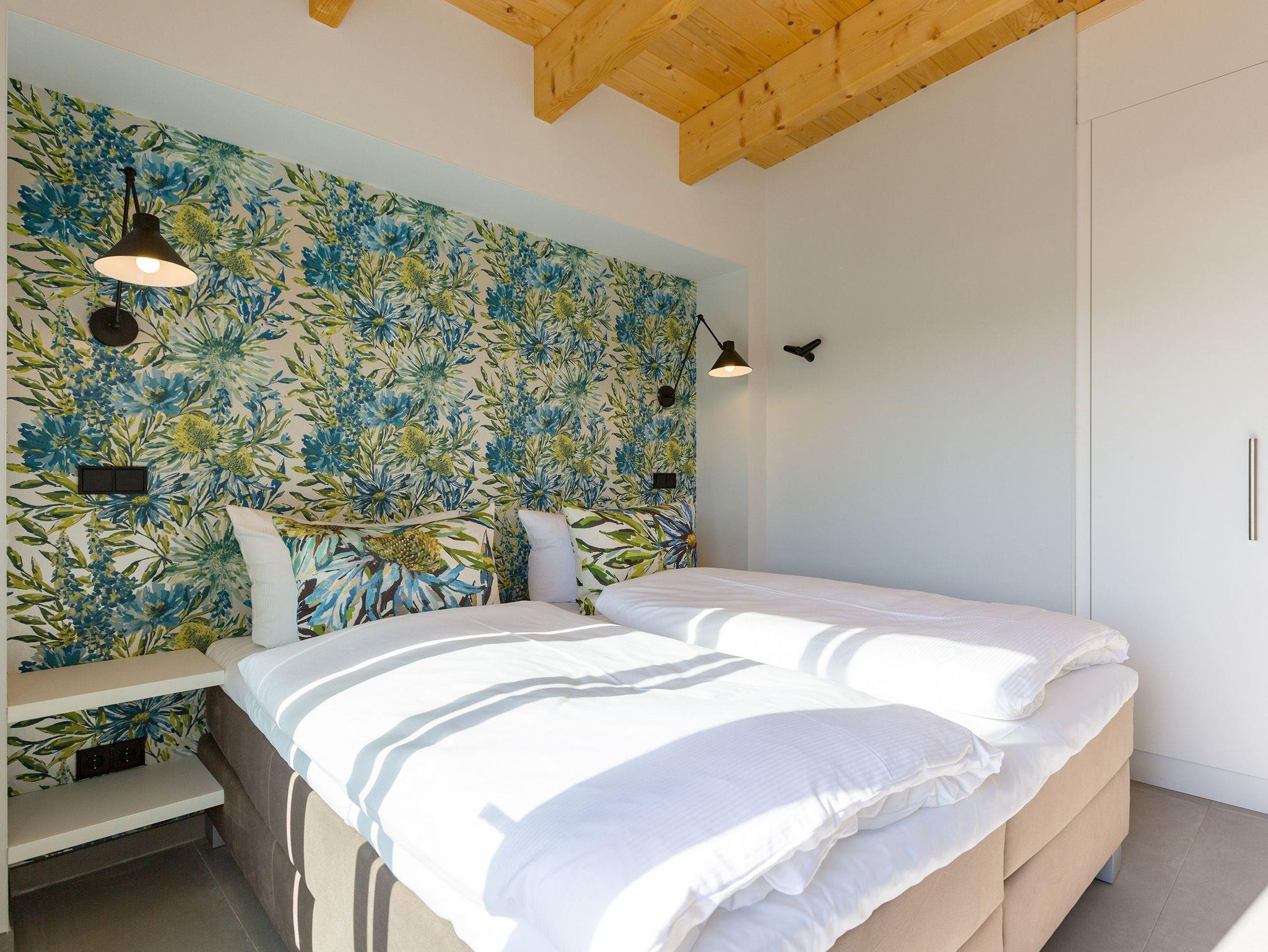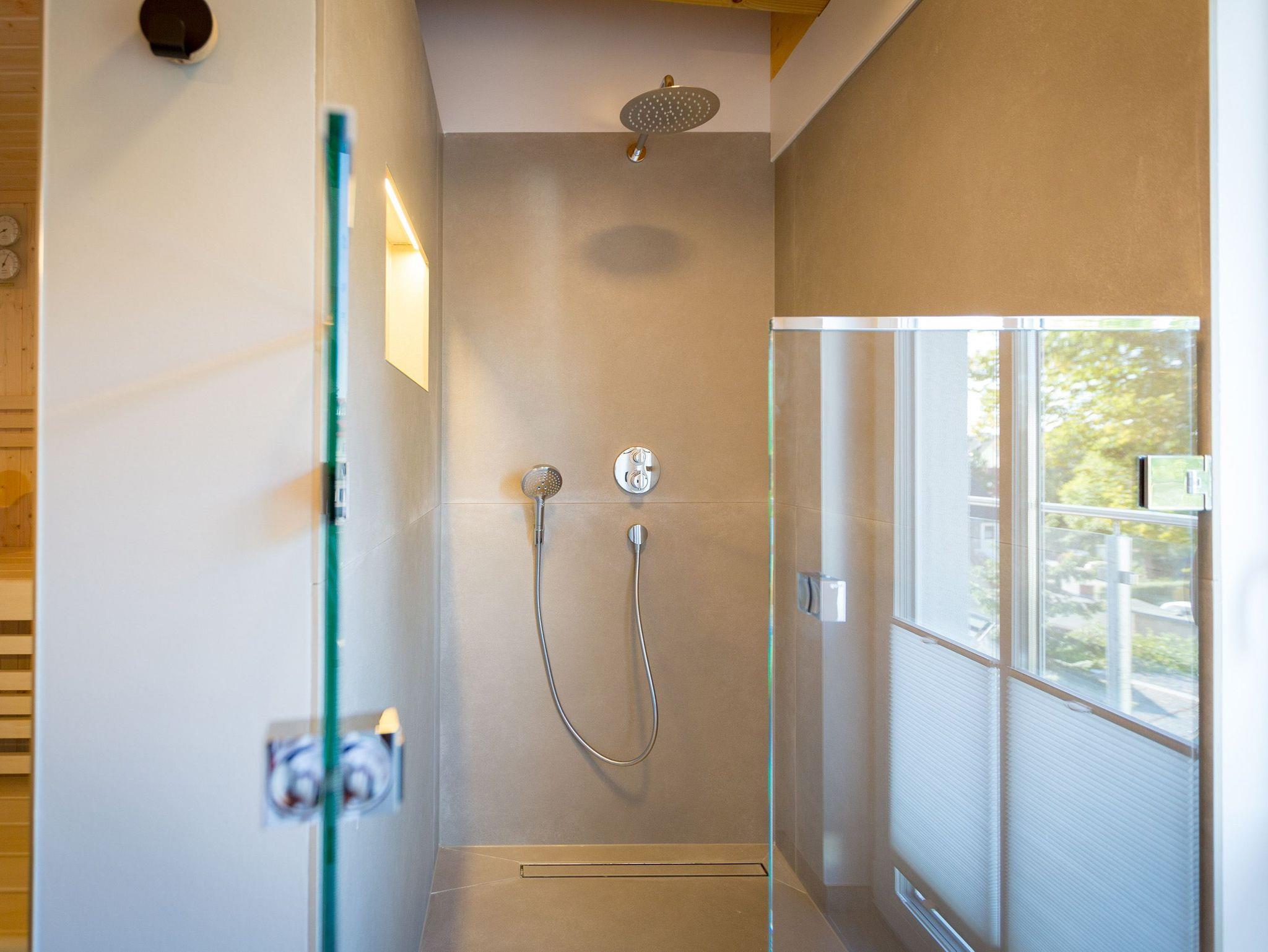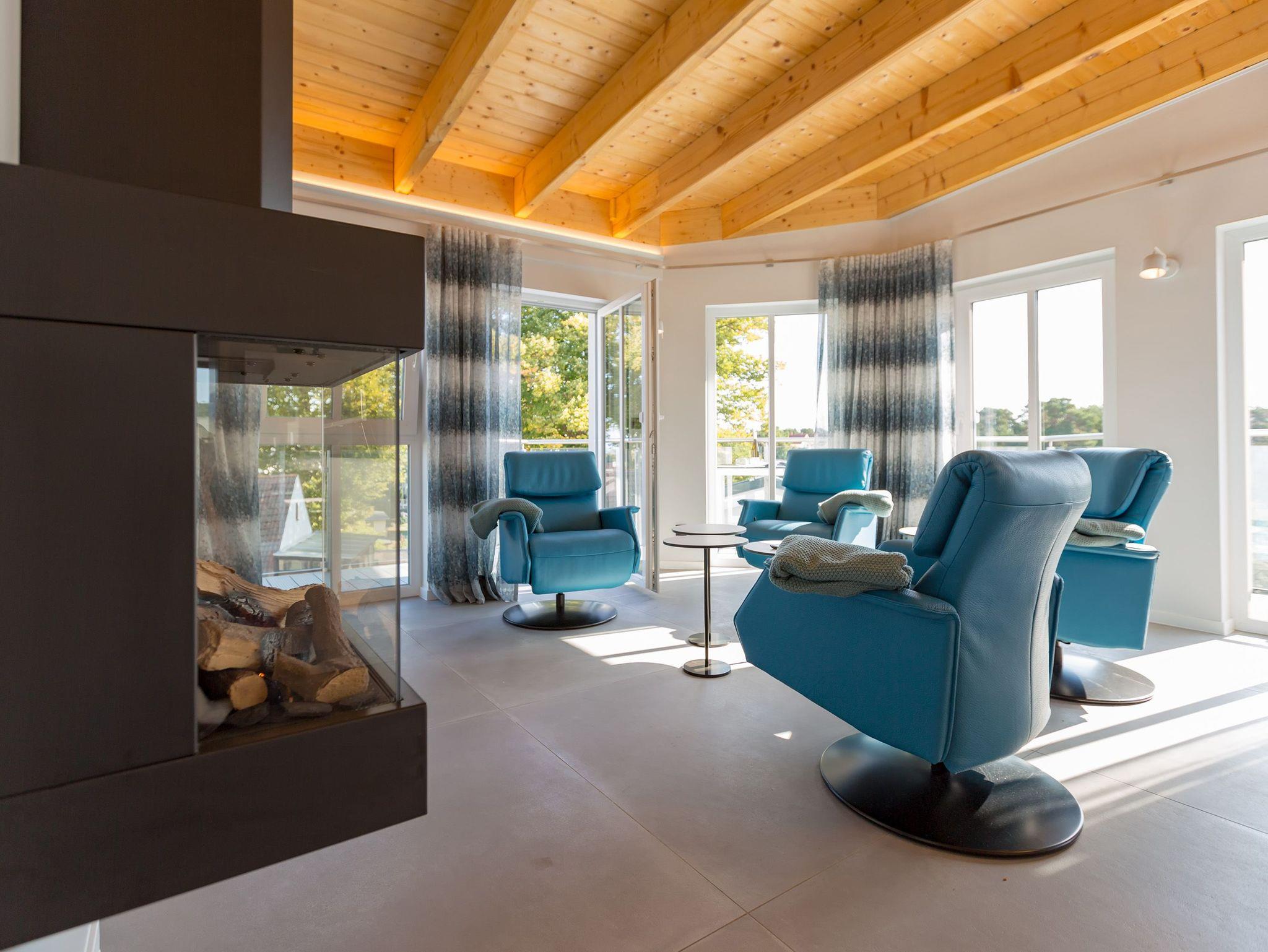 Exklusives und modernes Wohnflair mit Meerblick bietet dieses 84 Quadratmeter große barrierefreie Urlaubsparadies in seinen drei Räumen im Penthouse des Domizils Düne 8. Entspannen Sie hier mit bis zu 4 Personen und einem Kleinkind bis 3 Jahre (im Kinderreisebett). Eine hohe, offene Holzbalkendecke, stylische Designmöbel, ein moderner Gas-Kamin ? eine Wohlfühlwelt, in der man wunderbar abschalten kann. Eine umlaufende Sonnenterrasse mit Meerblick (ges. 33m²)lädt zum Verweilen ein. So entspannend sollte Urlaub sein! Im Inneren erwarten Sie lichte und hohe Räume. Die Ledersessel vor dem großen Flat-TV im offenen und großzügig geschnittenen Wohn-Ess-Zimmer lassen sich bequem in eine Liegeposition verstellen, so dass jeder seine eigene, kleine Relax-Area bekommt. Verbindungsglied zwischen dem Wohnbereich und der mit hochwertigen Markengeräten voll ausgestatteten Küche ist ein wunderschöner Essplatz mit stylischem Esstisch im Industriallook und bequemen Schalensesseln. Die Küche ist absolut modern mit einer freistehenden Kochinsel, High End-Kochfeld mit integriertem Dunstabzug und edlem Geschirr eingerichtet. Die beiden Schlafzimmer ? eines sogar mit Zugang zur großen Terrasse ? verwöhnen mit Behaglichkeit und viel Stauraum. Komfortable Boxspringdoppelbetten (1,80 m x 2,00 m) sorgen für Schlafvergnügen und die passgenauen Einbauschränke bieten ausreichend Ablagefläche. In beiden Zimmern gibt es einen Flat-TV. Die beiden Tageslicht-Bäder verfügen über eine Regendusche, einen Waschtisch und ein WC. Ein kleines Highlight wartet darüber hinaus zusätzlich in einem der Badezimmer auf Sie: Entspannen und genießen Sie Ihre Auszeit erst so richtig in der eigenen, Finnischen Sauna. Da freut man sich sogar auf kühlere Abende oder ungemütliche Herbst- oder Wintertage. Sie wollen auch im Urlaub im Internet surfen? Kein Problem! Das WLAN ist kostenfrei. Für Ihren Komfort sind die Betten bei Ihrer Anreise bezogen. Und auch für Ihr Auto ist gesorgt. Einen überdachten Pkw-Außenstellplatz gibt es am Haus. Außerdem gehört zu der Wohnung ein eigener Fahrradabstellraum.
