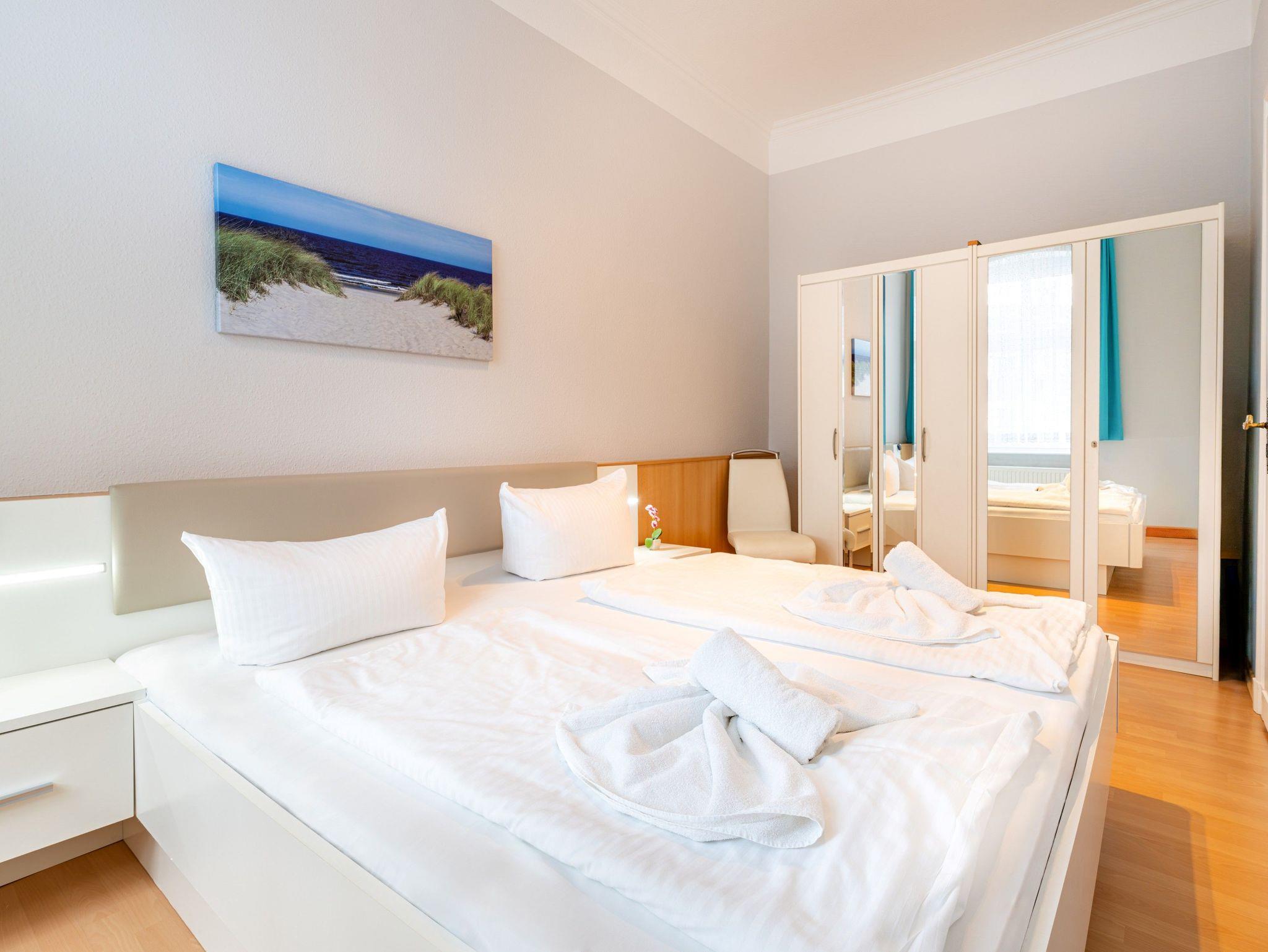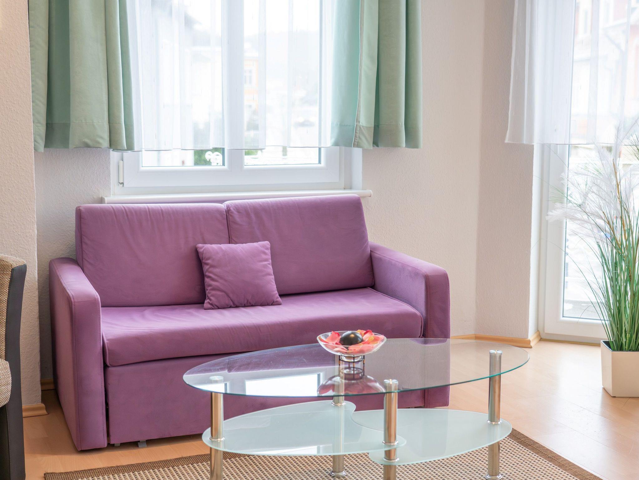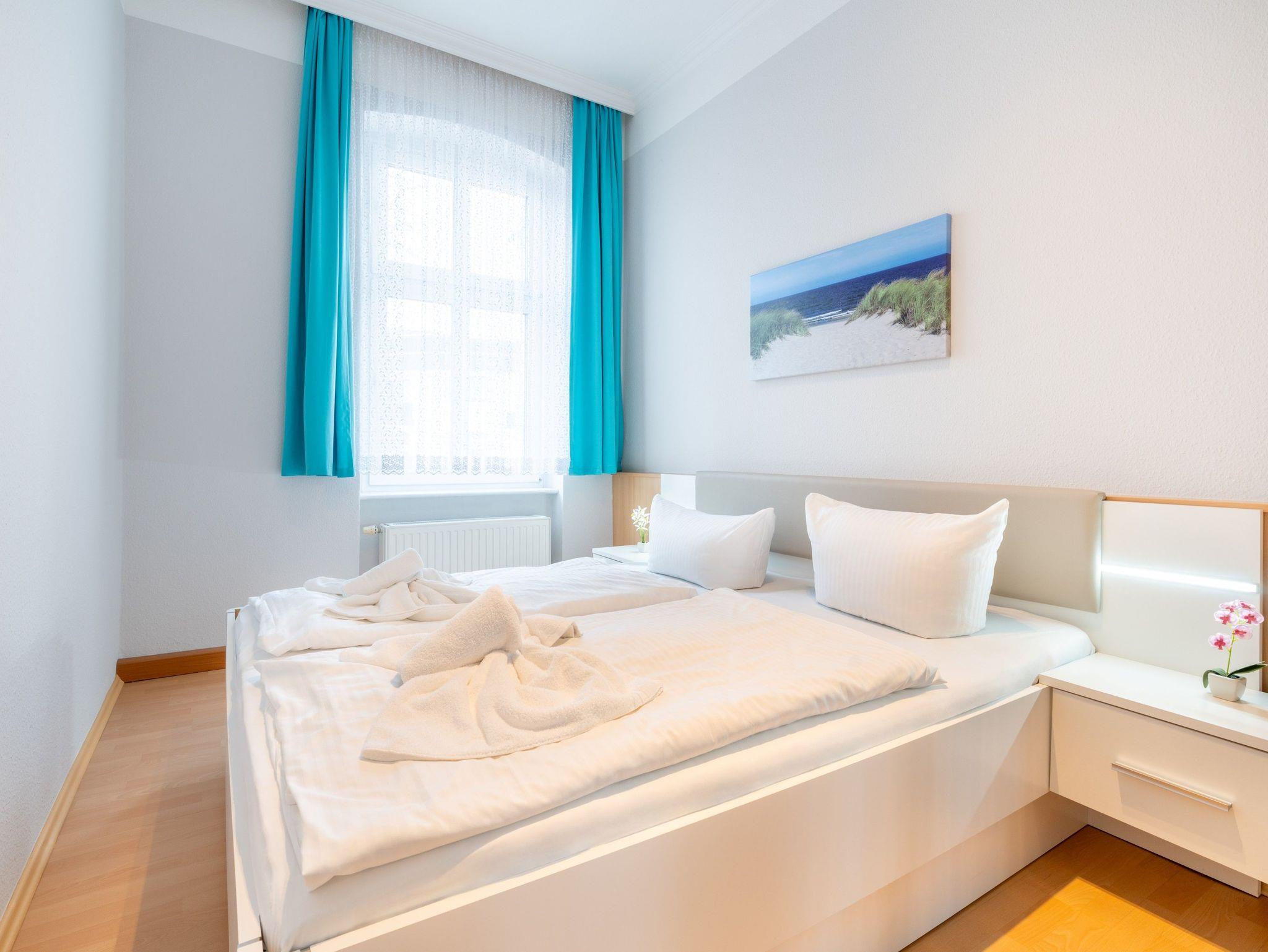 Die Wohnung im ersten Obergeschoss verfügt über ein Wohnzimmer mit Sitzecke, einer Liege als Schlafmöglichkeit und einem Sessel. Vom Wohnzimmer aus erreichen Sie den kleinen Balkon. Das Schlafzimmer ist mit einem Doppelbett ausgestattet.