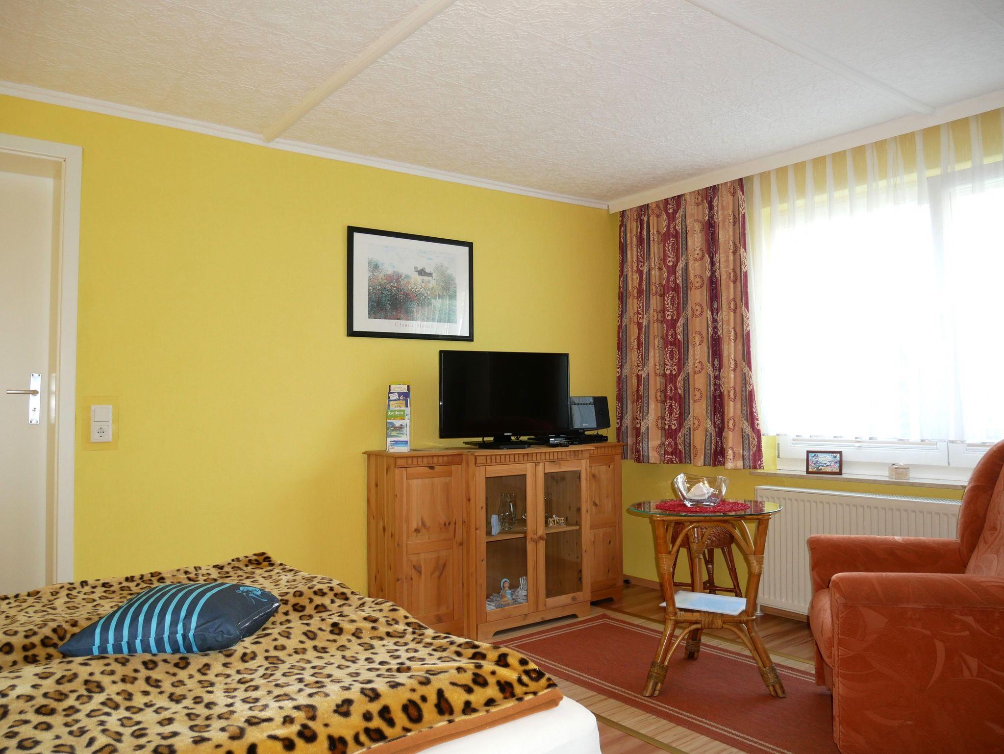 Ein Schlafzimmer ist mit einem Doppelbett ausgestattet und dient gleichzeitig als kombiniertes Wohn- und Schlafzimmer. Hier finden Sie zusätzlich eine gemütliche Couch sowie einen Fernseher für entspannte Abende.