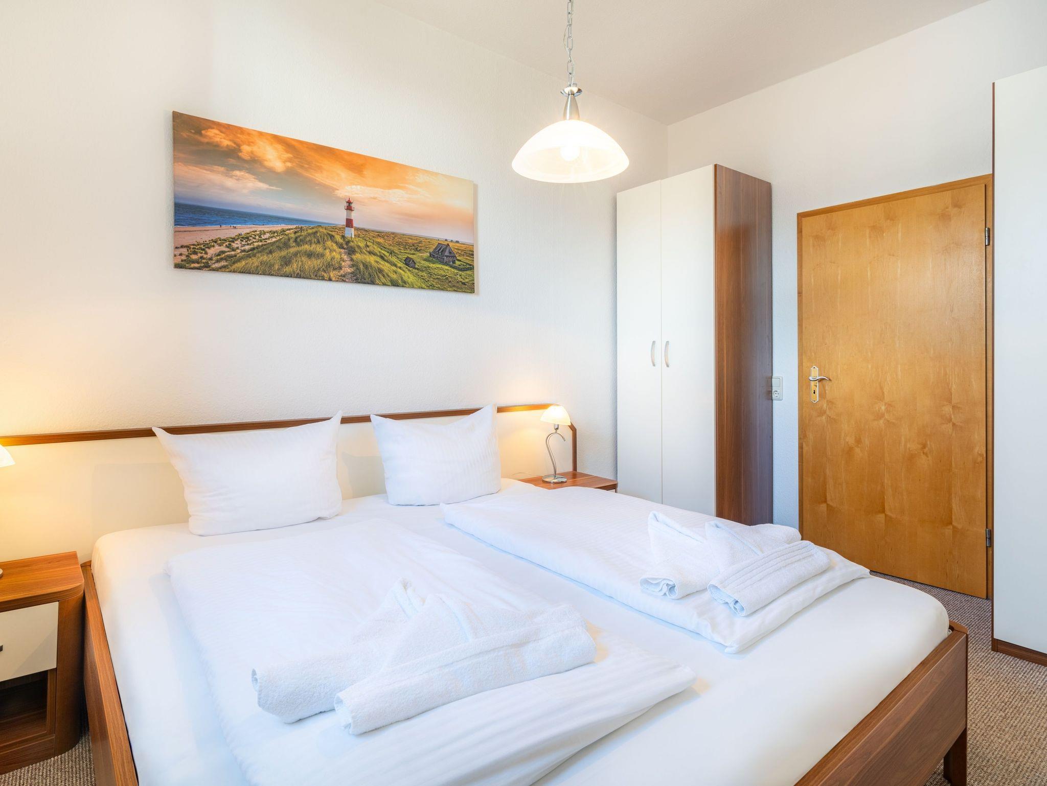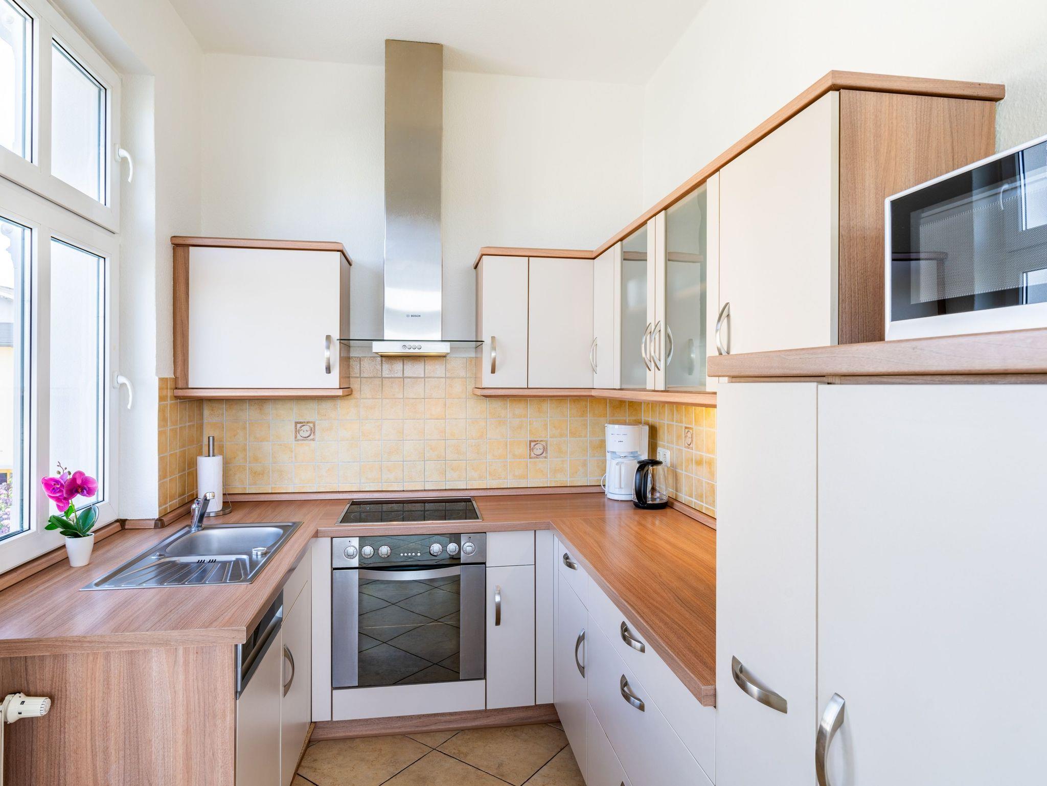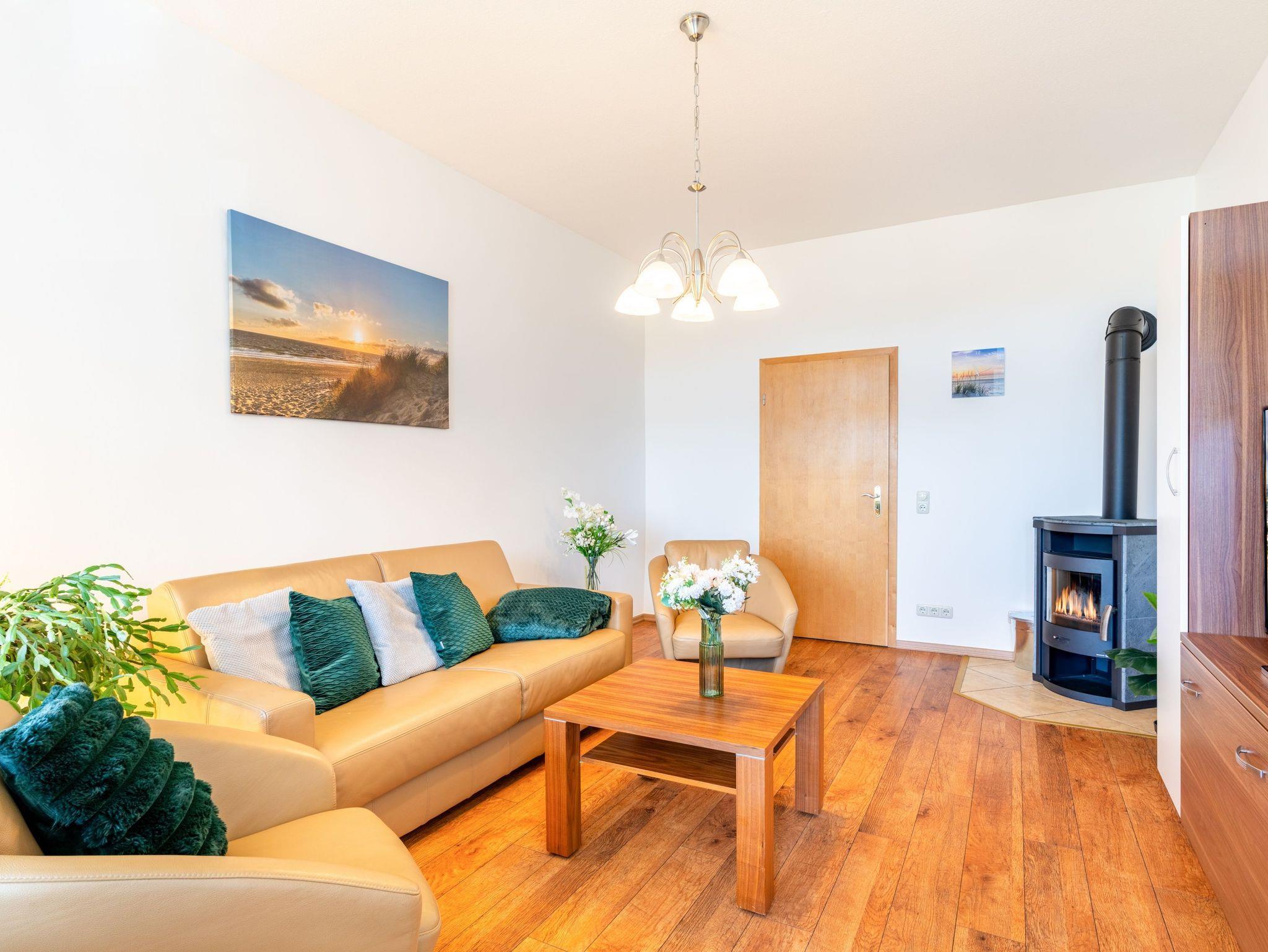 Das 65 qm große Appartement in ersten Obergeschoss verfügt über ein Wohnzimmer mit moderner Couchecke, TV und Kamin. Die separate Küche ist mit Backofen, Spülmaschine, Mikrowelle Ceranherd, Kühlschrank und vielen weiteren Küchenutensilien ausgestattet. Die Küche erreichen Sie über die großzügige Veranda mit Essplatz. Das erste Schlafzimmer ist mit Doppelbett ausgestattet, das zweite Schlafzimmer mit einem Einzelbett und TV. Bad mit Dusche und WC.