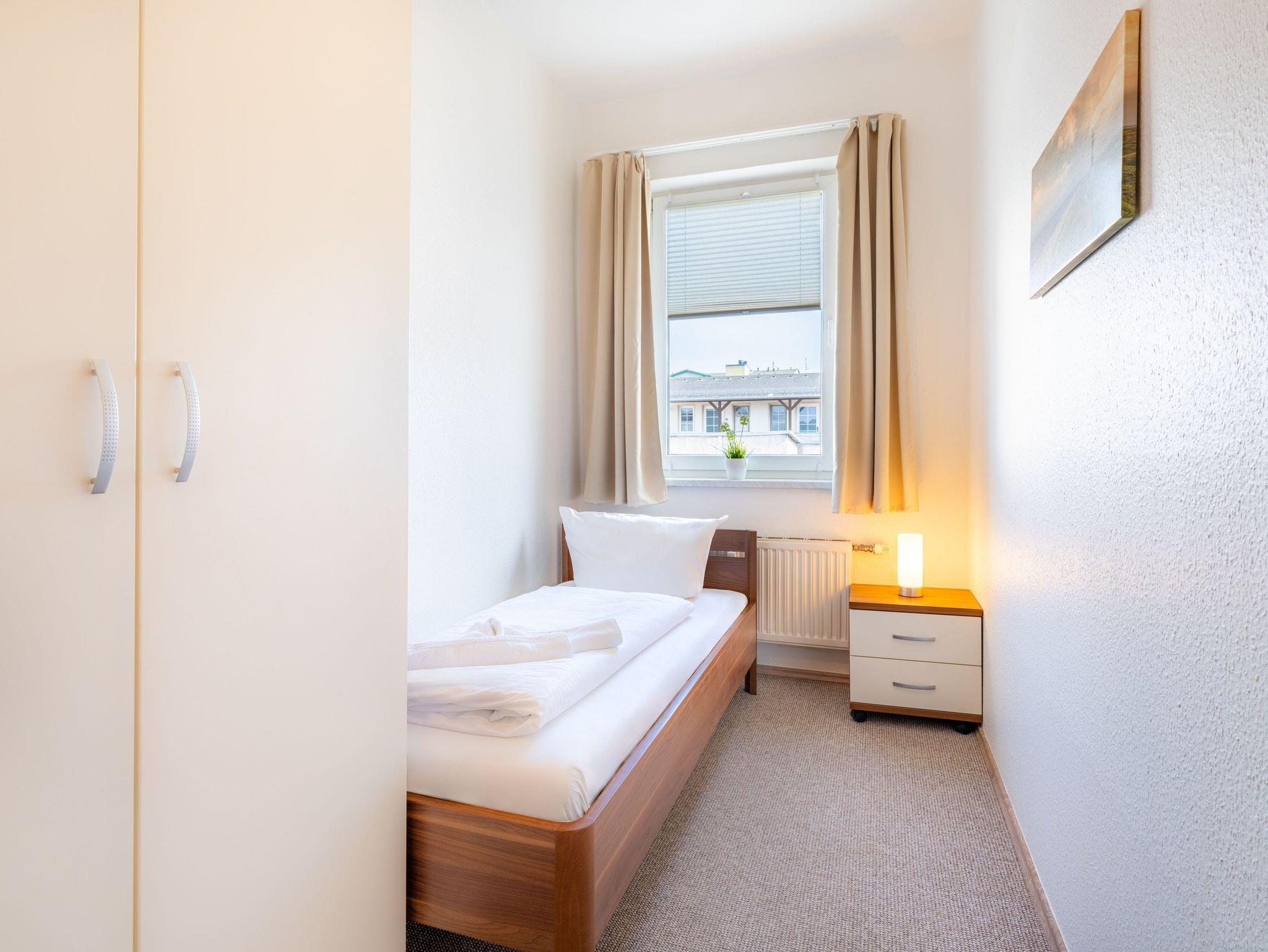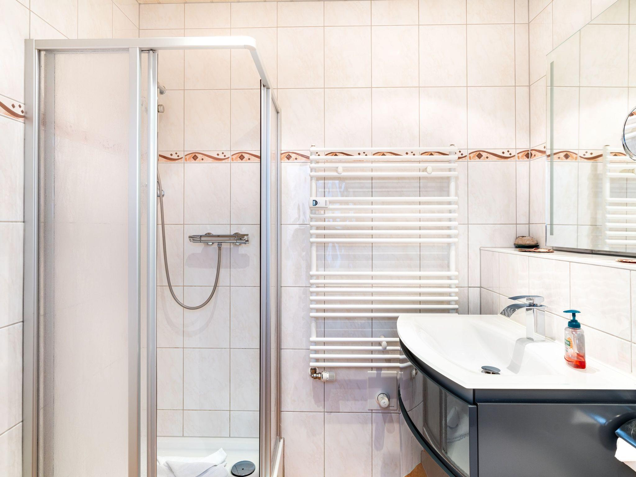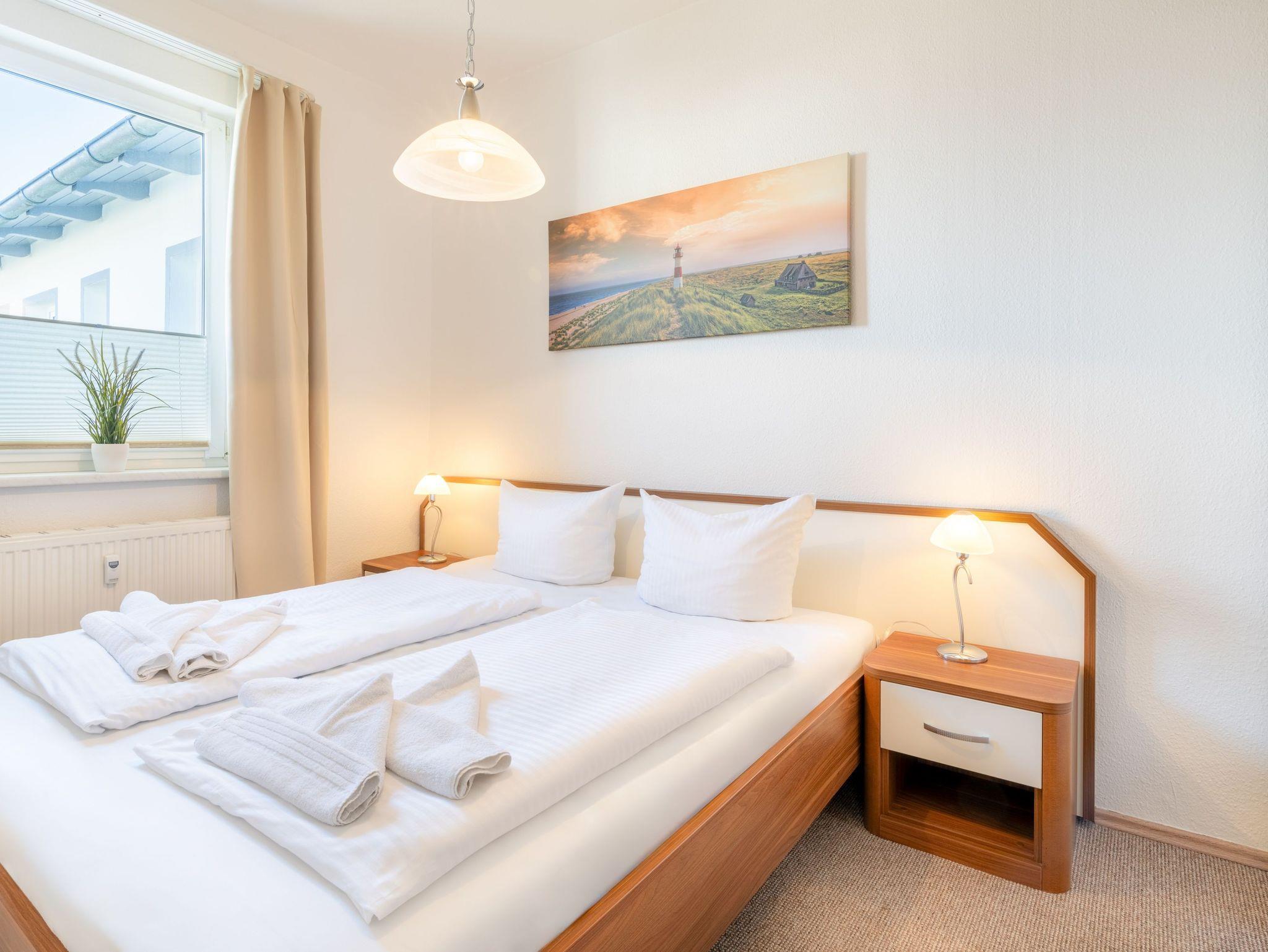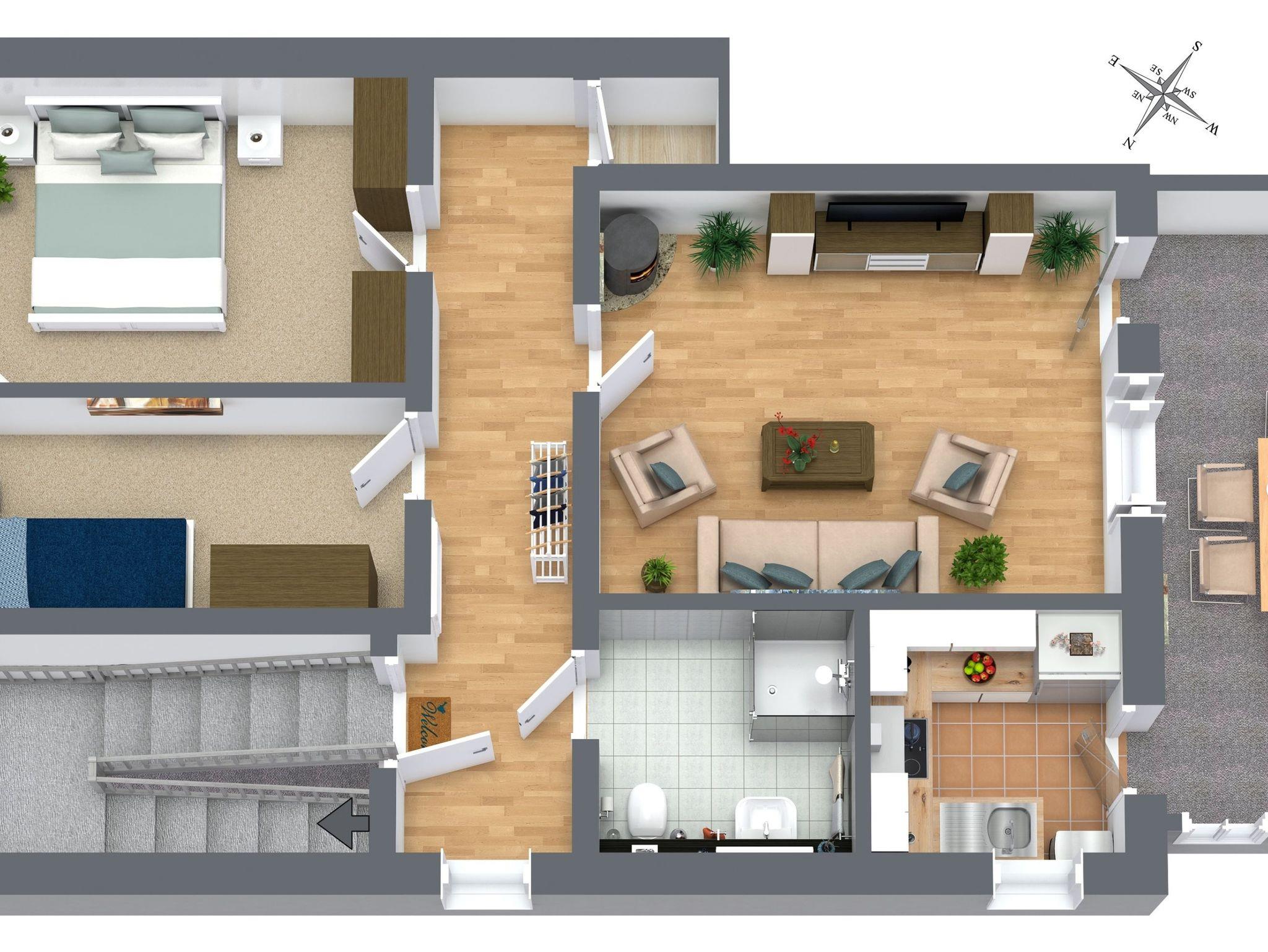 Das 65 qm große Appartement in ersten Obergeschoss verfügt über ein Wohnzimmer mit moderner Couchecke, TV und Kamin. Die separate Küche ist mit Backofen, Spülmaschine, Mikrowelle Ceranherd, Kühlschrank und vielen weiteren Küchenutensilien ausgestattet. Die Küche erreichen Sie über die großzügige Veranda mit Essplatz. Das erste Schlafzimmer ist mit Doppelbett ausgestattet, das zweite Schlafzimmer mit einem Einzelbett und TV. Bad mit Dusche und WC.