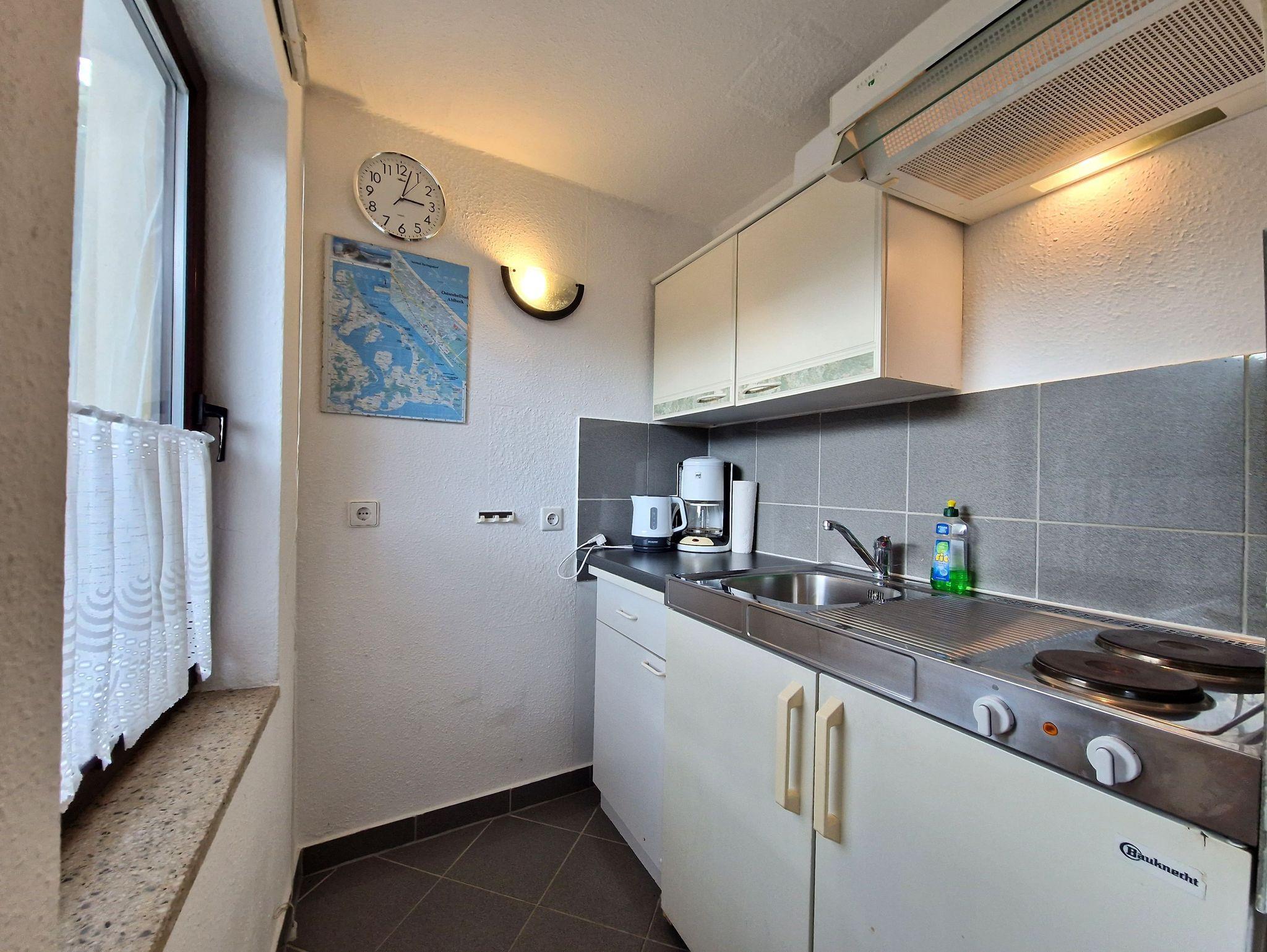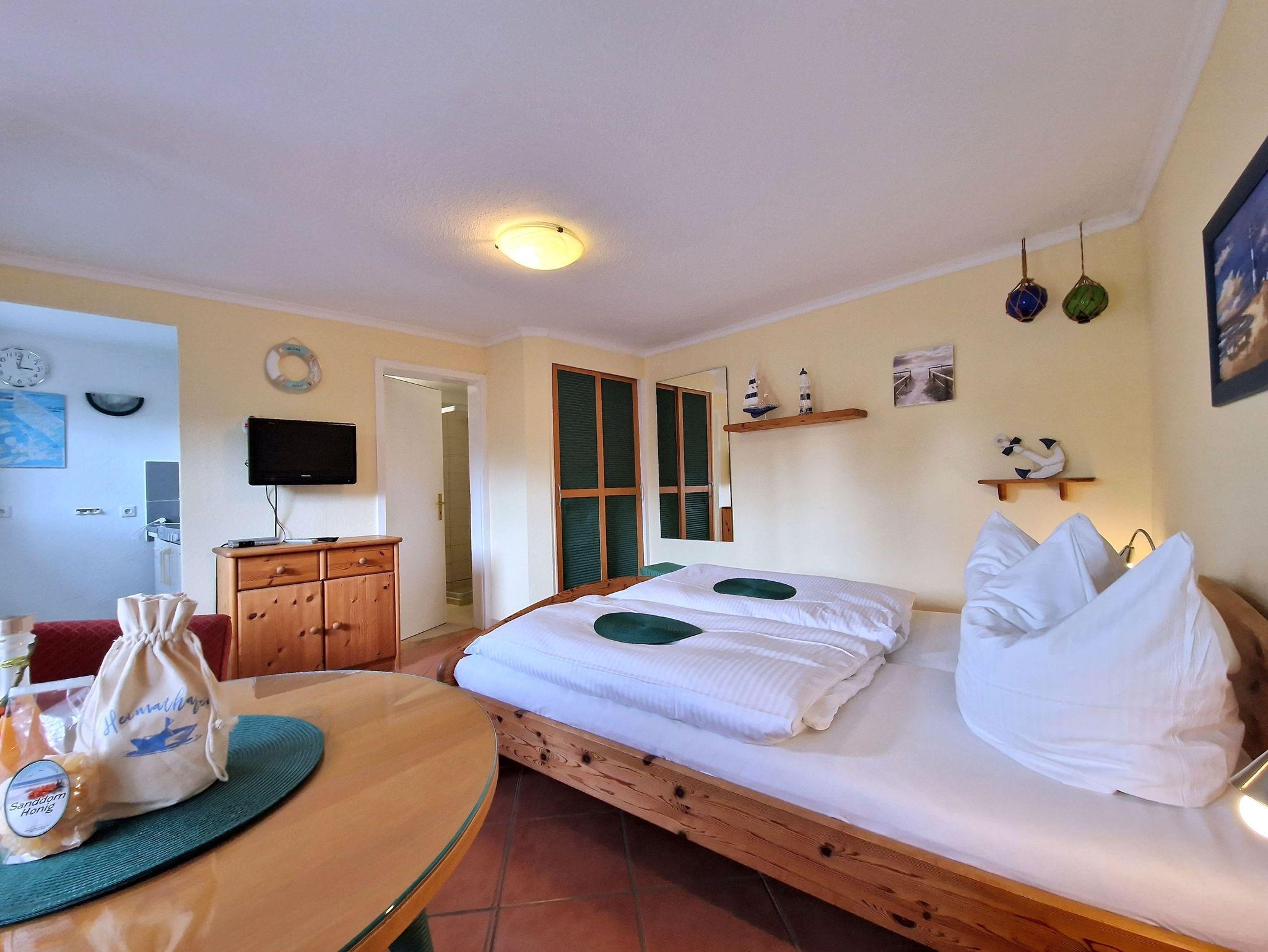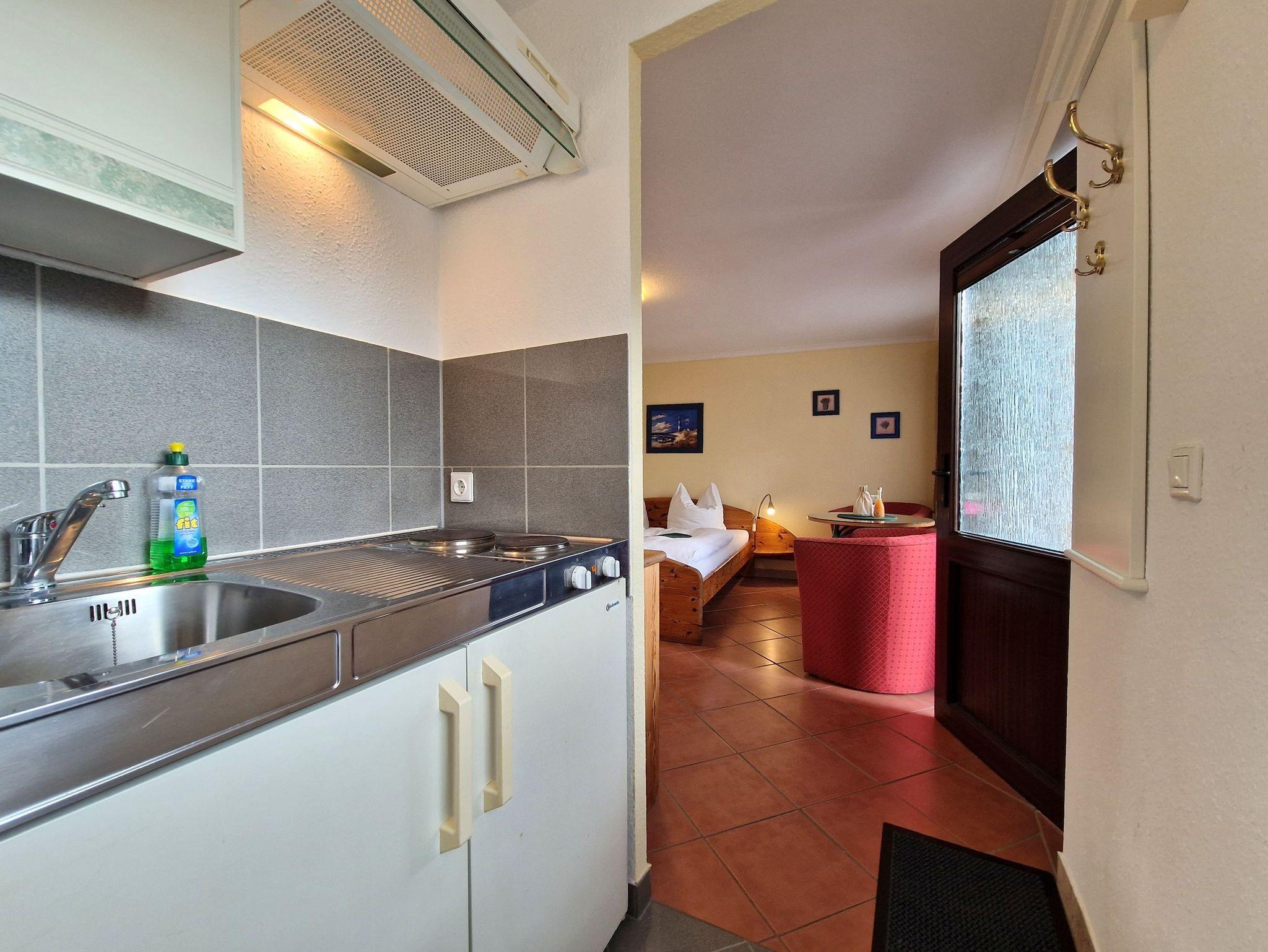 Die gemütliche 1-Raum-Wohnung im Erdgeschoss ist perfekt für 2 Personen und bietet Ihnen alles, was Sie für einen entspannten Urlaub benötigen. Das kombinierte Wohn-/Schlafzimmer ist einladend und komfortabel eingerichtet und verfügt über eine kleine Küchenzeile mit 2-Plattenherd, Kaffeemaschine sowie einem Kühlschrank mit kleinem Frostfach - ideal für die Zubereitung von kleinen Mahlzeiten und Snacks.