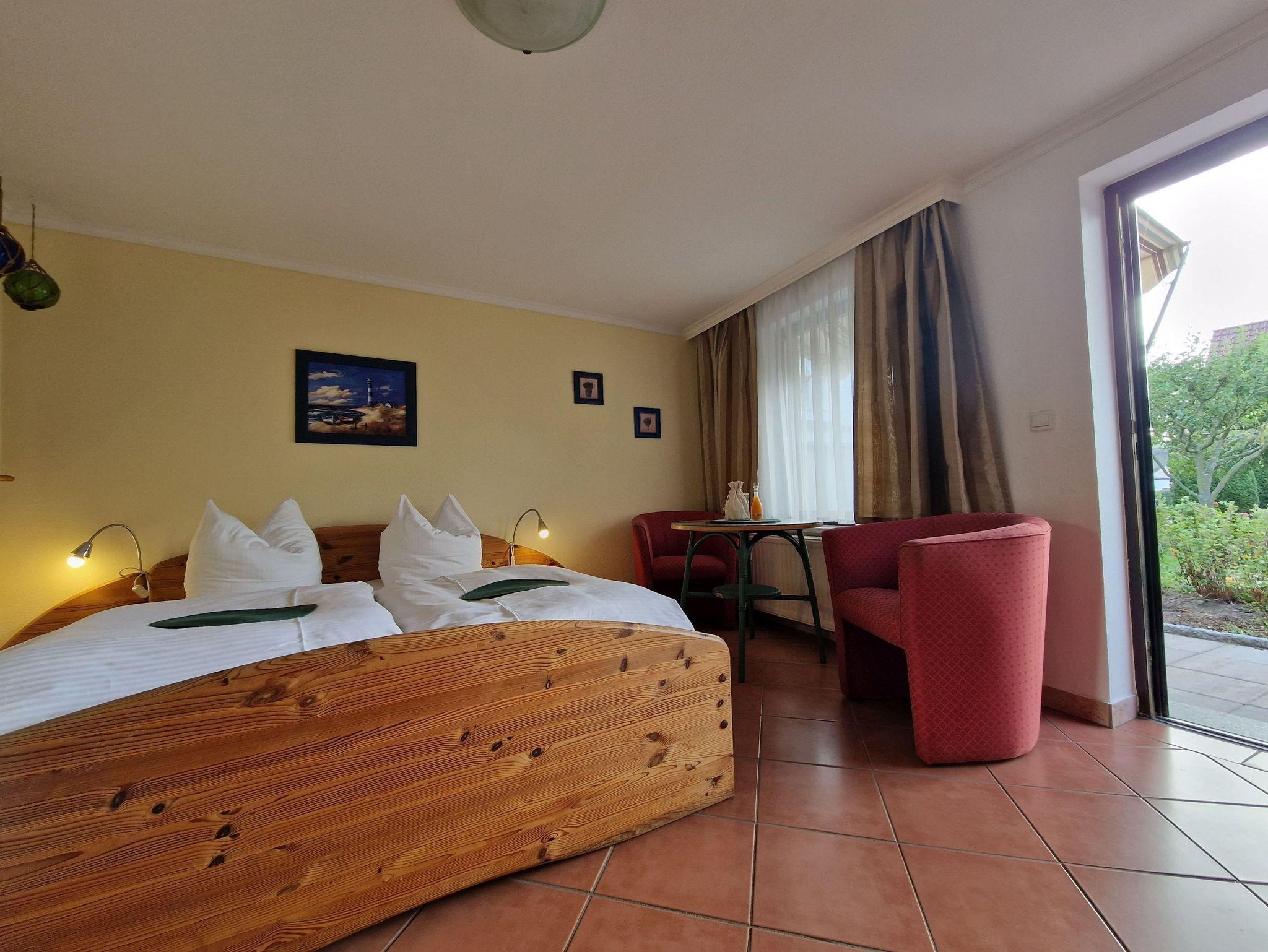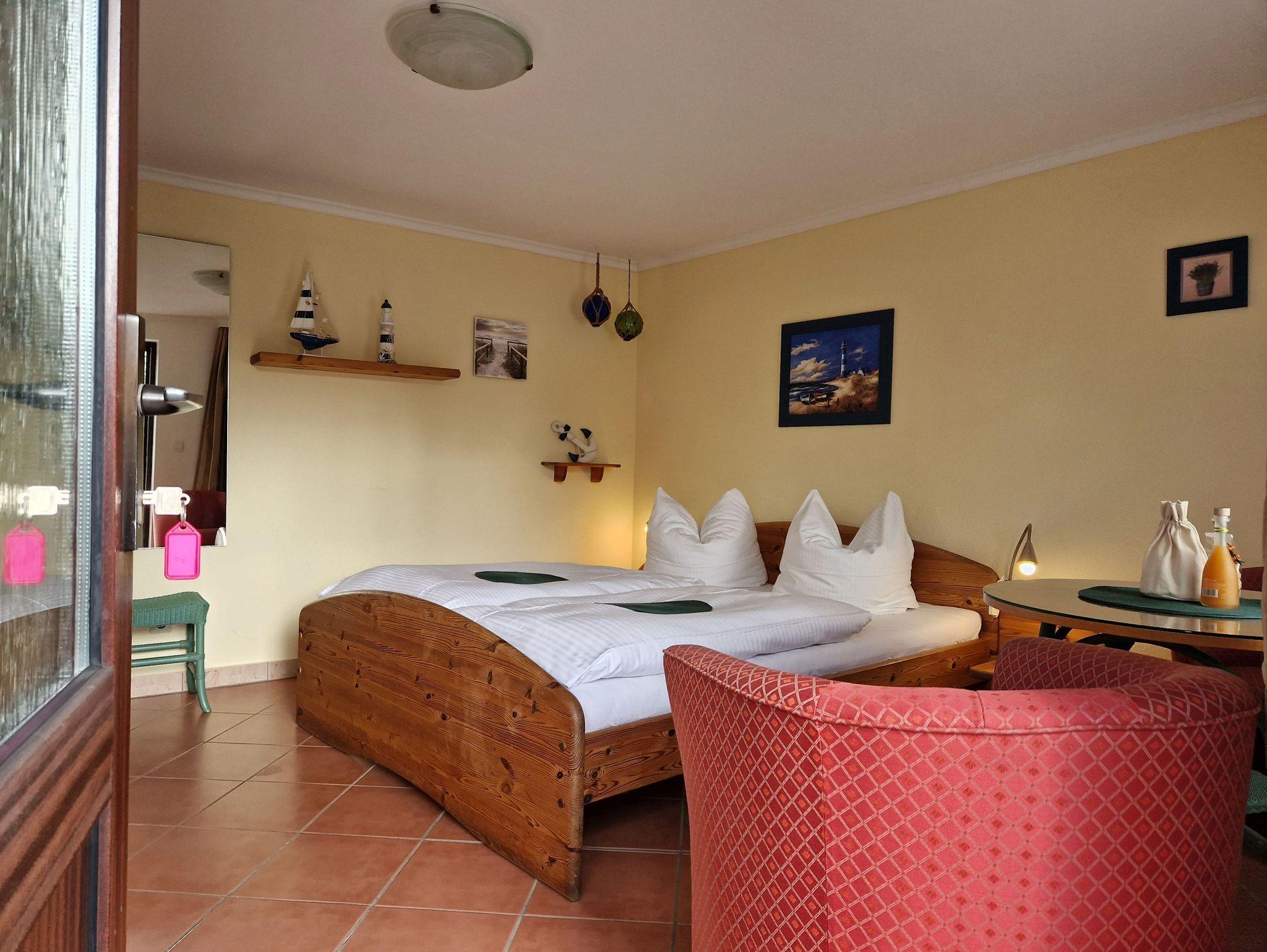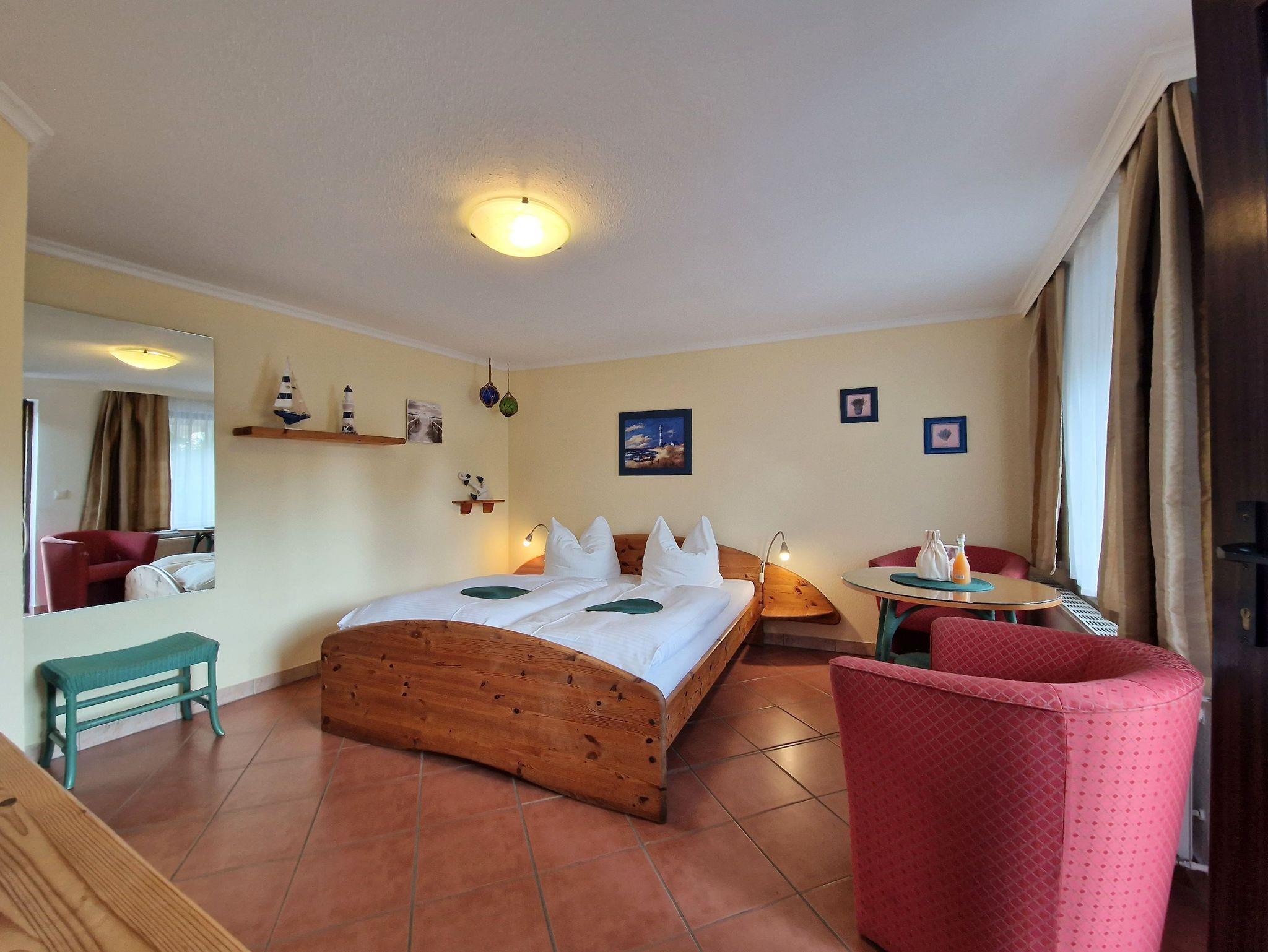 Die gemütliche 1-Raum-Wohnung im Erdgeschoss ist perfekt für 2 Personen und bietet Ihnen alles, was Sie für einen entspannten Urlaub benötigen. Das kombinierte Wohn-/Schlafzimmer ist einladend und komfortabel eingerichtet und verfügt über eine kleine Küchenzeile mit 2-Plattenherd, Kaffeemaschine sowie einem Kühlschrank mit kleinem Frostfach - ideal für die Zubereitung von kleinen Mahlzeiten und Snacks.