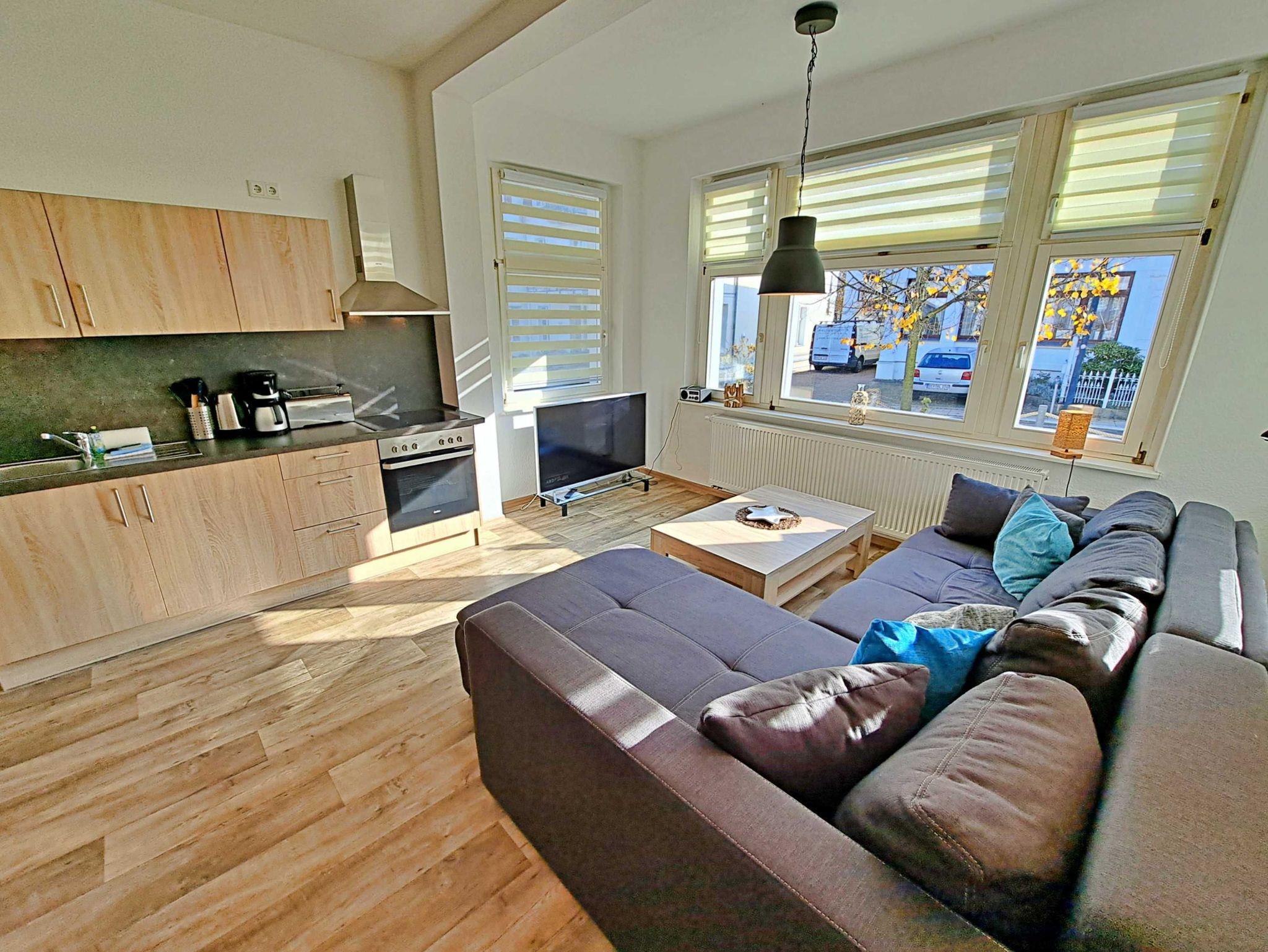 Herzlich willkommen in dieser sonnigen, modernen Nichtraucher-Wohnung im Erdgeschoss der Villa “Haus Bella”! Die ca. 53 qm große Unterkunft bietet Ihnen alles, was Sie für einen entspannten Aufenthalt brauchen. Das einladende Wohnzimmer ist mit einer bequemen Couchgarnitur ausgestattet, die auch als Schlafmöglichkeit genutzt werden kann, sowie einem Esstisch mit vier komfortablen Stühlen. Die integrierte Küchenzeile lässt keine Wünsche offen: Sie finden dort einen Elektro-Herd, Backofen, Kühlschrank, Kaffeemaschine, Wasserkocher und Toaster. Im Schlafzimmer erwarten Sie ein gemütliches Doppelbett, ein praktisches Wandklappbett sowie ein geräumiger Kleiderschrank, der ausreichend Stauraum bietet. Das großzügige Tageslicht-Bad mit Dusche und WC sowie einem Fön rundet die gelungene Ausstattung ab. Für Ihren Komfort stehen Ihnen der Parkplatz am Haus sowie kostenloses WLAN zur Verfügung.