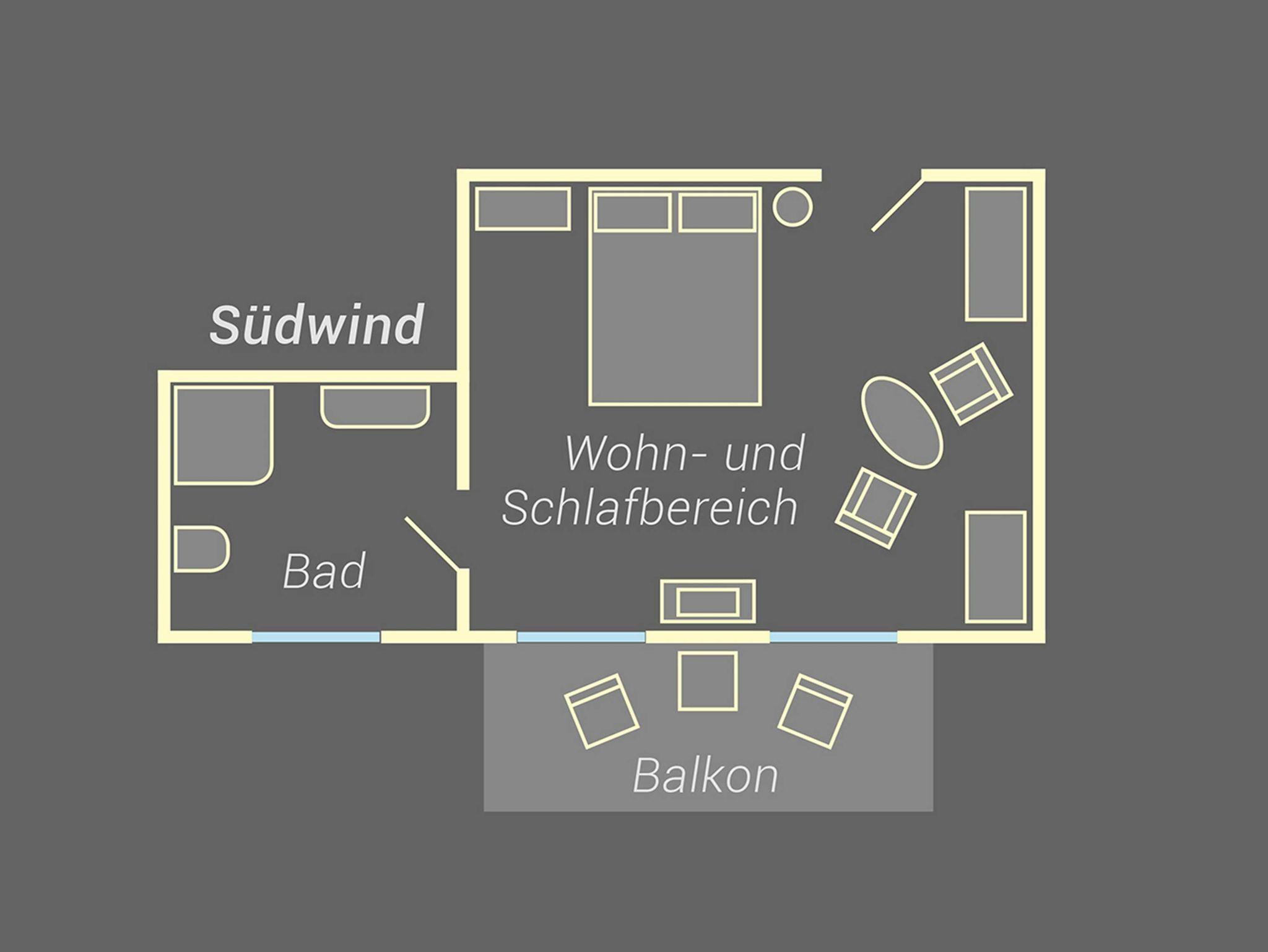 Das 25 qm große Appartement Südwind verfügt über ein Wohnzimmer mit Schlafbereich mit Doppelbett, eine kleine Sitzecke sowie eine Pantry-Küche. Tageslicht-Bad mit Dusche und WC. Ein Balkon zur Südseite steht ebenfalls zur Verfügung und lädt zu einer entspannten Zeit im Seebad Ahlbeck ein.