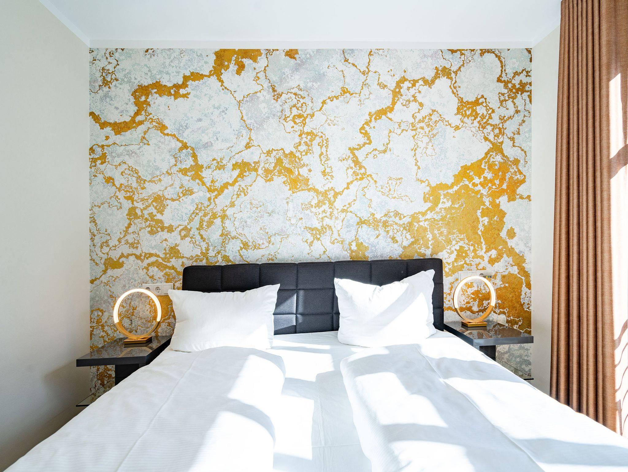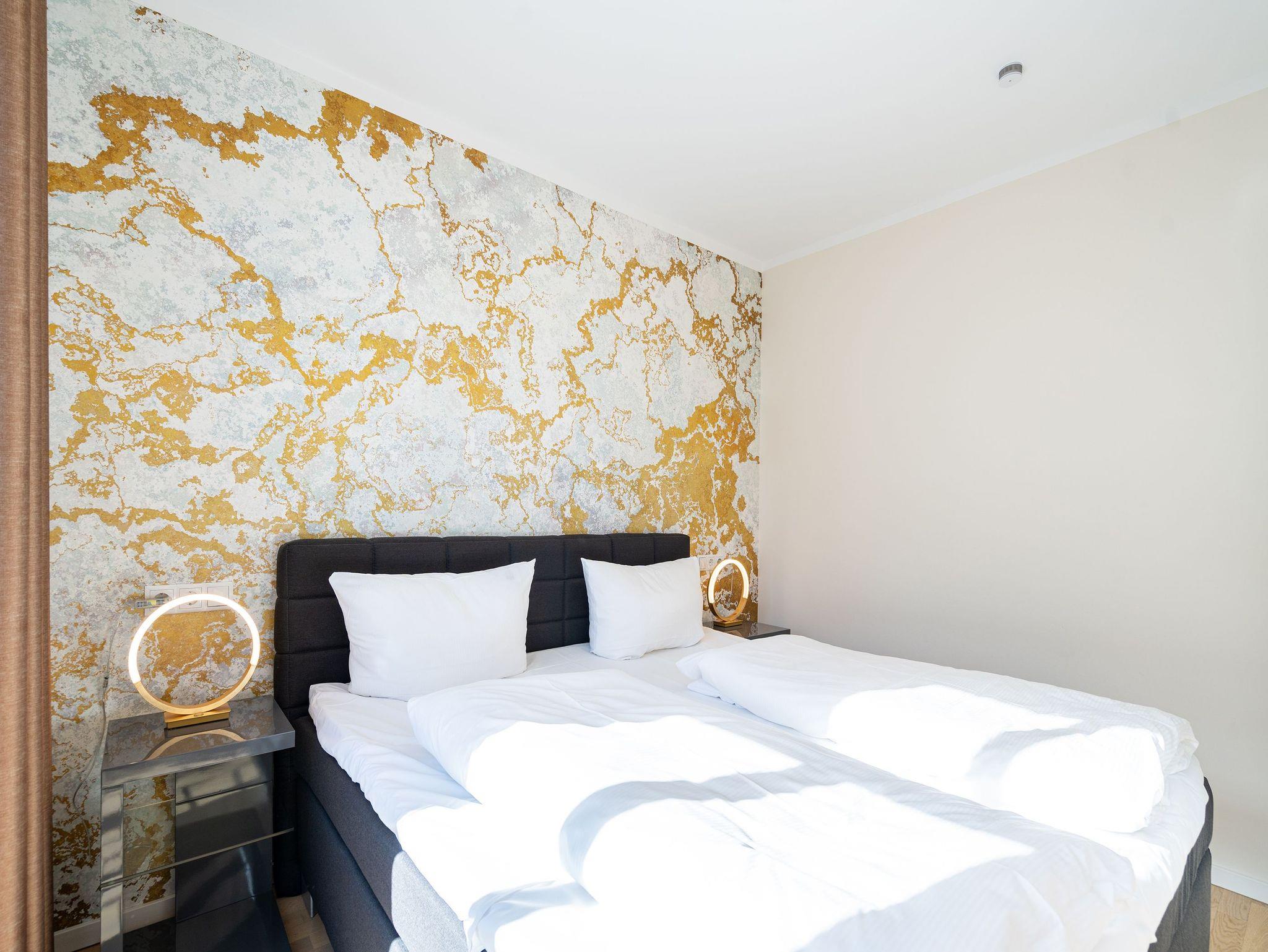 Ein stilvolles Appartement ist die Nummer 8 im ersten Obergeschoss. Für bis zu vier Personen bieten die 74 Quadratmeter viel Platz zum Entspannen und Genießen. Ein großer offener Wohnbereich mit hochwertig und voll ausgestatteter Küchenzeile ist der ideale Ort, um neue Energie zu tanken und mit der Familie oder mit Freunden eine wundervolle Zeit zu verbringen. Eine gemütliche Sofa-Sitz-Landschaft, ein großer Flat-TV, ein Kaminofen und ein schöner Esstisch mit Stühlen ? all das wird Ihre Ostseeauszeit verschönern. Vom Wohnzimmer aus können Sie auf den Balkon (10 Quadratmeter) mit Gartenmöbeln hinaustreten. Lassen Sie es sich hier bei einem erfrischenden Getränk oder einem feinen Essen gut gehen. In der Küche ist alles Nötige vorhanden: Induktionsherd, Geschirrspüler, Mikrowelle, Toaster, Kaffeemaschine, Wasserkocher, Töpfe, Pfannen und edles Porzellan. Das Appartement verfügt über zwei Schlafzimmer, die mit je einem bequemen Boxspringdoppelbett (1,80 m x 2,00 m) und einem geräumigen Kleiderschrank eingerichtet sind. Die bodentiefen Fenster lassen viel Licht in jeden der Räume. Auf das Badezimmer wird es sicher nie einen Ansturm geben, denn es gibt sogar zwei davon. Beide verfügen über Dusche, Föhn und WC. Das Masterbad hält noch eine kleine Überraschung bereit: Eine Finnische Sauna. Genießen Sie Ihre private Wellness-Oase. In einem separaten Hauswirtschaftsraum befindet sich zudem eine Waschmaschine. Handtücher und Bettbezüge gehören zum Preis dazu. Auch das WLAN ist inklusive. In der Tiefgarage gehört zur Wohnung der Stellplatz Nr. 8. Außerdem gibt es dort einen Fahrradraum.