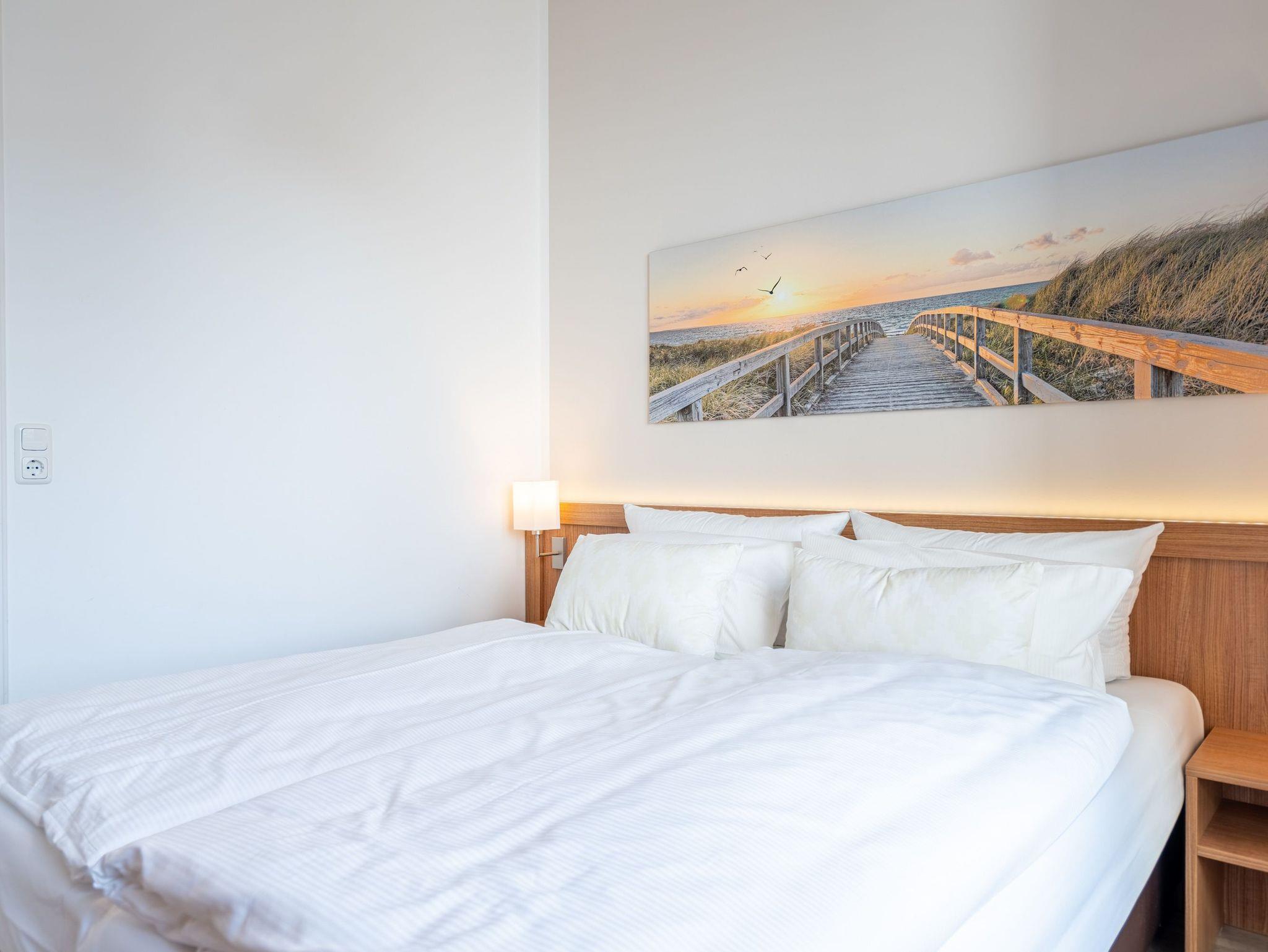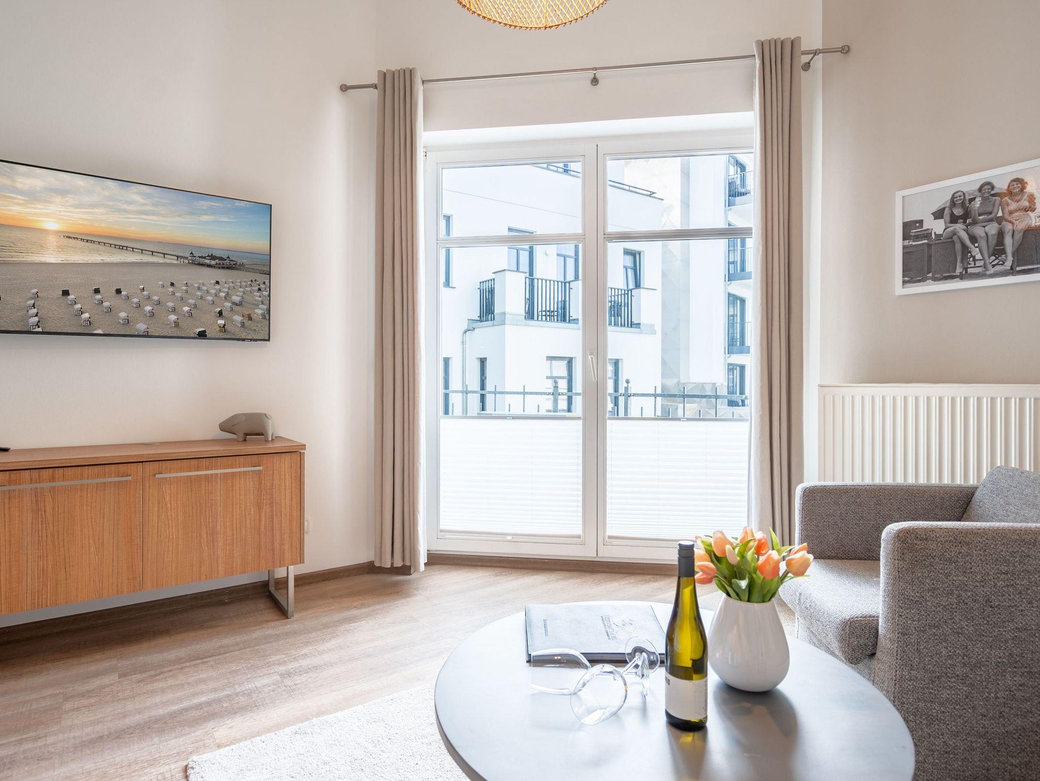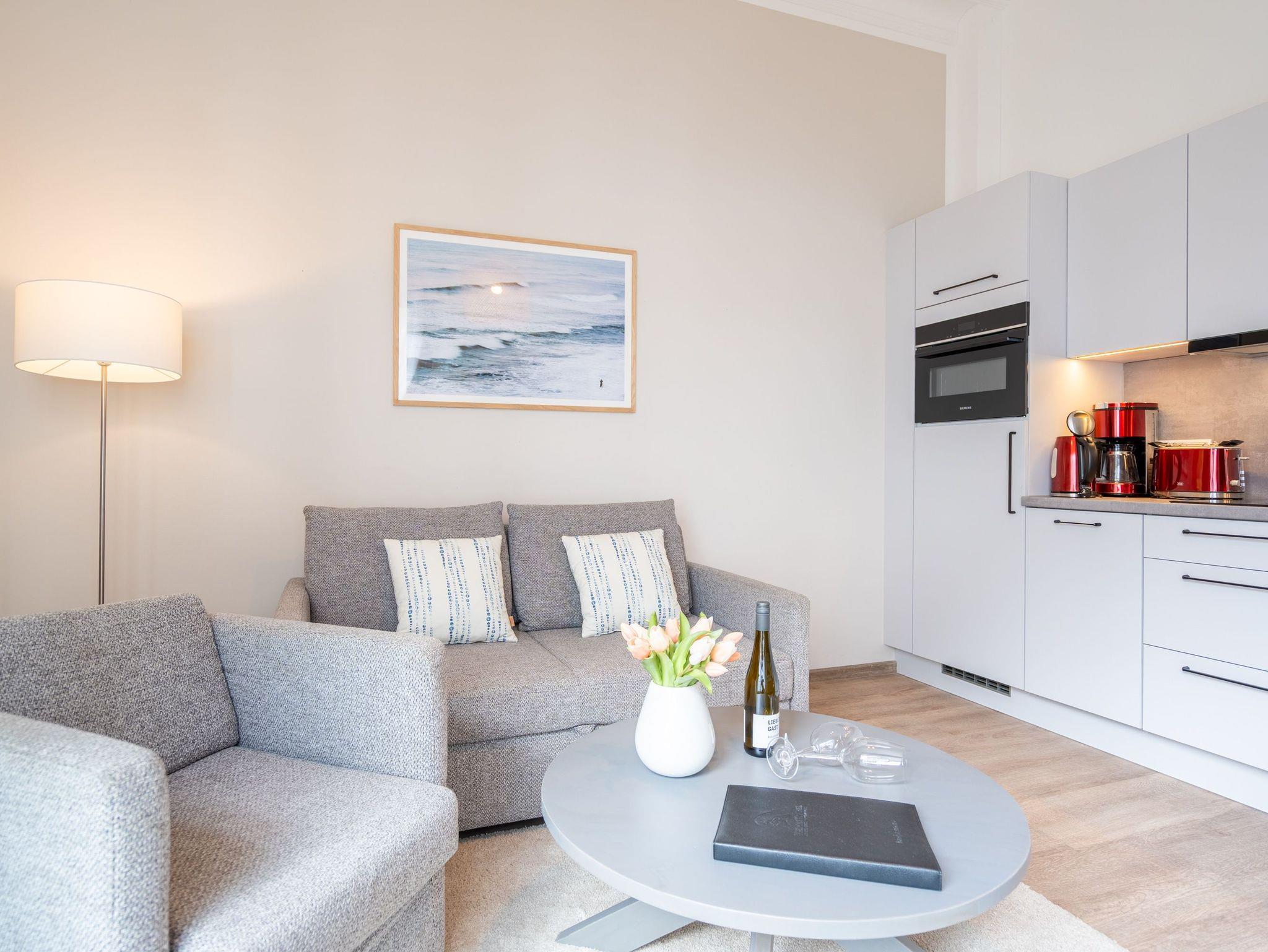 Die 2-Raum-Ferienwohnung Nr. C07 in der Villa Seedüwel bietet auf 38 qm komfortablen Platz für zwei Personen und befindet sich im 1. Obergeschoss. Der offene Wohnbereich ist mit einer praktischen Küchenzeile ausgestattet, die ein Induktionskochfeld, eine Mikrowelle und einen Kühlschrank mit Gefrierfach umfasst. Ein Essplatz für zwei Personen, eine gemütliche Sitzgruppe und ein Flat-TV sorgen für eine angenehme Atmosphäre. Vom Wohnbereich aus gelangen Sie auf den Süd-Ost-Balkon, der zum Entspannen einlädt. Das Schlafzimmer ist mit einem Doppelbett (1,60 m x 2,00 m) und einem Kleiderschrank eingerichtet. Das Bad verfügt über eine Dusche und ein Waschbecken, zudem gibt es ein separates WC. Ein Stellplatz in der Tiefgarage ( Einfahrthöhe 2,03m) des benachbarten Hauses „Strandterrasse“ ist für Sie reserviert. WLAN steht Ihnen kostenfrei zur Verfügung.