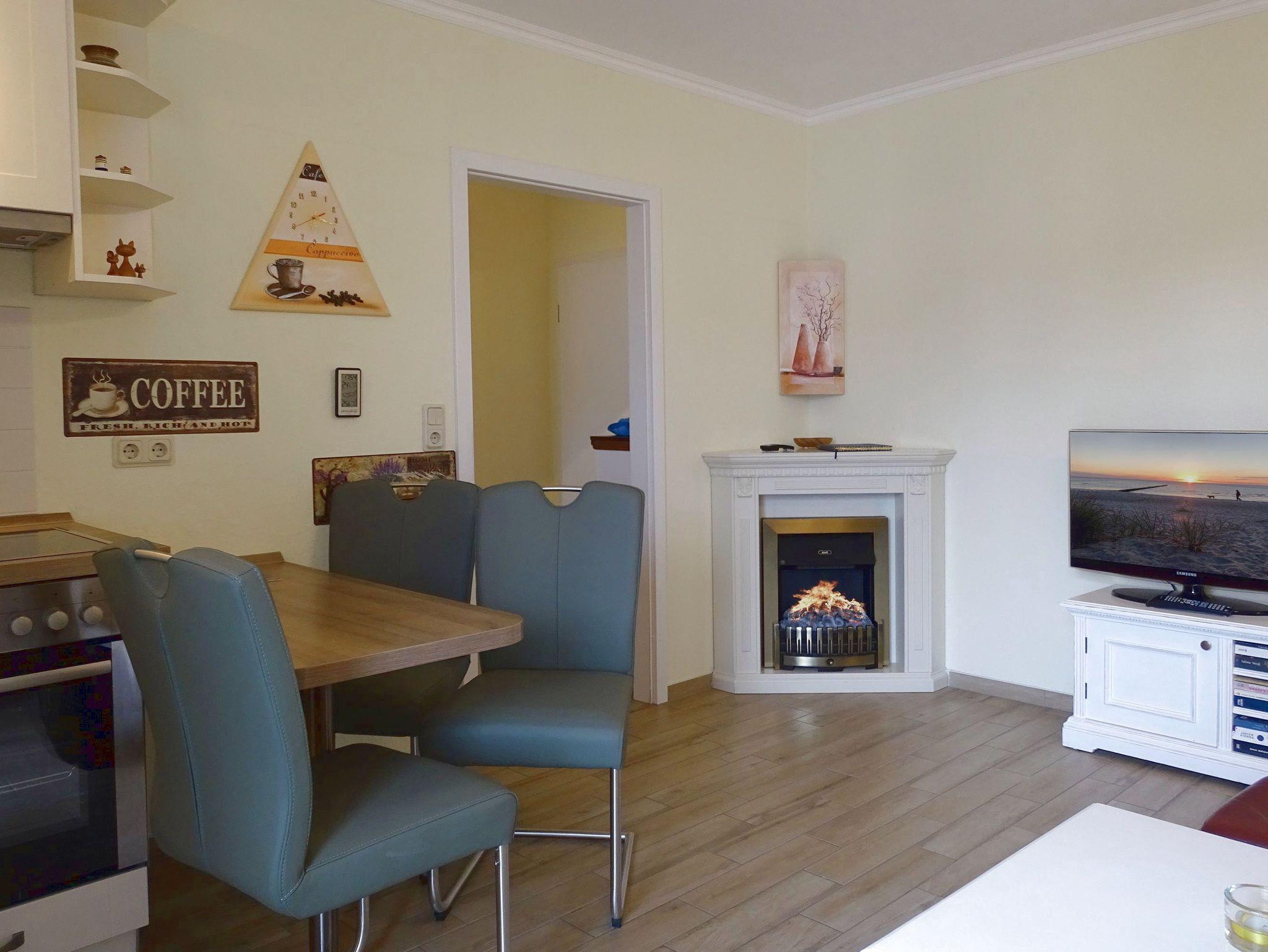 Das mit Liebe eingerichtete Appartement entspricht dem heutigen gehobenen Komfort. Bis zu drei Personen können auf 41 Quadratmetern eine erholsame Urlaubszeit verbringen. Im Wohnzimmer mit einladender Ledergarnitur vor dem Elektro-Kamin, TV und stilvollen Möbeln muss man sich einfach wohlfühlen! Farblich angepasst lässt die Küchenzeile keinen Wunsch Dank Backofen, Kühlschrank mit Gefrierfach, Geschirrspüler, Mikrowelle, Wasserkocher, Toaster, Kaffeemaschine unerfüllt. Auf dem angrenzenden Balkon Richtung Südwesten können Sie den Urlaubstag entspannt bei einem Glas Wein ausklingen lassen. Im Schlafzimmer wartet ein komfortables Doppelbett (180 x 200cm / zwei getrennte Matratzen) sowie ein Flat TV auf Sie.