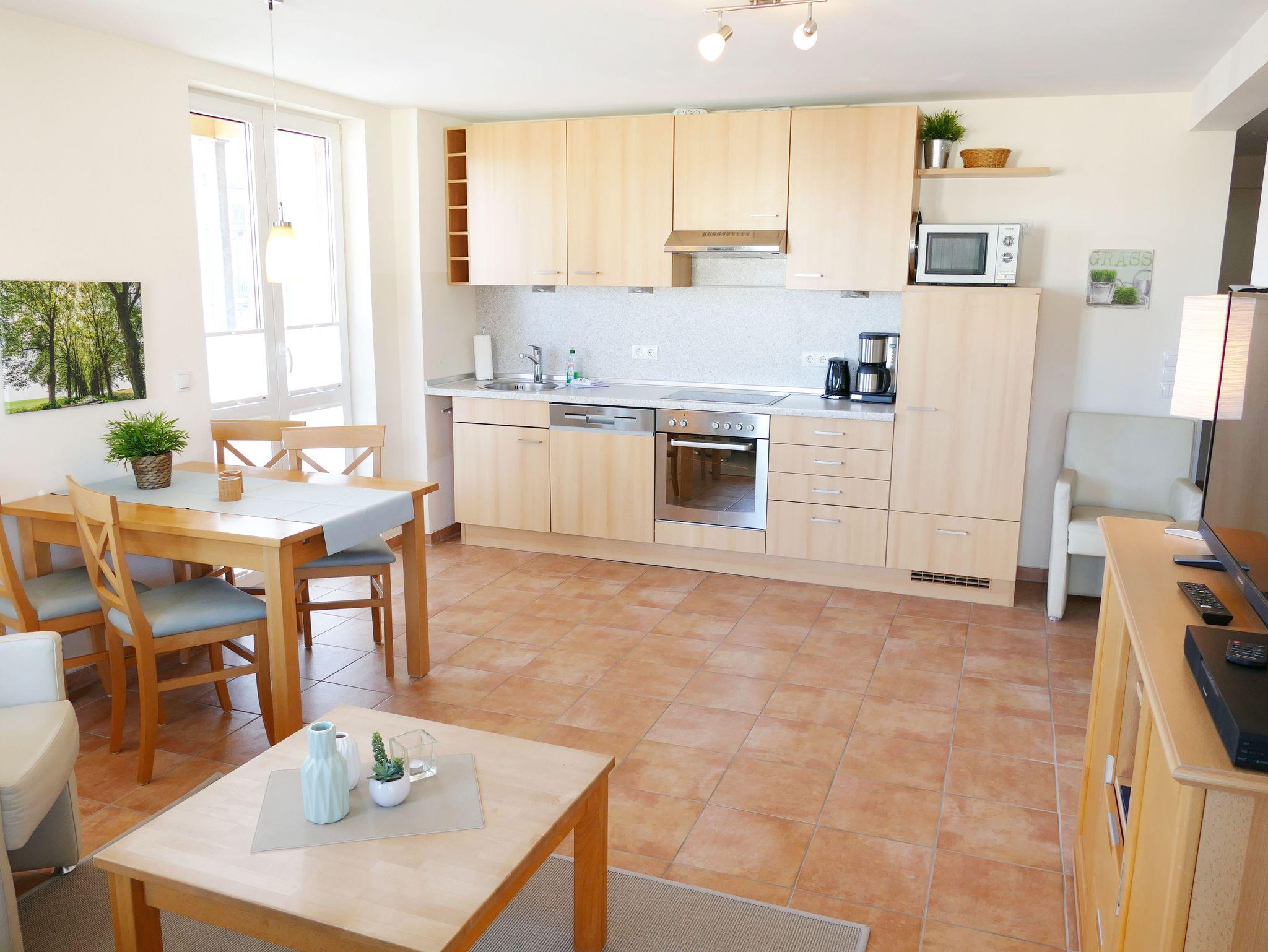 Die helle und freundliche Ferienwohnung in der dritten Etage des Neubaus der Villa Linquenda bietet auf 63 m² komfortablen Platz für bis zu vier Personen. Die hochwertig eingerichtete Wohnung verfügt über einen gemütlichen Wohnbereich mit Sitzgruppe und Flat-TV sowie eine komplett ausgestattete Küchenzeile.