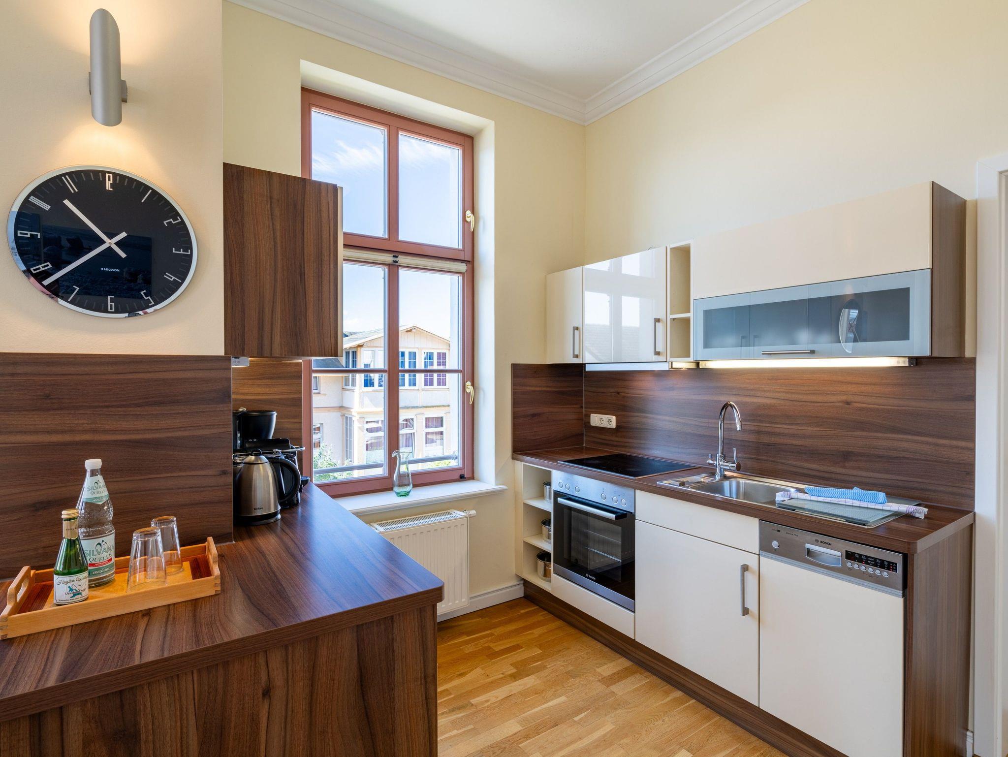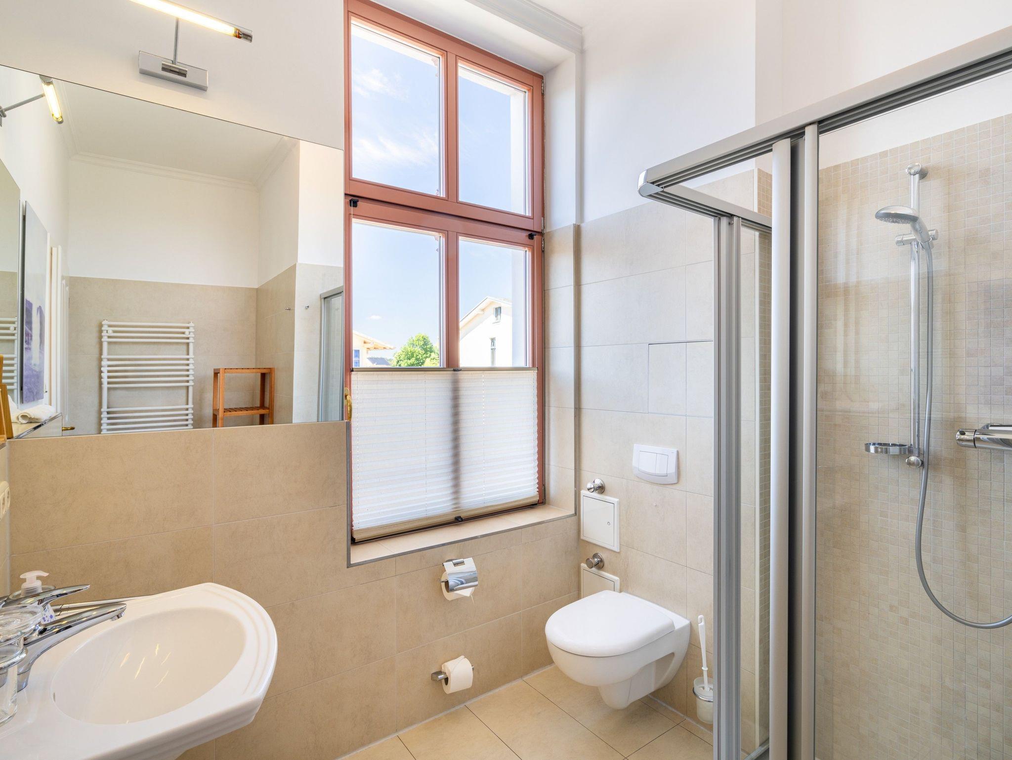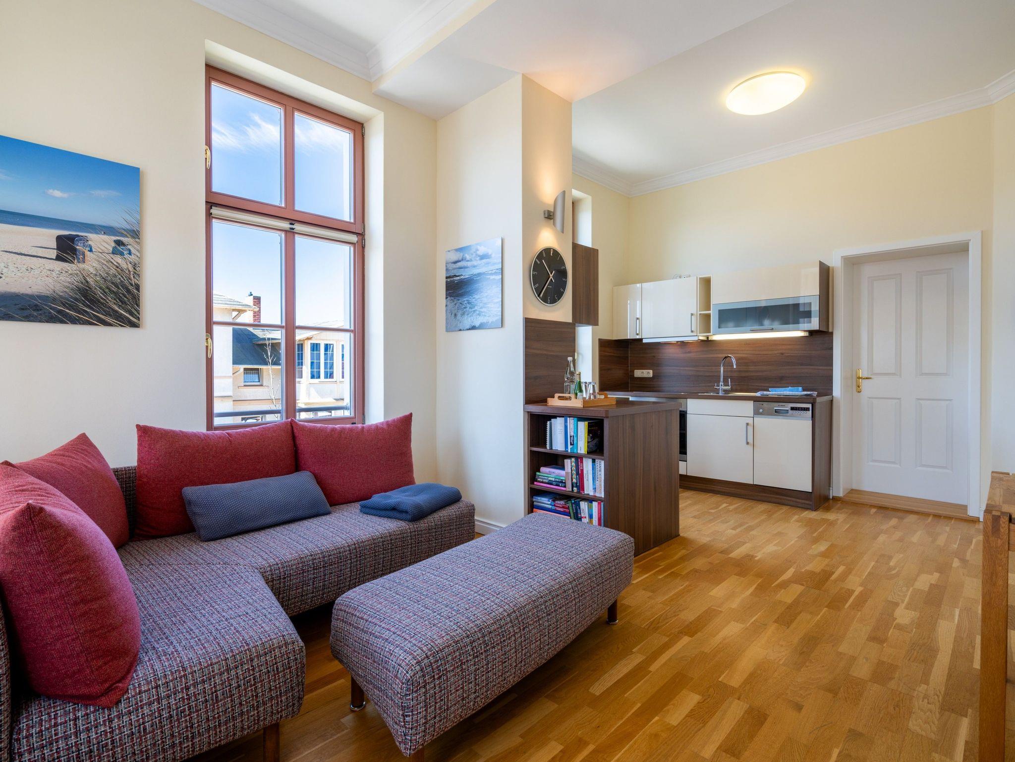 Die moderne Wohnung 08 empfängt Sie in der ersten Etage des Autorenhauses. Die geschmackvoll eingerichtete Wohnung bietet auf 54 qm Platz für bis zu drei Personen. Sie verfügt über eine Veranda mit Ausblick auf die Ostsee (mit Schiebefenstern ausgestattet), Essbereich und Couch. Das Wohnzimmer ist mit einem Fernseher (55 Zoll/ 139 cm) und Sofa ausgestattet, welches eine Aufbettungsmöglichkeit für die dritte Person bereit stellt. An den Wohnbereich schließt sich die offene Küche, ausgestattet mit Backofen, Ceranherd, Spülmaschine, Kaffee- und Nespressomaschine und Kühlschrank sowie vielem mehr, an. Das Trinkwasser wird durch einen Aktivkohlefilter gereinigt und durch einen Wirbler vitalisiert. Das Schlafzimmer ist mit Doppelbett (180x200 cm) und zusätzlichem TV ausgestattet. Bad mit Tageslicht, Dusche und WC.