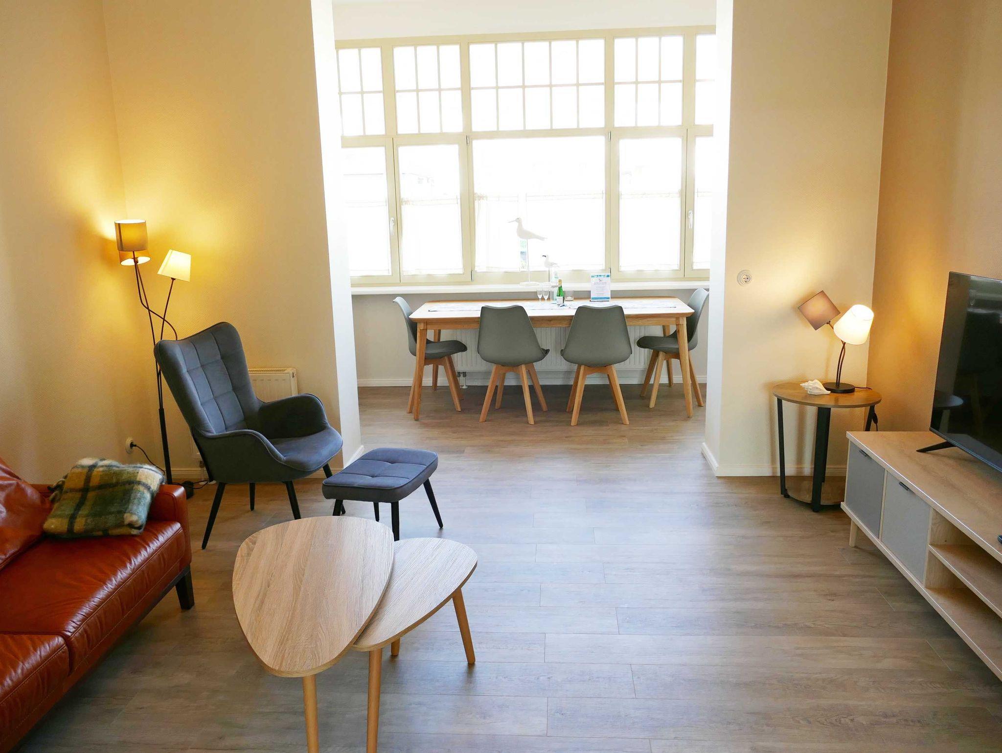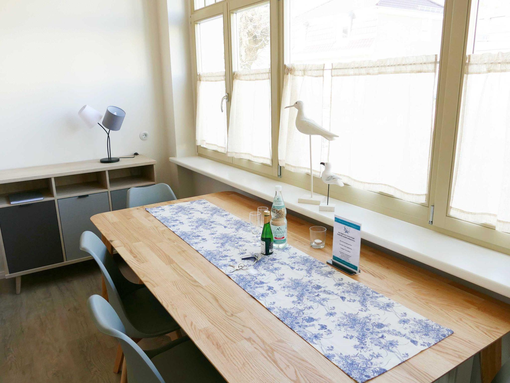 Die 85 qm große Ferienwohnung Anne befindet sich im Erdgeschoss und ist farbenfroh und mit viel Liebe eingerichtet. Sie verfügt über einen möblierten Balkon zur Gartenseite (Südseite). Die Wohnung ist aufgeteilt in Wohnzimmer und 2 Schlafzimmer (wobei ein Schlafzimmer (Doppelbett) als Durchgangszimmer zum 2. Schlafzimmer (Rollbett) dient, Essbereich und komplett ausgestatteter Küche, Bad mit Dusche und WC.