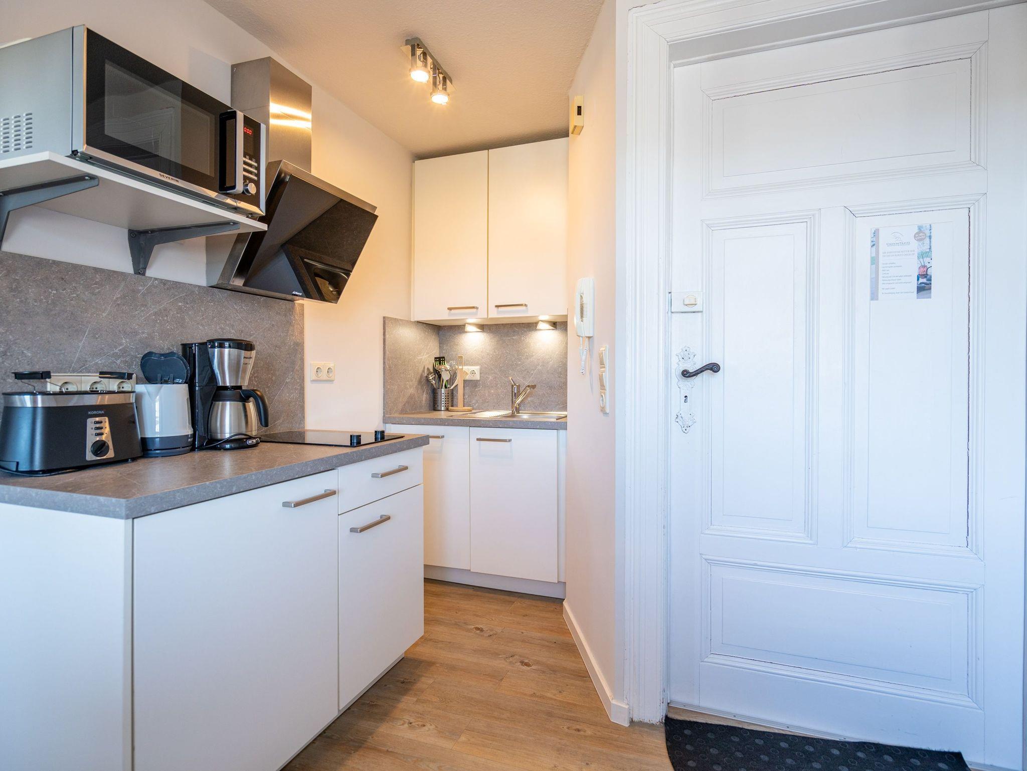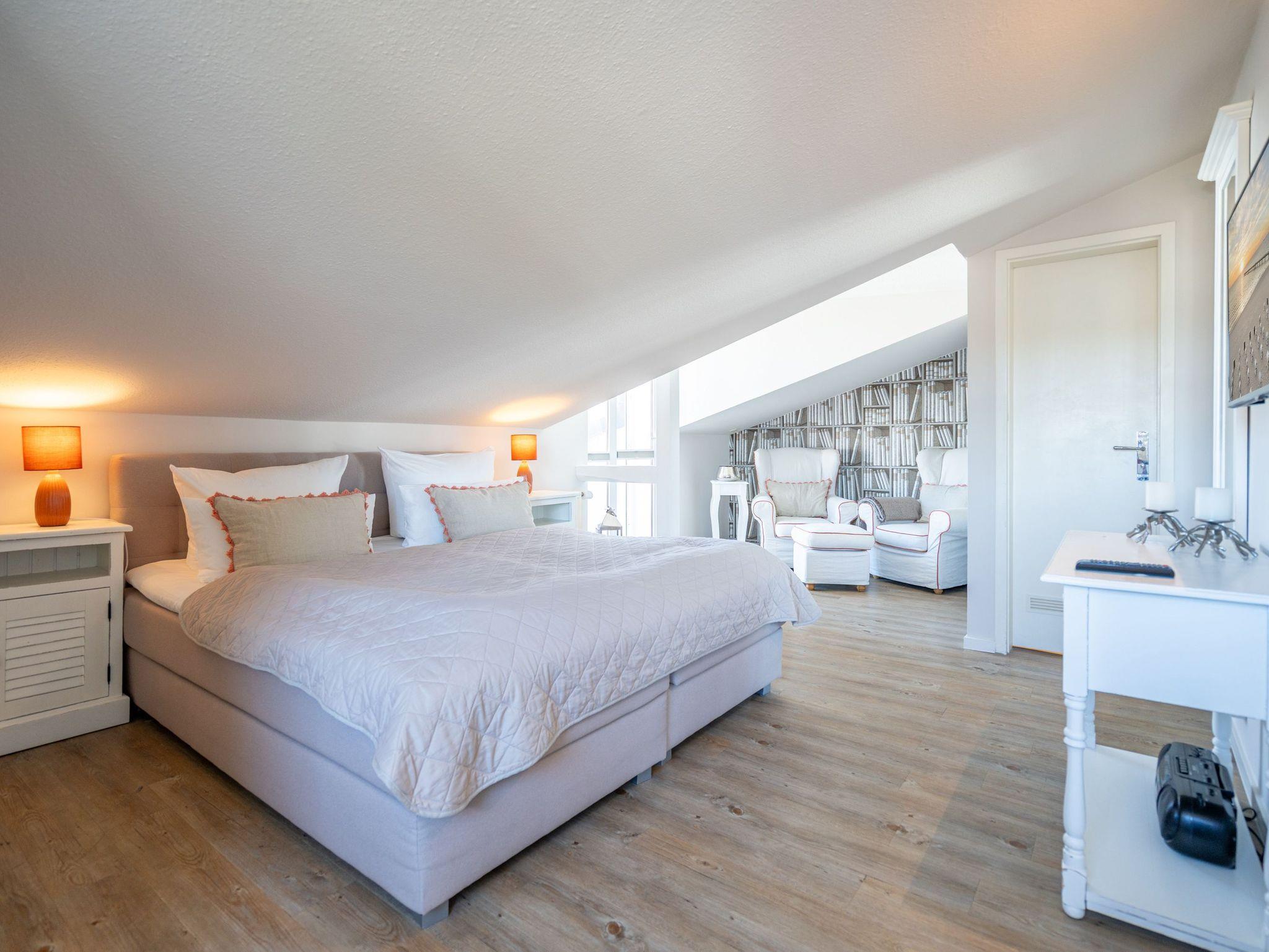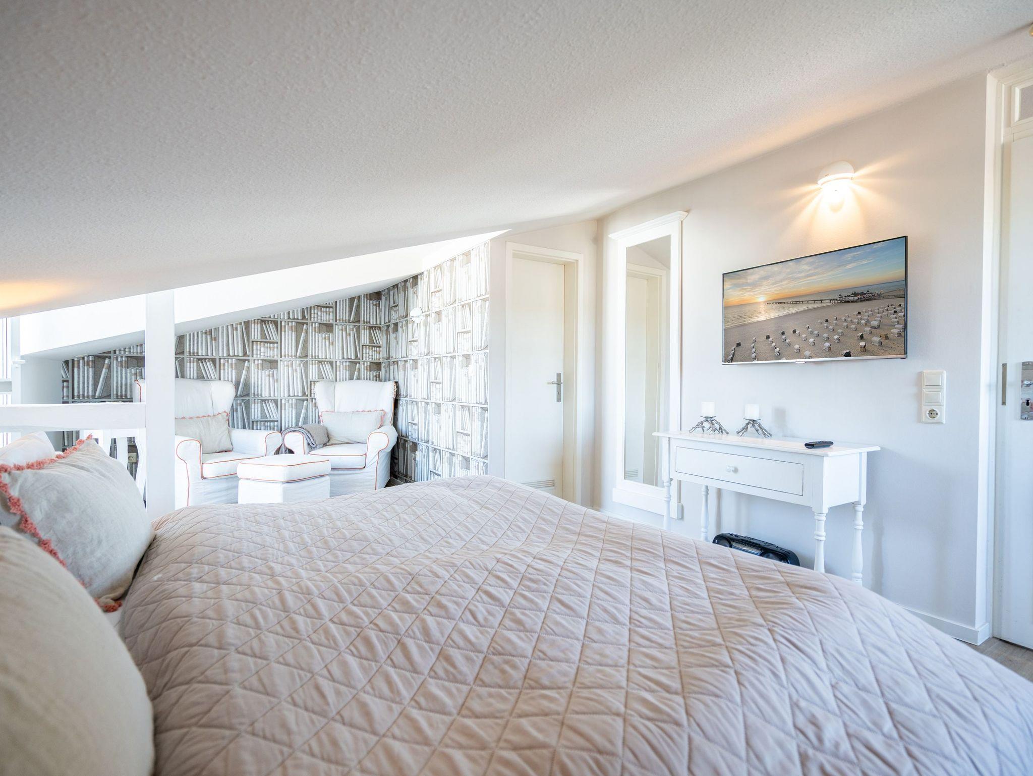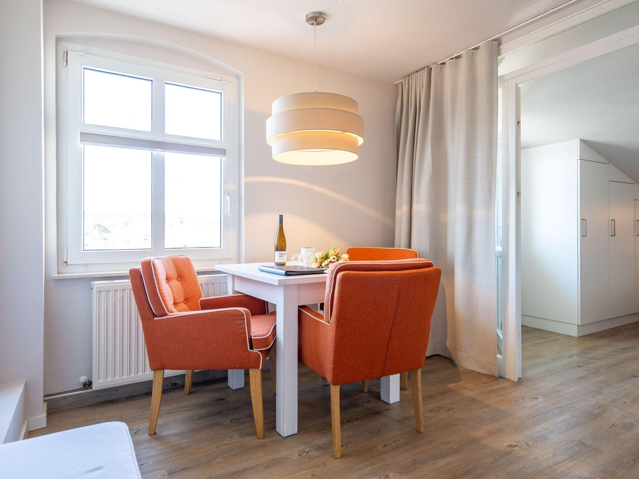 Heimelig wohnen unter dem Dach der Villa Albertine! Freuen Sie sich auf eine gemütliche 1,5-Raum-Ferienwohnung (36 qm) mit Suite Charakter. Neu gestaltet und mit modernen Möbeln ausgestattet ist sie ein ideales Urlaubziel für 2 Personen. Der helle Wohn-/Schlafbereich ist mit einem komfortablen Boxspringdoppelbett ( 1,80m x 2,00m), Flat-TV und zwei bequemen Ohrensesseln ausgestattet. Von hier aus hat man Zugang zum Westbalkon mit kleiner Sitzgruppe. Die separate Küche (2 Platten Cerankochfeld, Geschirrspüler und Mikrowelle) verfügt über einen schönen Essplatz. Ein Bad mit Dusche rundet dieses Appartement ab. Ein PKW-Stellplatz Nr. 9 befindet sich unter einem Carport direkt auf dem Grundstück.