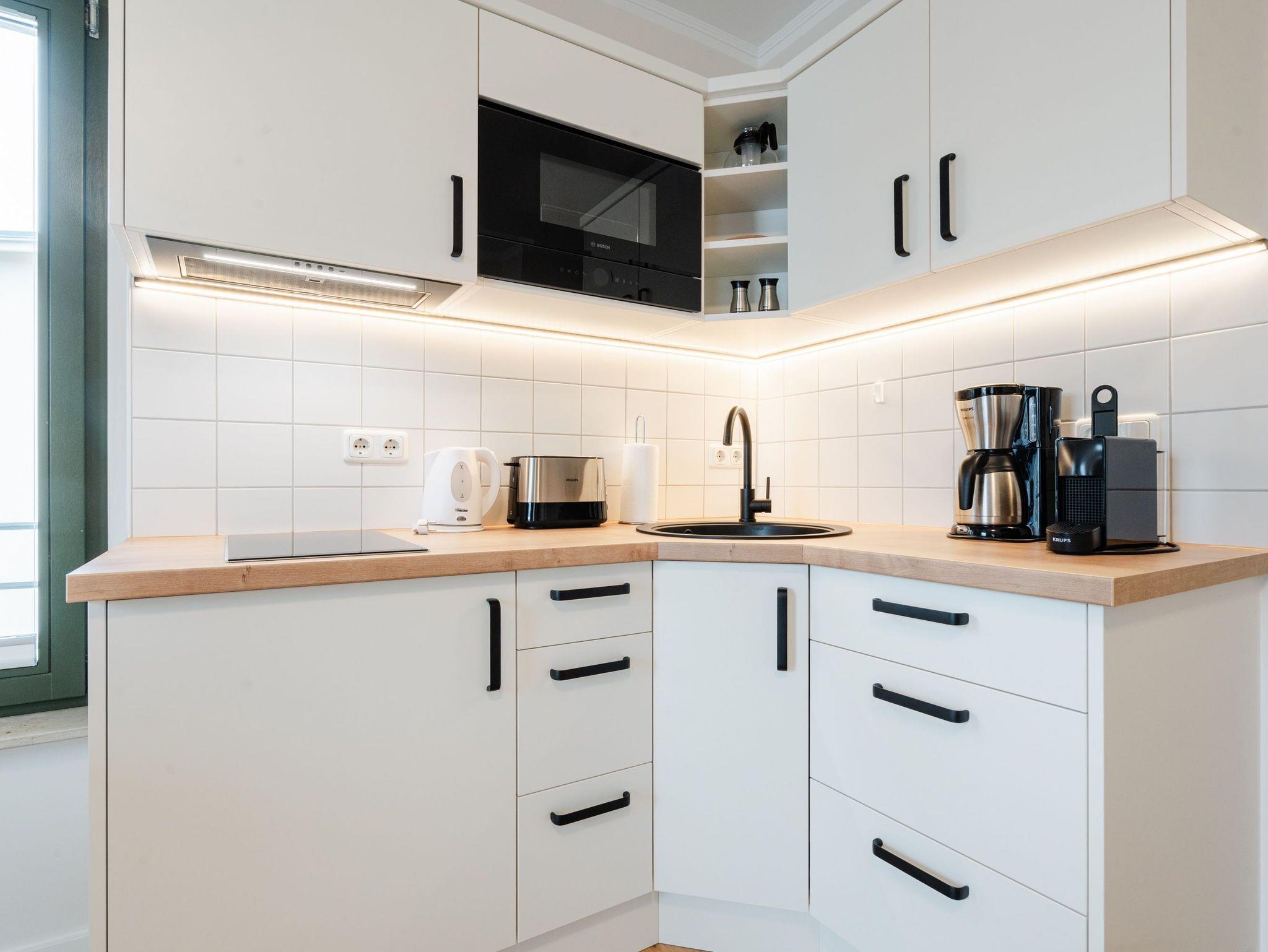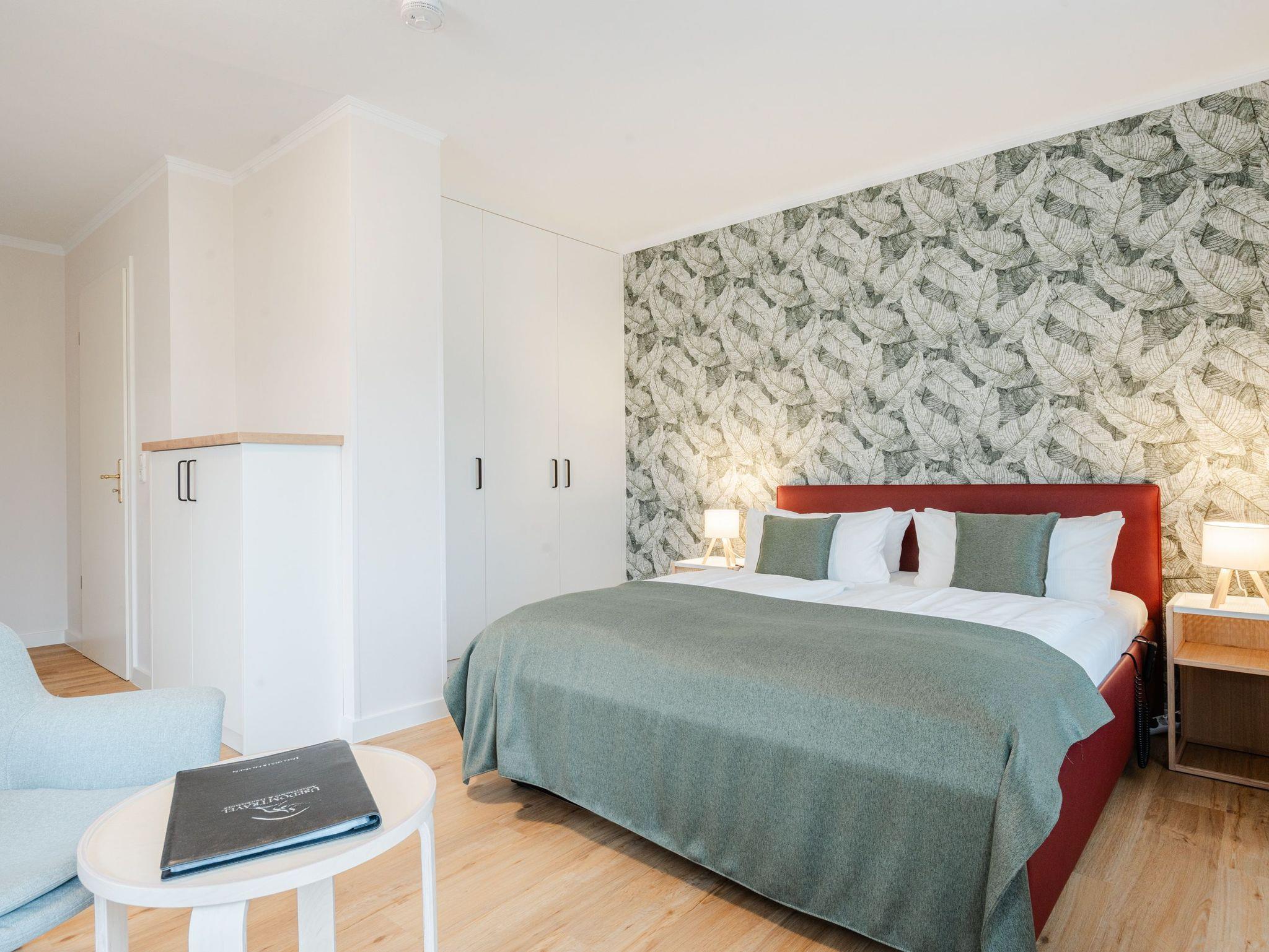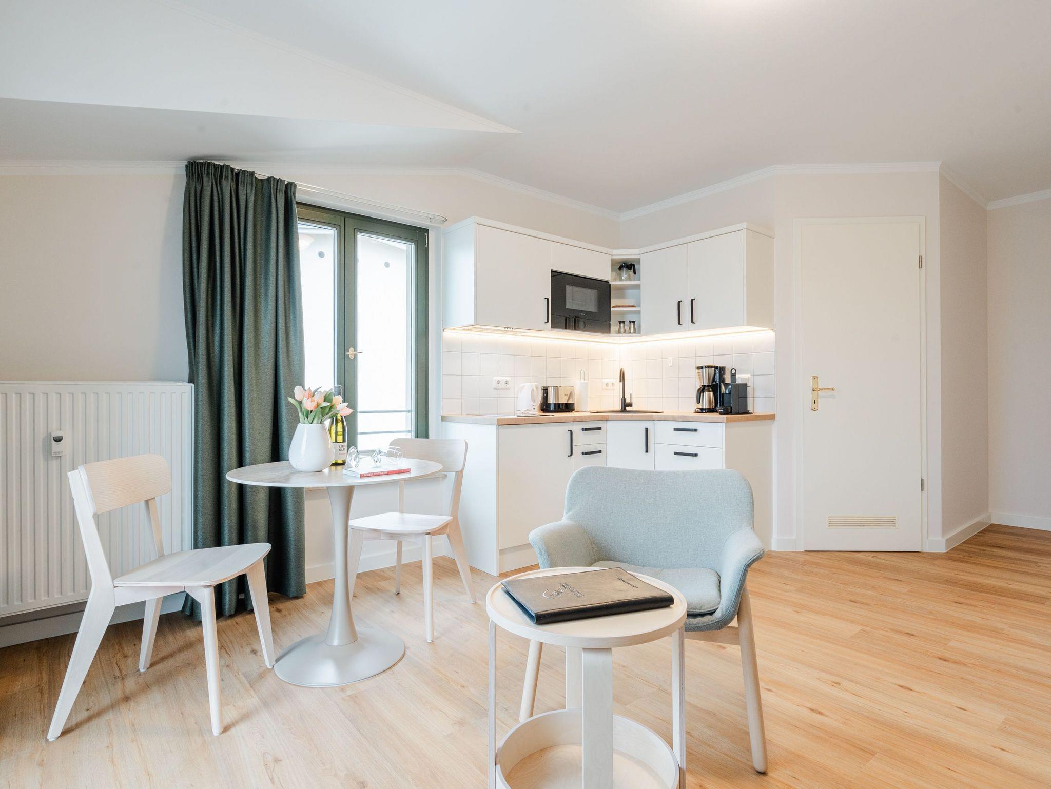 Diese liebevoll und frisch renovierte 1-Raum-Ferienwohnung mit ca. 30 qm im Obergeschoss der charmanten Villa Goodewind ist der ideale Rückzugsort für einen Urlaub allein oder zu zweit. Der offen gestaltete Wohnbereich verbindet Wohnen, Schlafen und Kochen auf harmonische Weise und schafft mit modernen Einbauten eine stilvolle, einladende Atmosphäre für entspannte Urlaubstage. Die moderne, gut ausgestattete Küchenzeile bietet alles für eine entspannte Selbstversorgung. Das hochwertige Boxspringbett sorgt für besonderen Schlafkomfort. Das Badezimmer ist mit Dusche und WC ausgestattet. Ein besonderes Highlight ist der Balkon, auf dem sie den Tag gemeinsam mit einem Frühstück in der Morgensonne beginnen. Kostenfreies WLAN steht Ihnen selbstverständlich zur Verfügung, und ein Parkplatz befindet sich direkt am Haus.