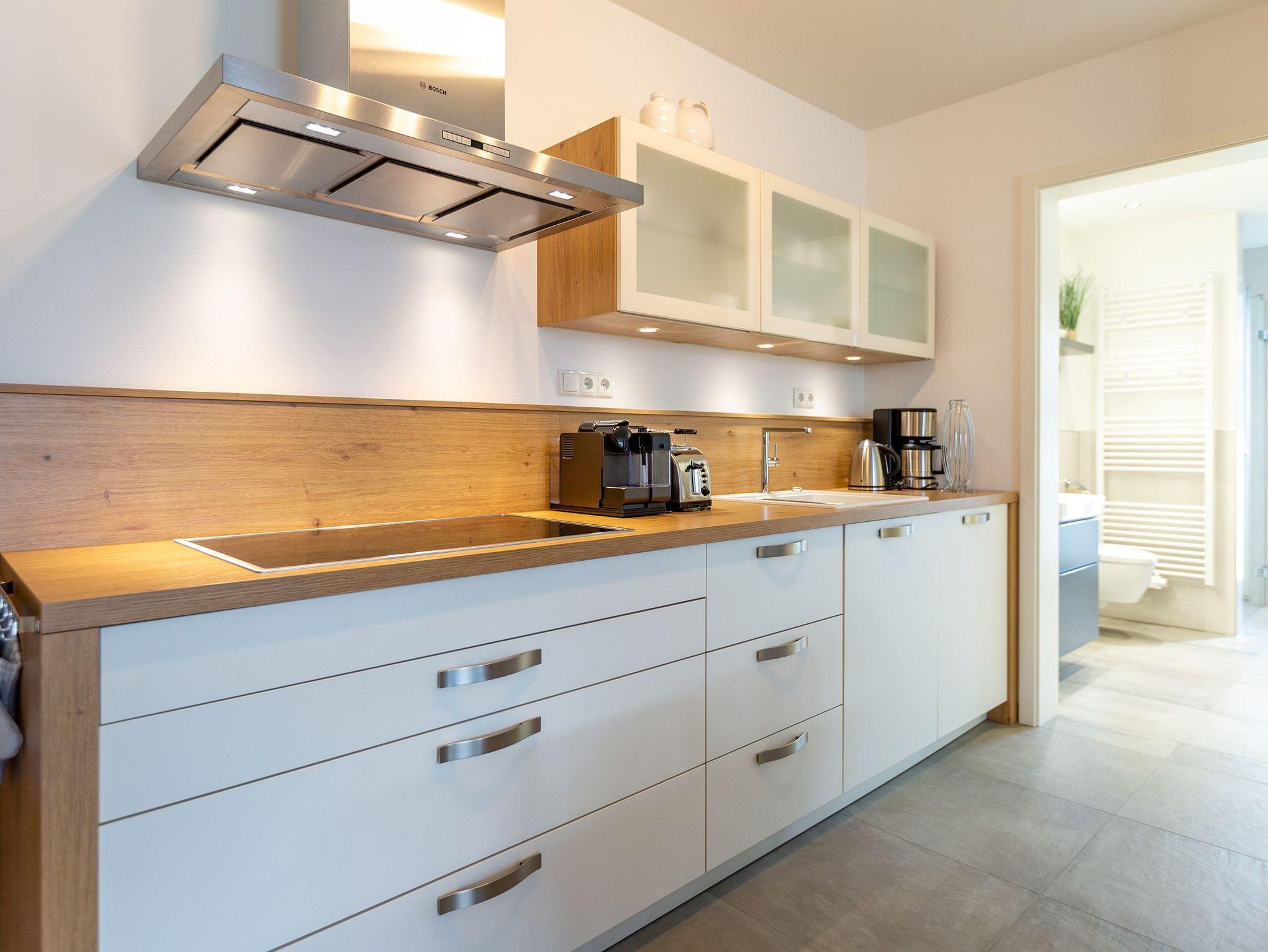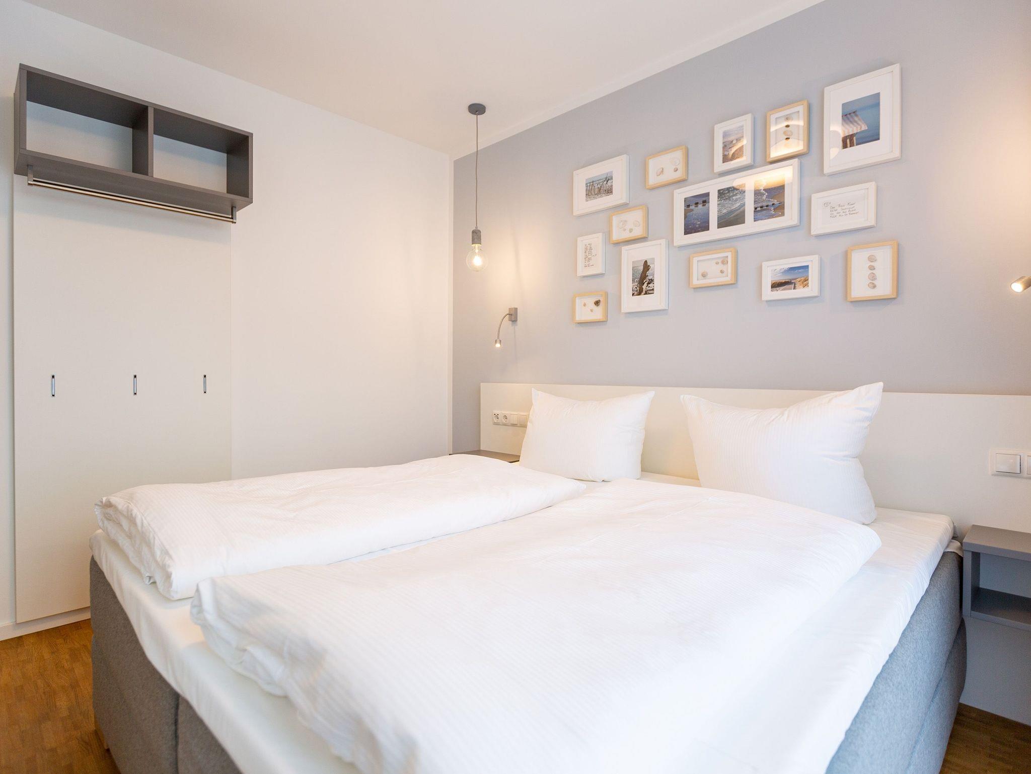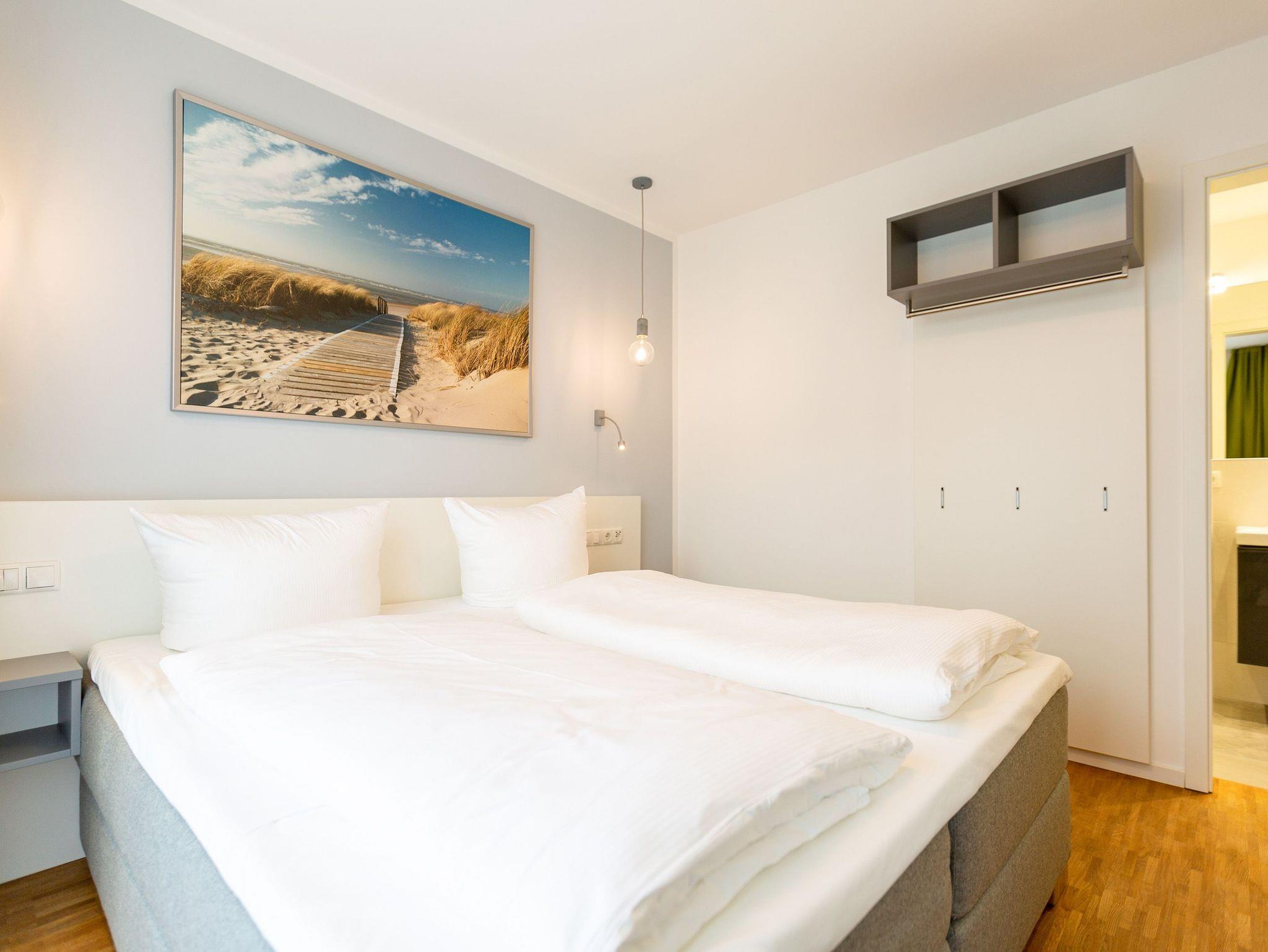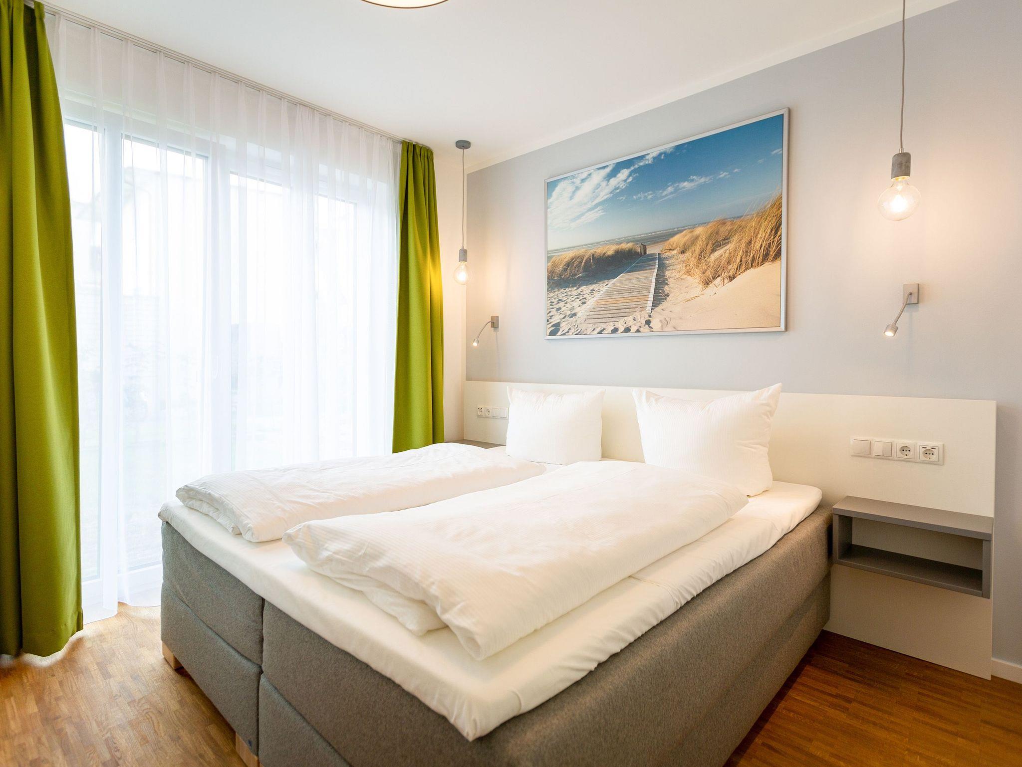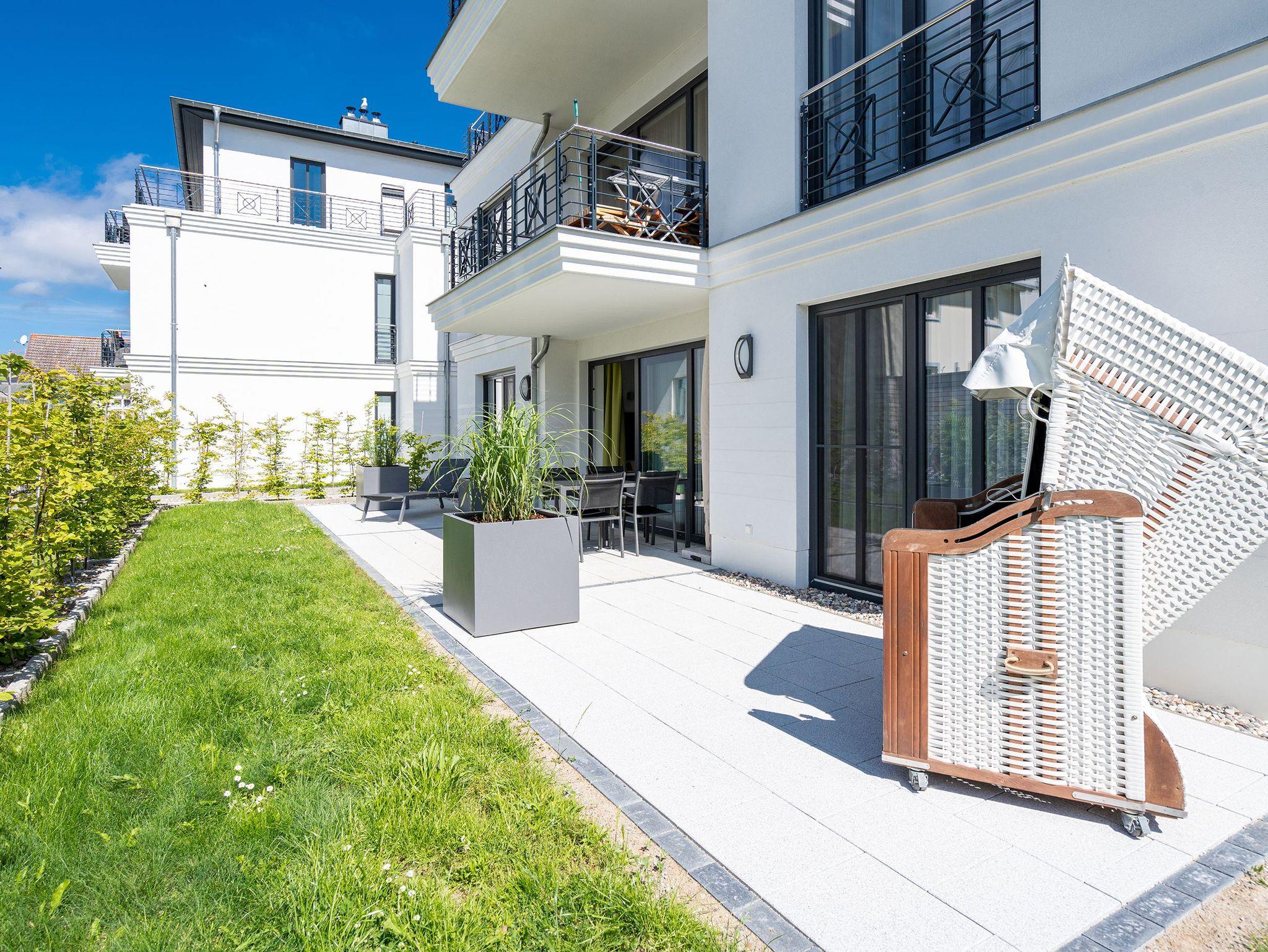 Der Abend senkt sich auf die Insel. Es wird langsam dunkel. In Ihrem Urlaubsdomizil aber wird es kuschelig. Denn im Kamin flackert ein knisterndes Feuer. In diesem Drei-Zimmer-Appartement im Erdgeschoss vom Quartier 7 können es sich bis zu vier Personen gemütlich machen, ausspannen und eine unvergesslich schöne Ostseeauszeit miteinander verbringen. Denn das Rauschen der Wellen ist nur ein paar Gehminuten entfernt. Auf den 68 Quadratmetern finden Sie reichlich Platz, um Zeit für sich und Zeit gemeinsam zu verbringen. Das großzügige, moderne Wohnzimmer mit echtem Holzkamin, Flat-TV und einer gemütlichen Sofalandschaft lädt zum Entspannen und Verweilen ein. Ob Ledersofa oder stylishe Design-Ledersessel ? der Inneneinrichter hatte ein feines Gespür für das gewisse Urlaubsgefühl. Die zum Wohnzimmer hin offene Küche ist voll ausgestattet. Hochwertige Markengeräte wie Herd, Cerankochfeld, Mikrowelle, Geschirrspüler oder Kaffeemaschine gehören ebenso zur Ausstattung wie erlesenes Geschirr. Ein schöner Essplatz lädt zum Verweilen und Genießen ein. Bei schönem Wetter können Sie das Essen aber auch draußen auf der Süd-West-Terrasse (13 Quadratmeter) zu sich nehmen. Sonnenüberflutet eignet sie sich auch bestens zum Sonnenbaden. Das Appartement besitzt zwei Schlafzimmer mit je einem bequemen Boxspringdoppelbett (1,80 m x 2,00 m), einem extra dafür angefertigten Einbauschrank und einem Flat-TV. Kuscheln und träumen werden hier zu Ihren Lieblingsbeschäftigungen. Die Betten sind bei Anreise bezogen. Ebenfalls in doppelter Ausführung ist das Bad mit Dusche, WC und Waschtisch vorhanden. Handtücher liegen bereit. Eines der beiden Bäder können Sie als kleine Wellness-Oase nutzen. Denn es verfügt über eine eigene finnische Sauna. Zur Ferienwohnung gehört in der Tiefagarage ein Pkw-Stellplatz. Das WLAN können Sie kostenfrei nutzen.