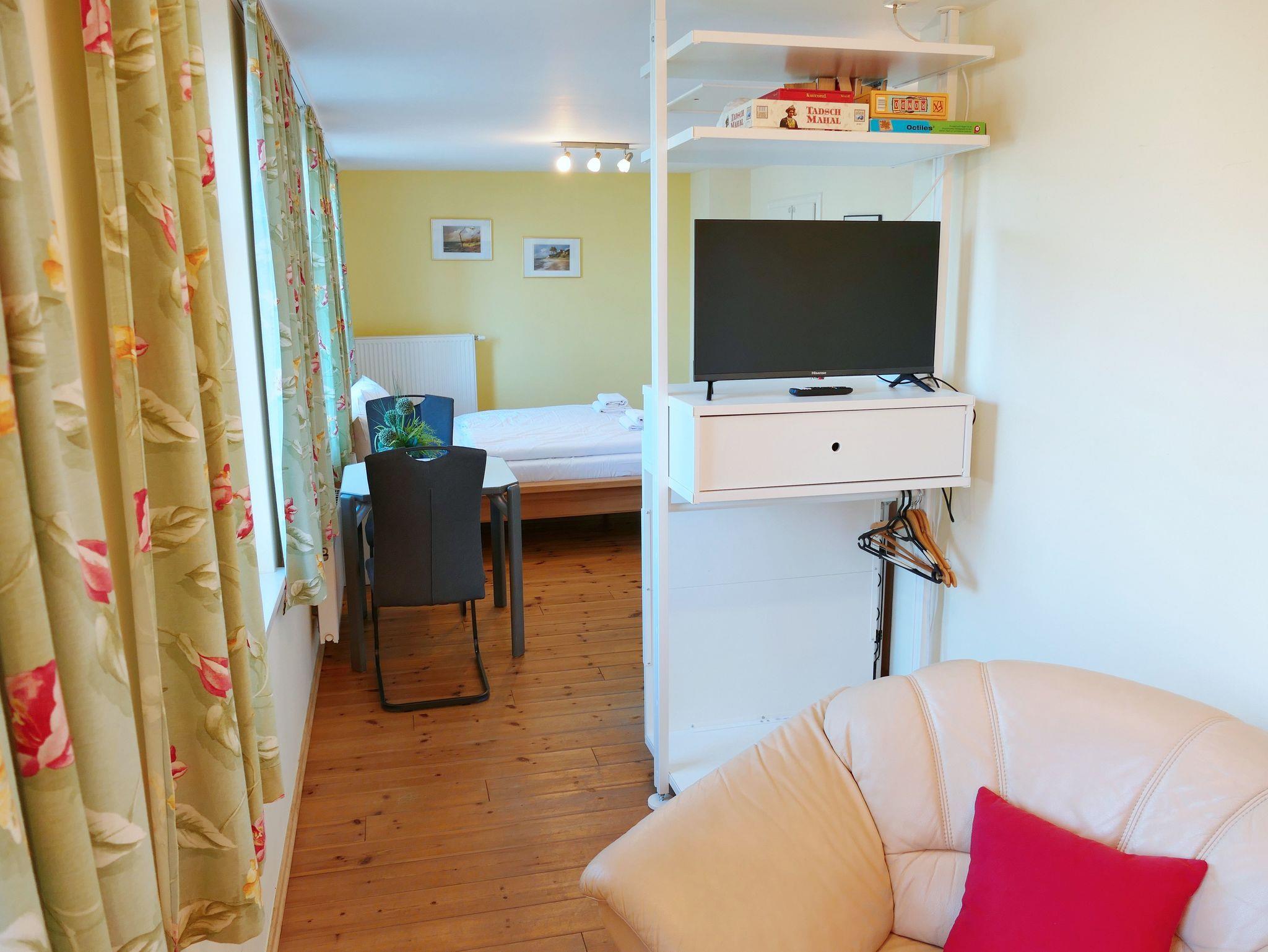Die 40 qm große Ferienwohnung mit separatem Zugang befindet sich in der ersten Etage. Sie verfügt über einen offenen Wohn- Schlafbereich (mit Doppelbett), der optisch durch die kleine Küchenzeile (Pantry-Küche) getrennt wird.