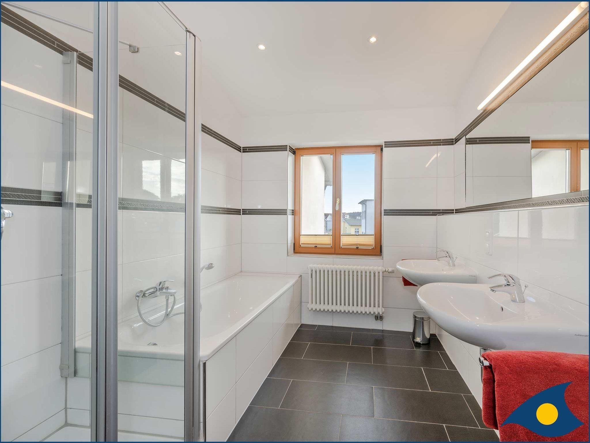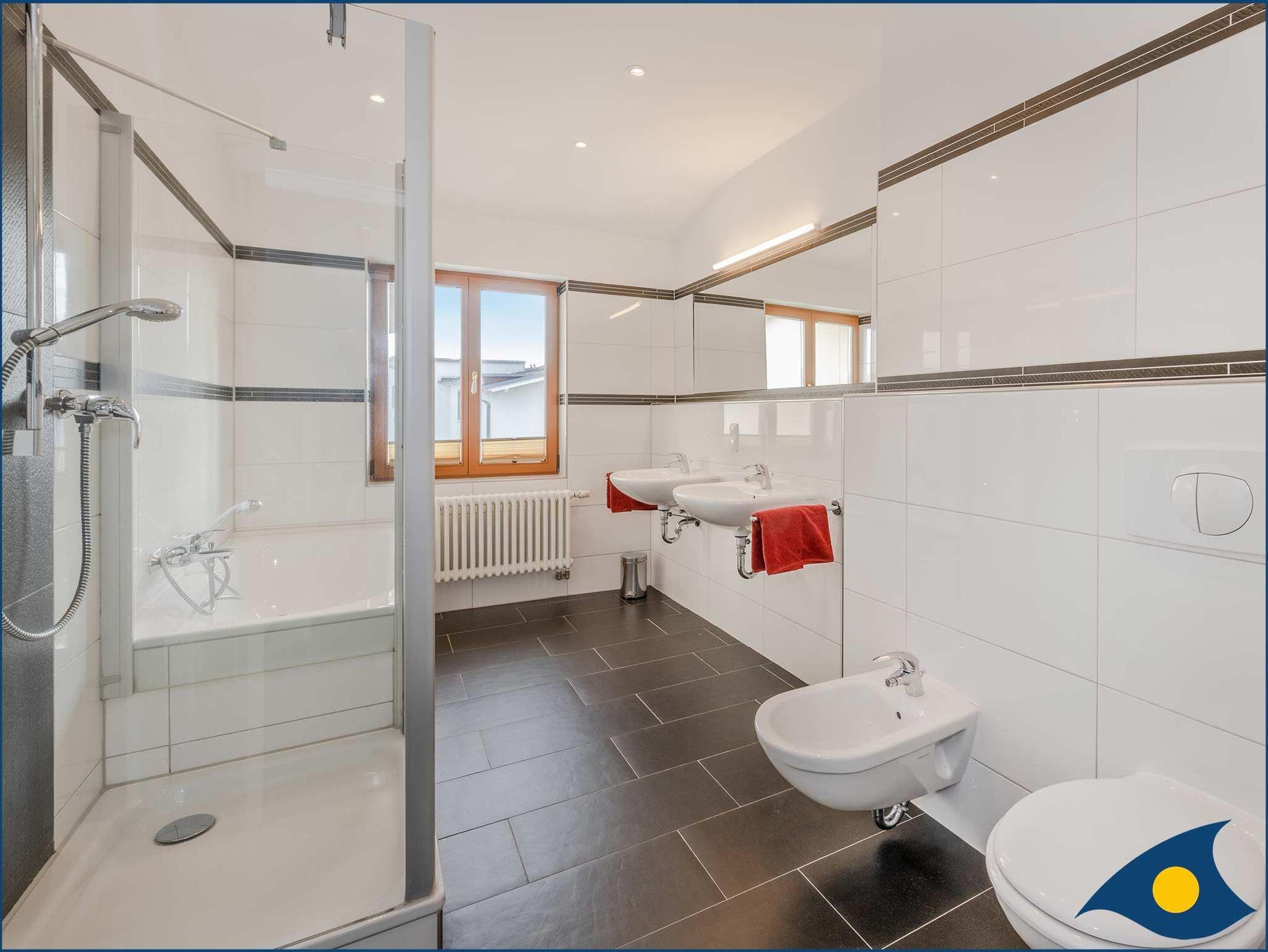 Das Tageslicht-Badezimmer überzeugt mit Badewanne und Dusche sowie zwei Waschbecken und Bidet.