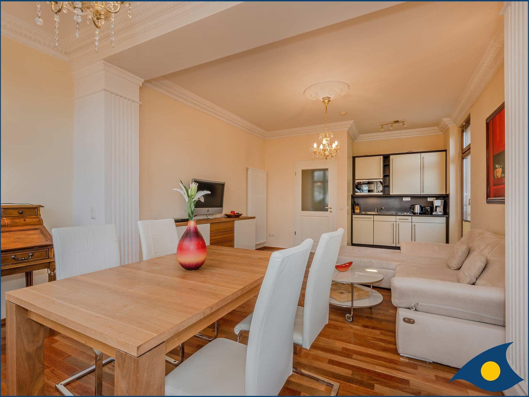 Die helle Wohnung verfügt über einen großzügigen Wohn-/Essbereich mit Zugang zur Terrasse, auf der Sie gemütlich dem bunten Treiben auf der Promenade zuschauen können. Die Aufbettung der 3. Person findet auf der Schlafcouch Platz. Die offene Küche ist mit einer Spülmaschine, einer Mikrowelle, einem 2 Platten-Ceranfeld und Kühlschrank ausgestattet.